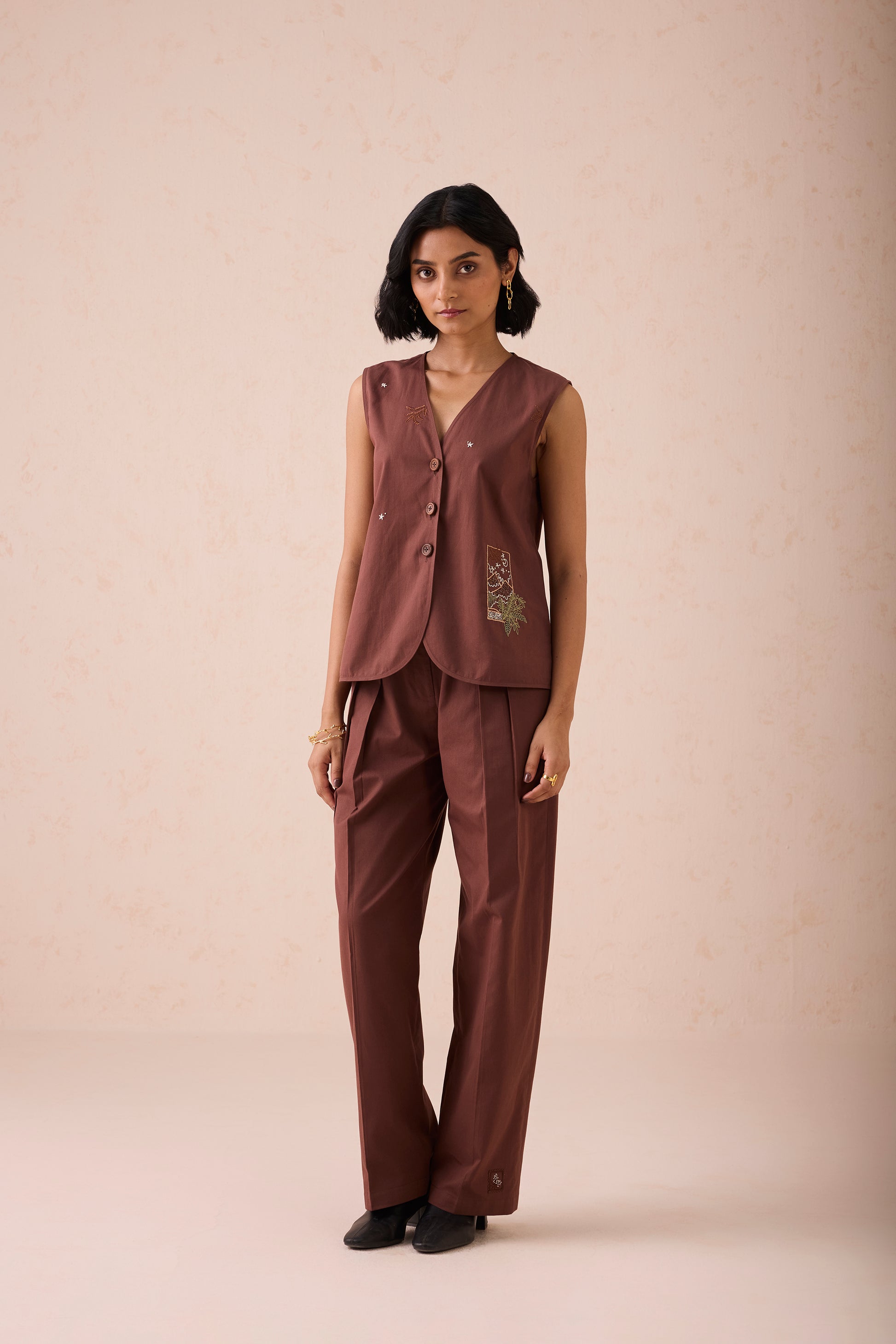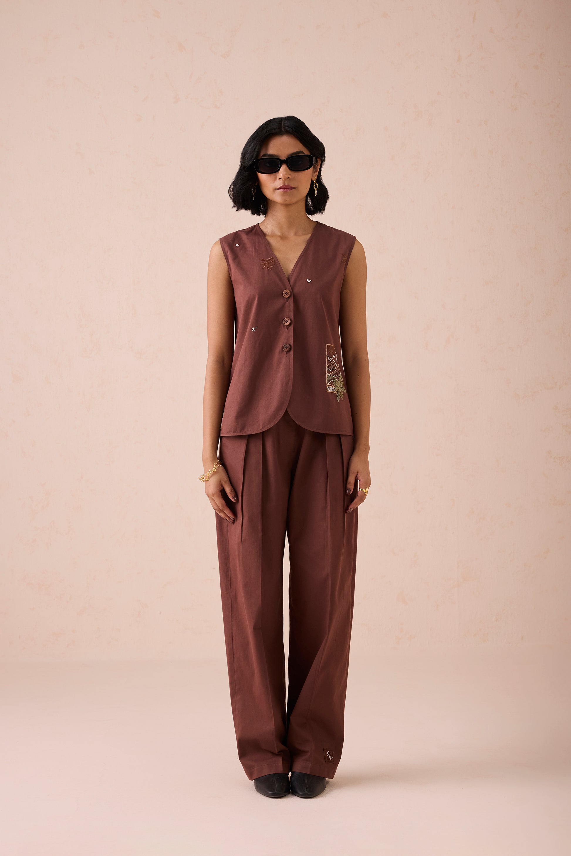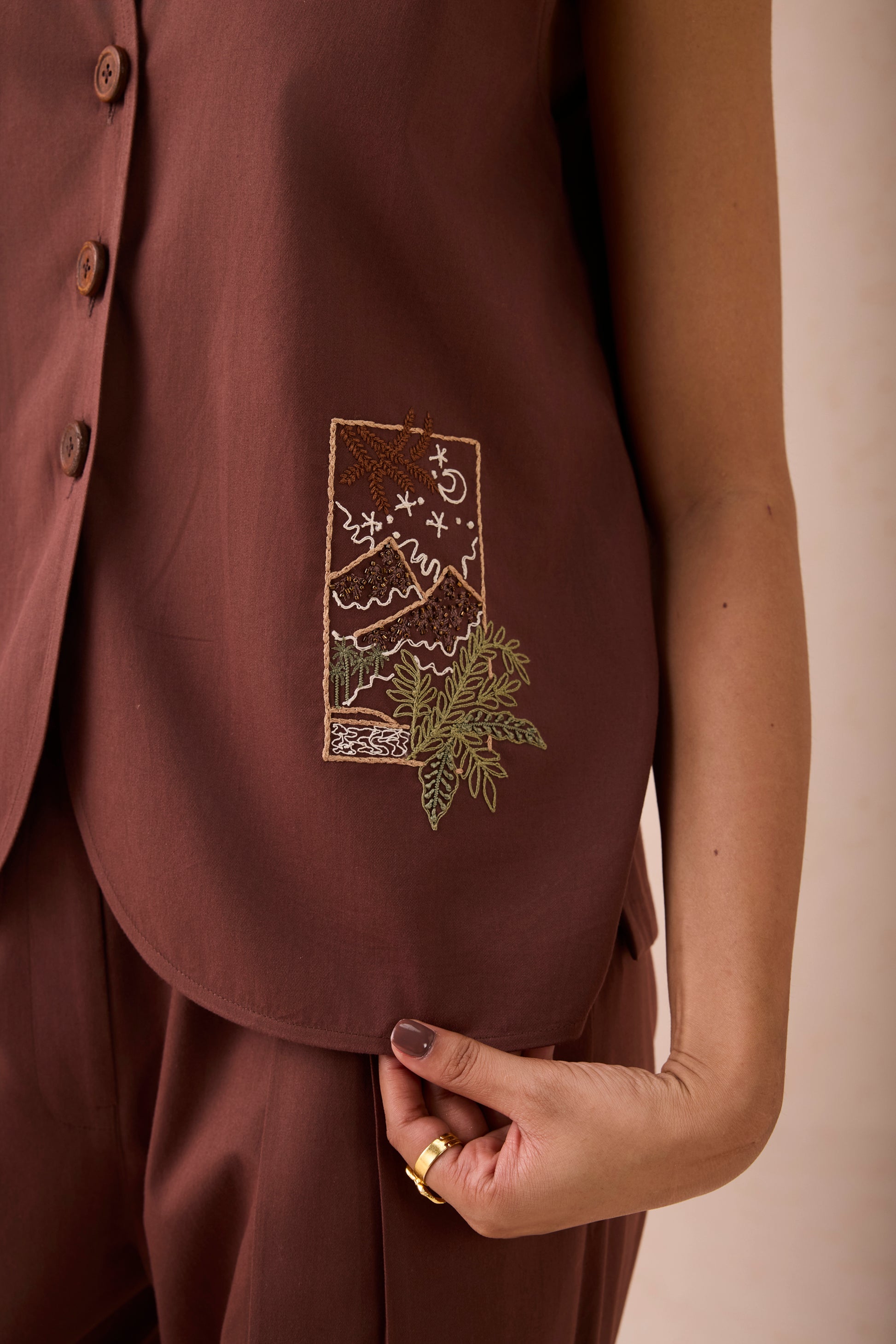 Regular fit, v-neck sleeveless, waistcoat top that buttons at the front, crafted in azo-free dyed organic cotton twill fabric, machine and hand embroidered with message and mountain motifs.
