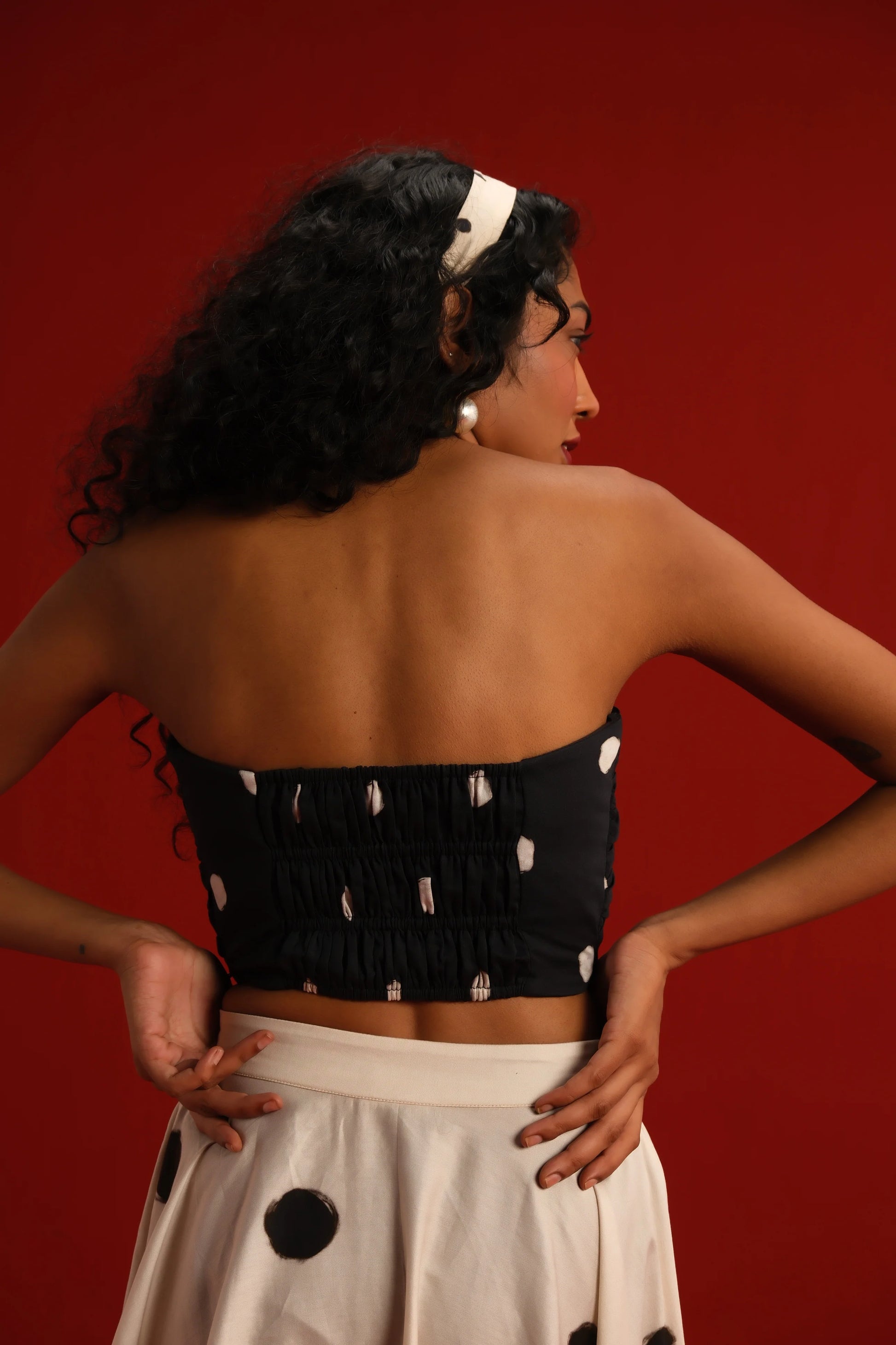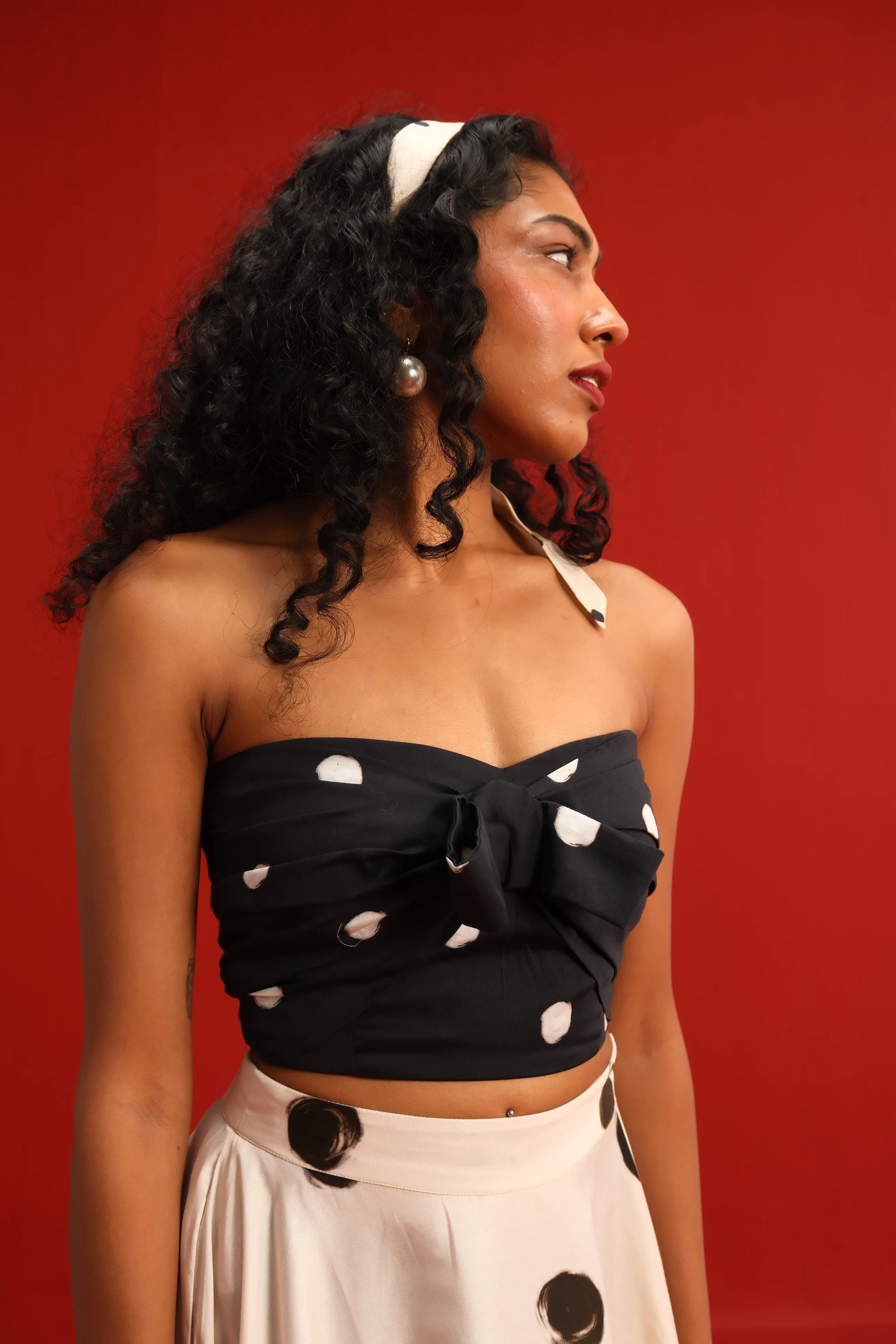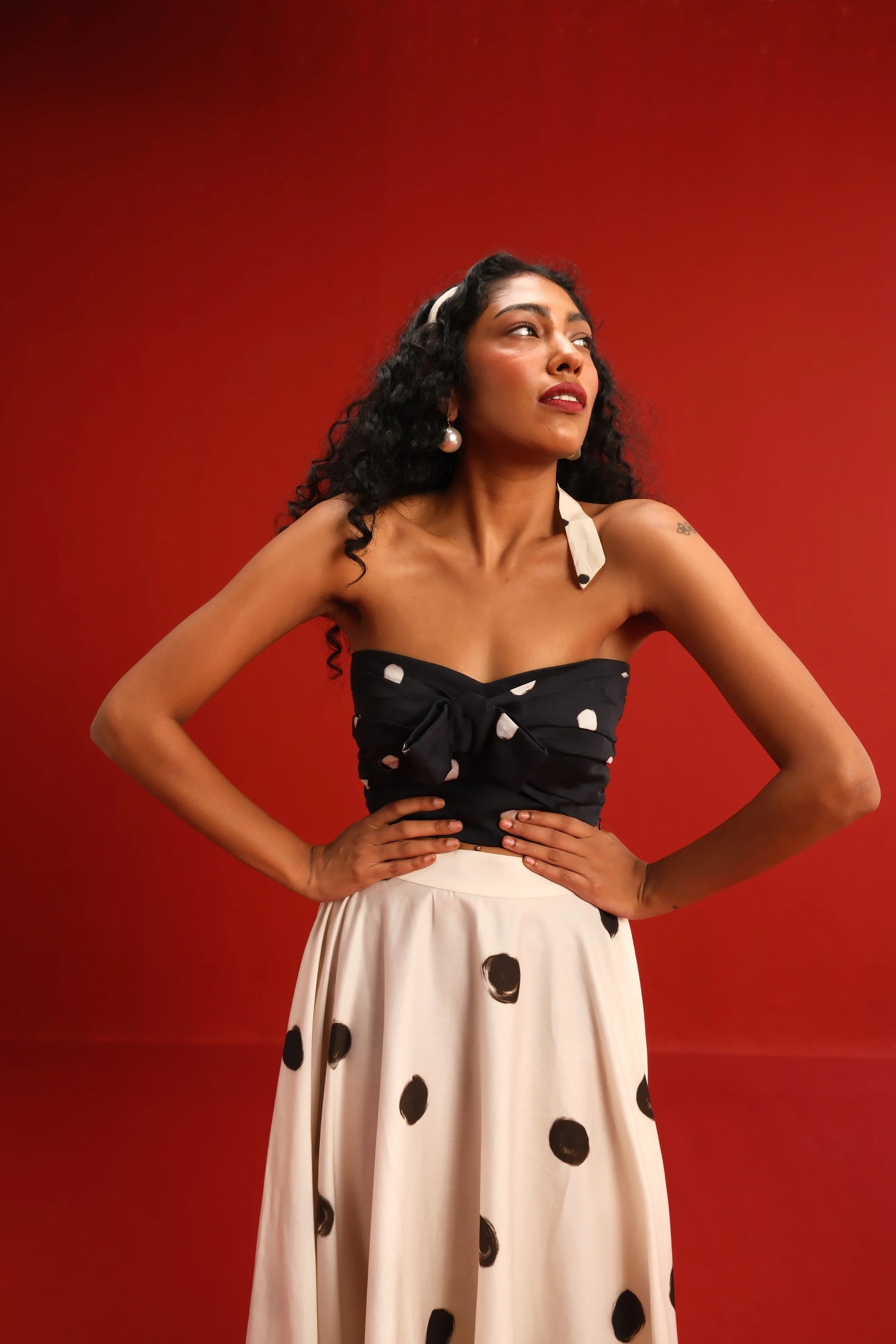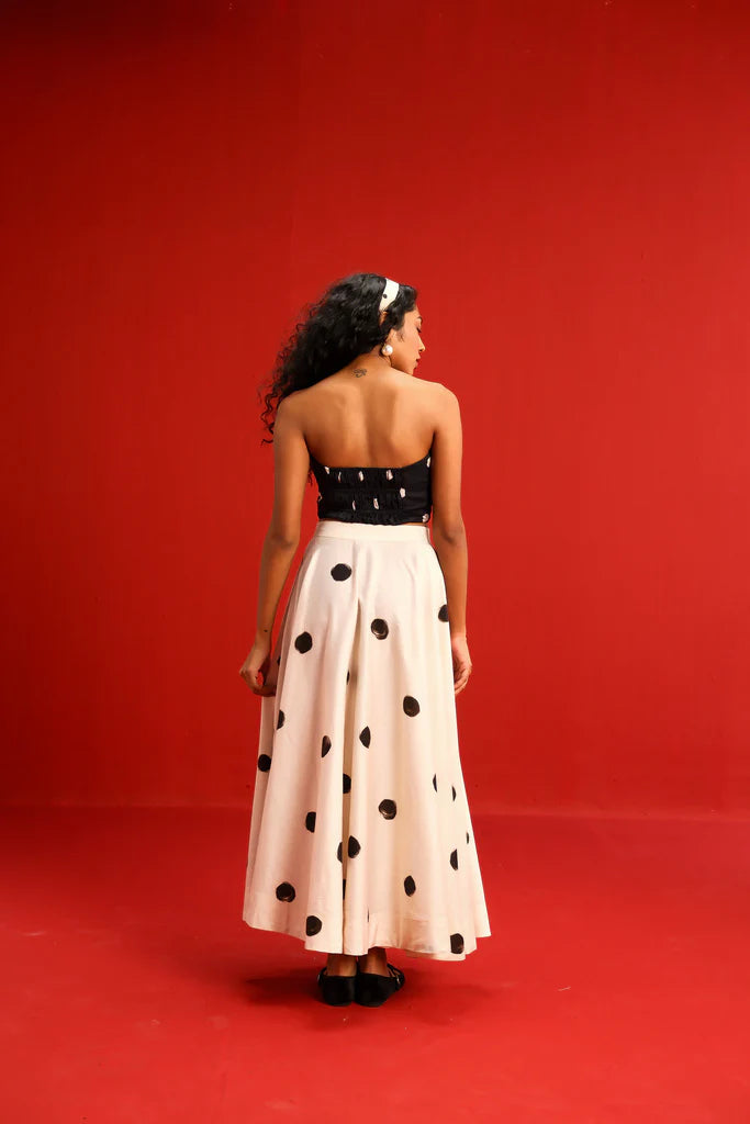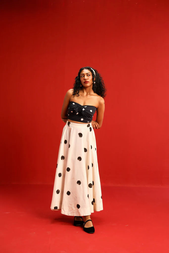 Featuring a strapless knotted bandeau top in black with a bow in front and scattered blush polka dots, paired effortlessly with a high-waisted ivory skirt adorned with oversized contrasting black polka dots, this set balances retro charm with modern silhouette. The soft, flowy fabric ensures a flattering drape and ease of movement, while the mix-and-match polka motif adds a youthful flair to your wardrobe.