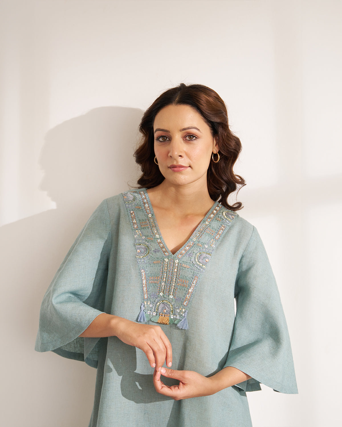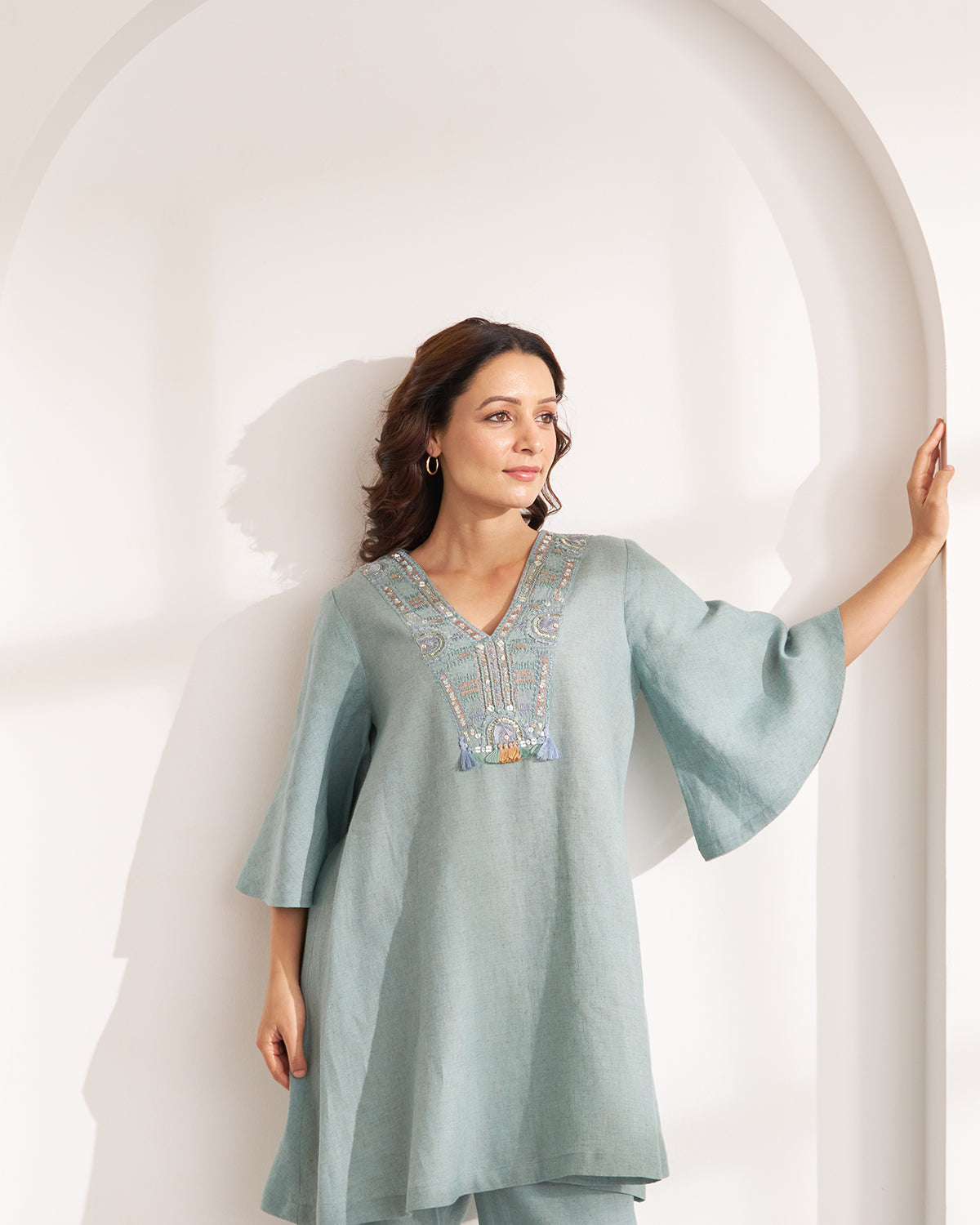 Flowy, effortless, and made from the finest pure hemp, this set brings the ease of India's sunlit coastlines to your wardrobe. The soft sea-greenish blue hue mirrors the tranquil waters of hidden lagoons, where time slows down and the air is filled with a quiet, sunlit warmth. The fabric drapes beautifully, with a natural texture that adds depth and movement. Billowing sleeves add a breezy touch, while the delicate handwork in complementary pastel tones brings a refined elegance. A perfect blend of boho and sophistication, this set is your go-to for laid-back days that flow seamlessly into balmy evenings.