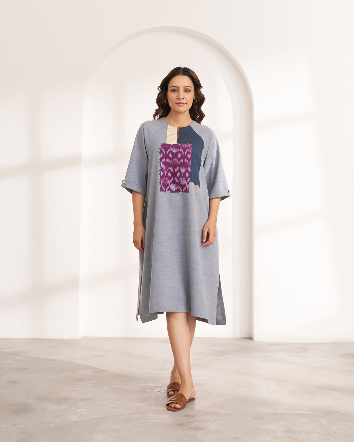 Crafted from soft two-toned handwoven cotton, it blends serene blue with warm beige undertones. Pops of deep navy and handwoven purple Ikat add a striking contrast to its simple, relaxed silhouette. Breezy, effortless, and light as air—just what you need on warm, sun-drenched days.