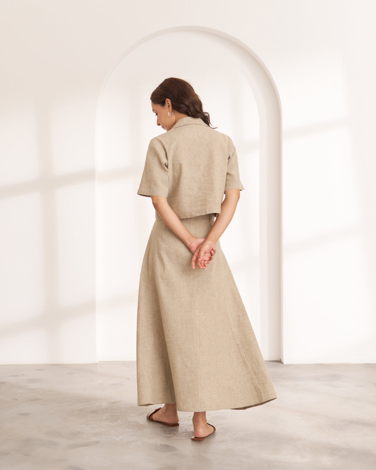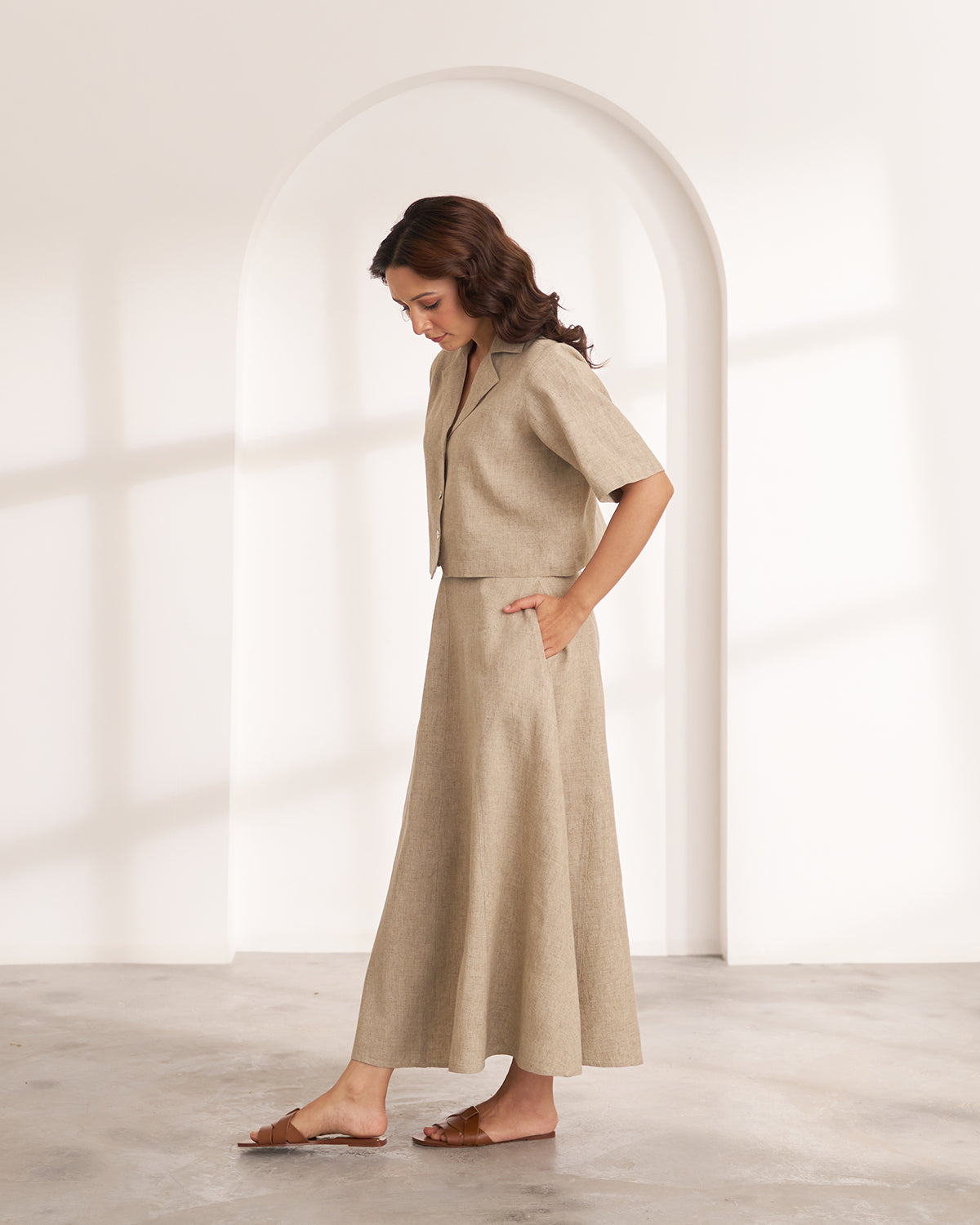 The Sand Beige Hemp Skirt is the epitome of quiet luxury—timeless, refined, and effortlessly chic. Crafted in pure hemp, its fluid A-line silhouette is cut on the bias, allowing for a graceful fall and an incredibly flattering fit. The fabric’s natural texture adds depth, making it a wardrobe staple that feels as good as it looks.