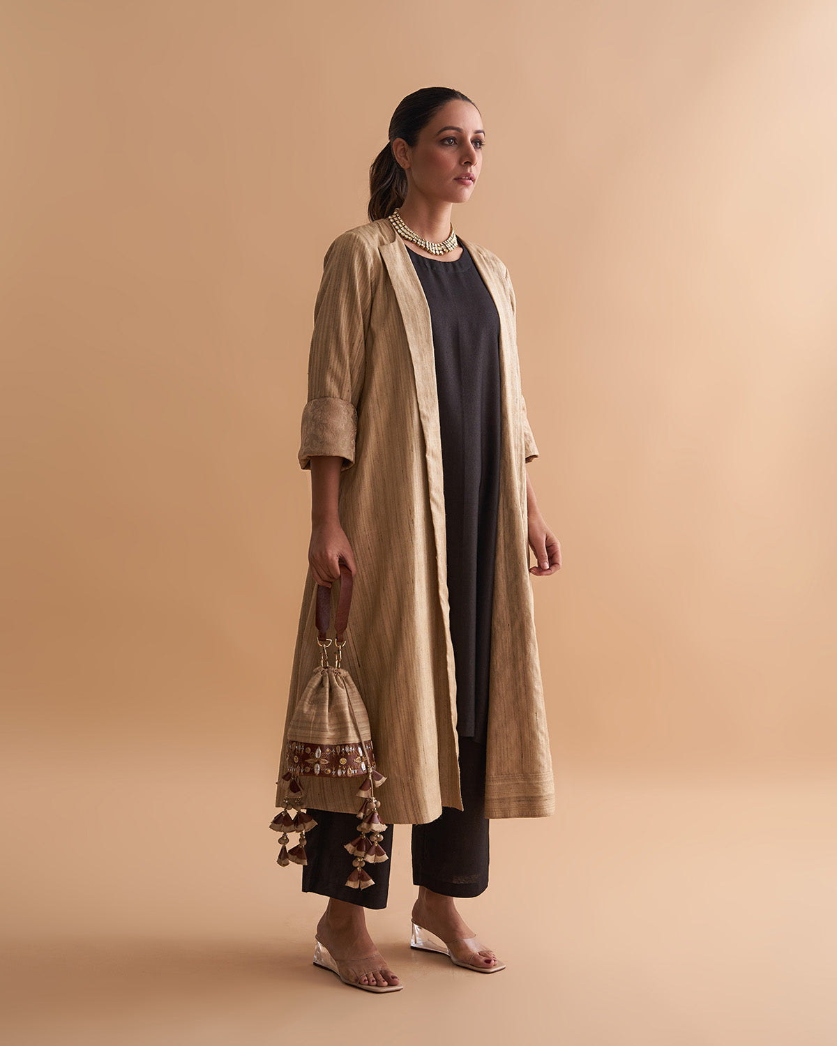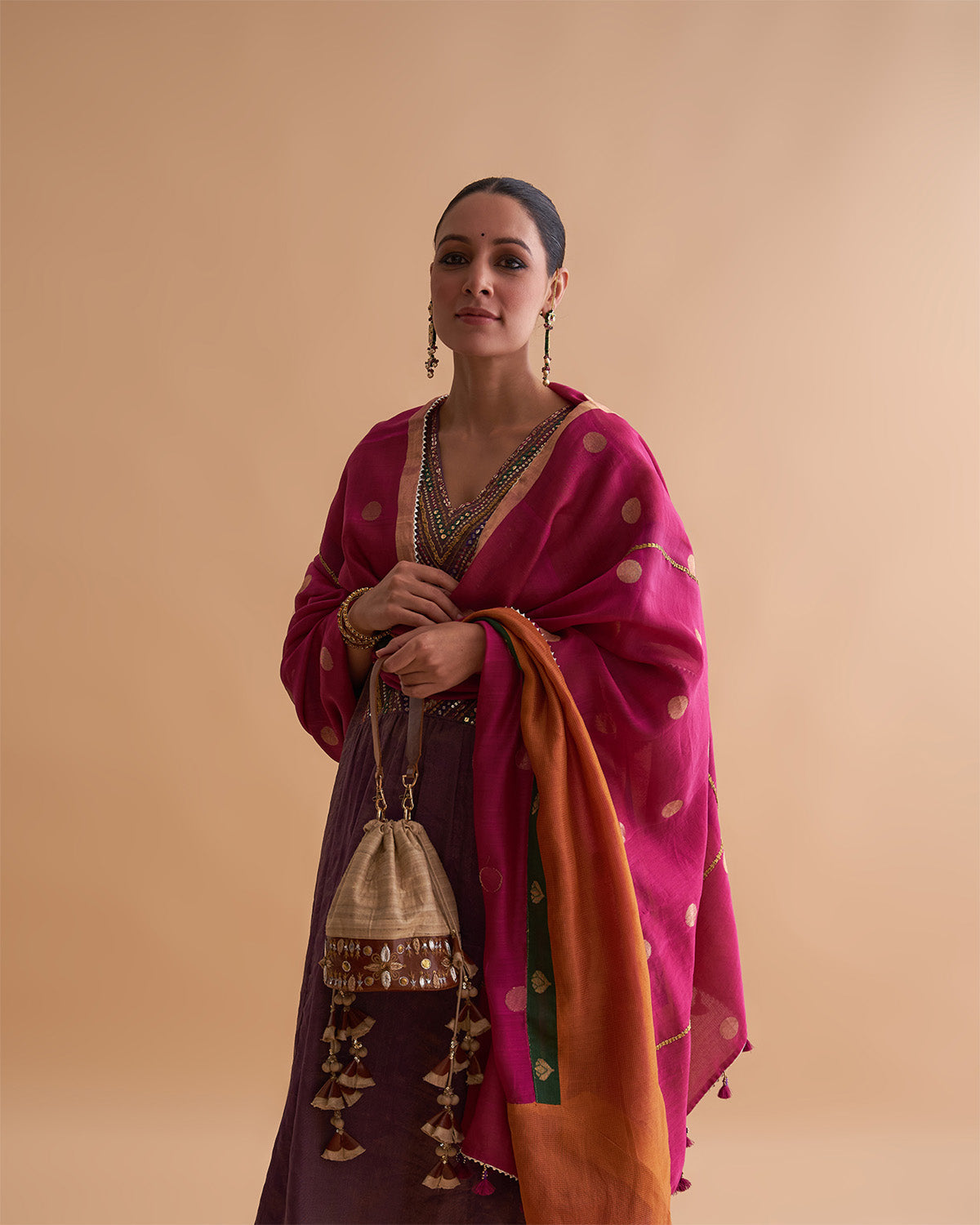 The Veda Potli Bag - Beige Kosa Silk & Leather with Zardozi & Handmade Tassel Bunches