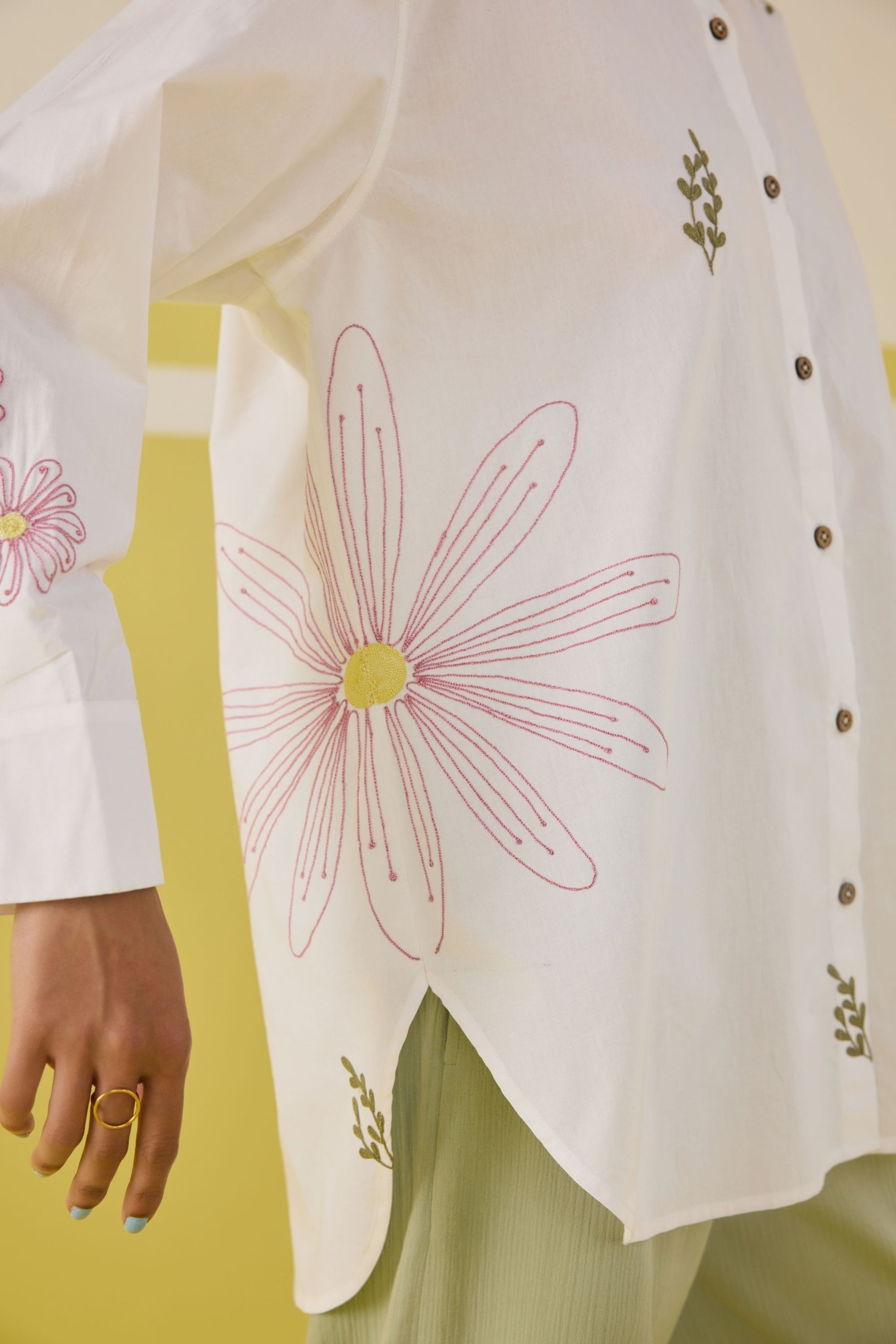 Regular fit, full sleeve, classic shirt that buttons in the front crafted in organic cotton poplin fabric, machine embroidered with flower and leaf motifs.