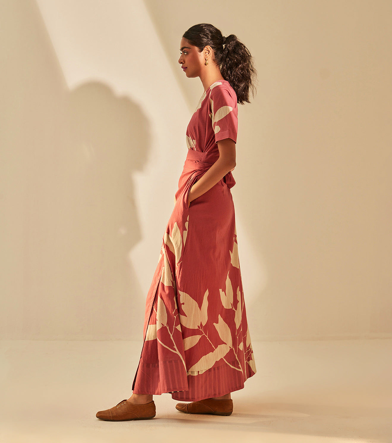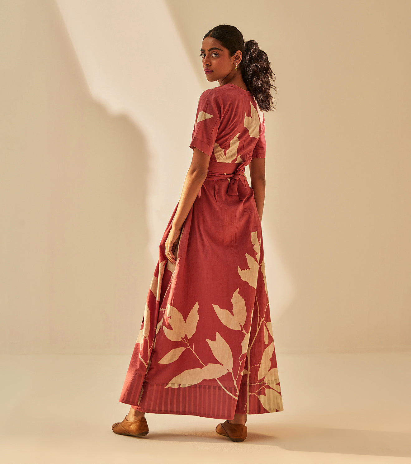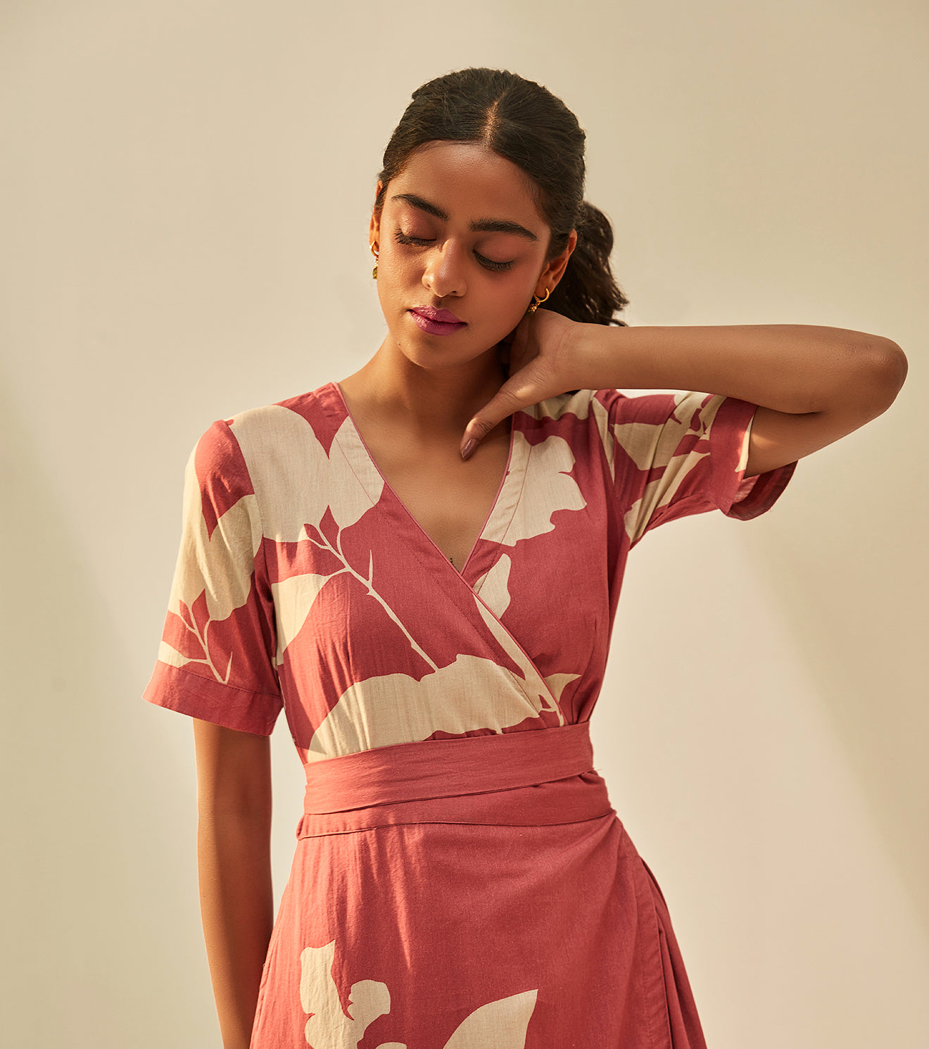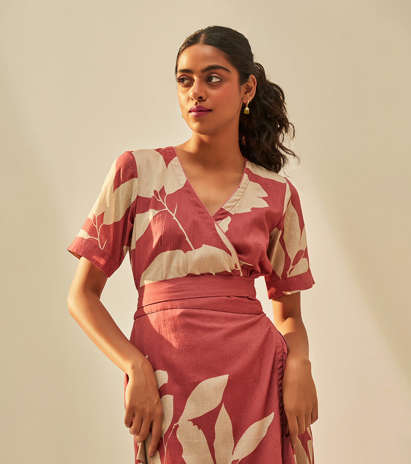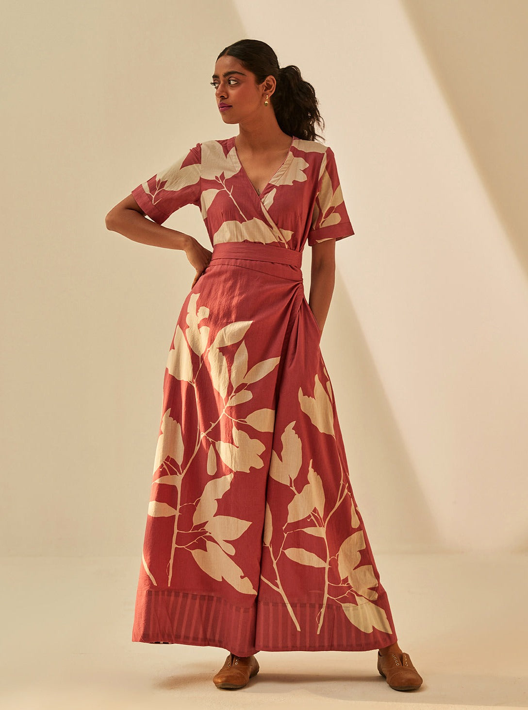 A study in grace and elegance, This wrap dress brings with it a feminine charm. crafted in soft cotton mul. Handcrafted in India. Side seam pockets. Fully lined.