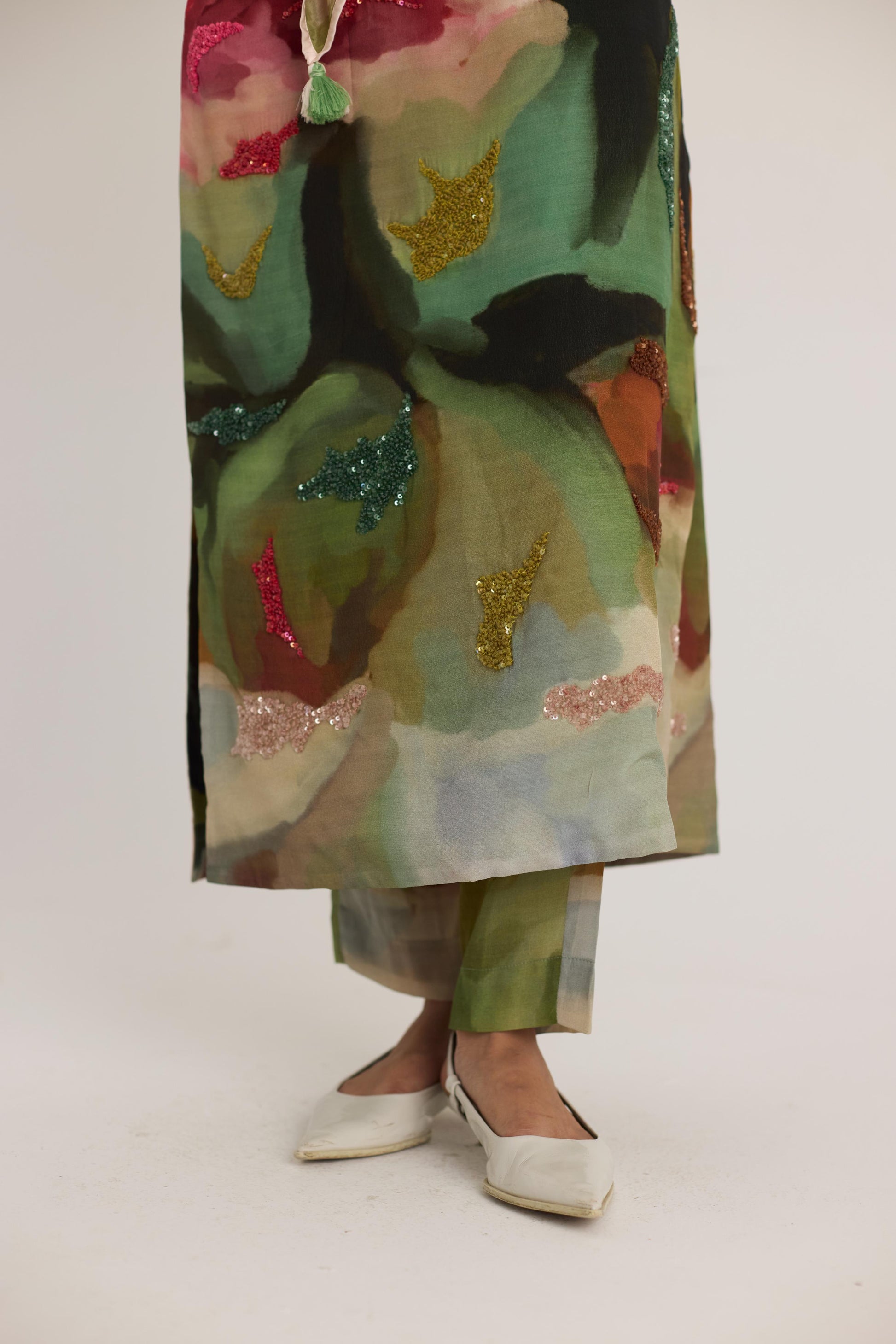 A sophisticated and artistic ensemble, this V-neck kaftan features an ethereal hand-painted floral print with oversized blooming roses in rich hues of deep red, blush pink, and earthy green. The abstract watercolor-like design gives it a dreamy and elegant appeal.