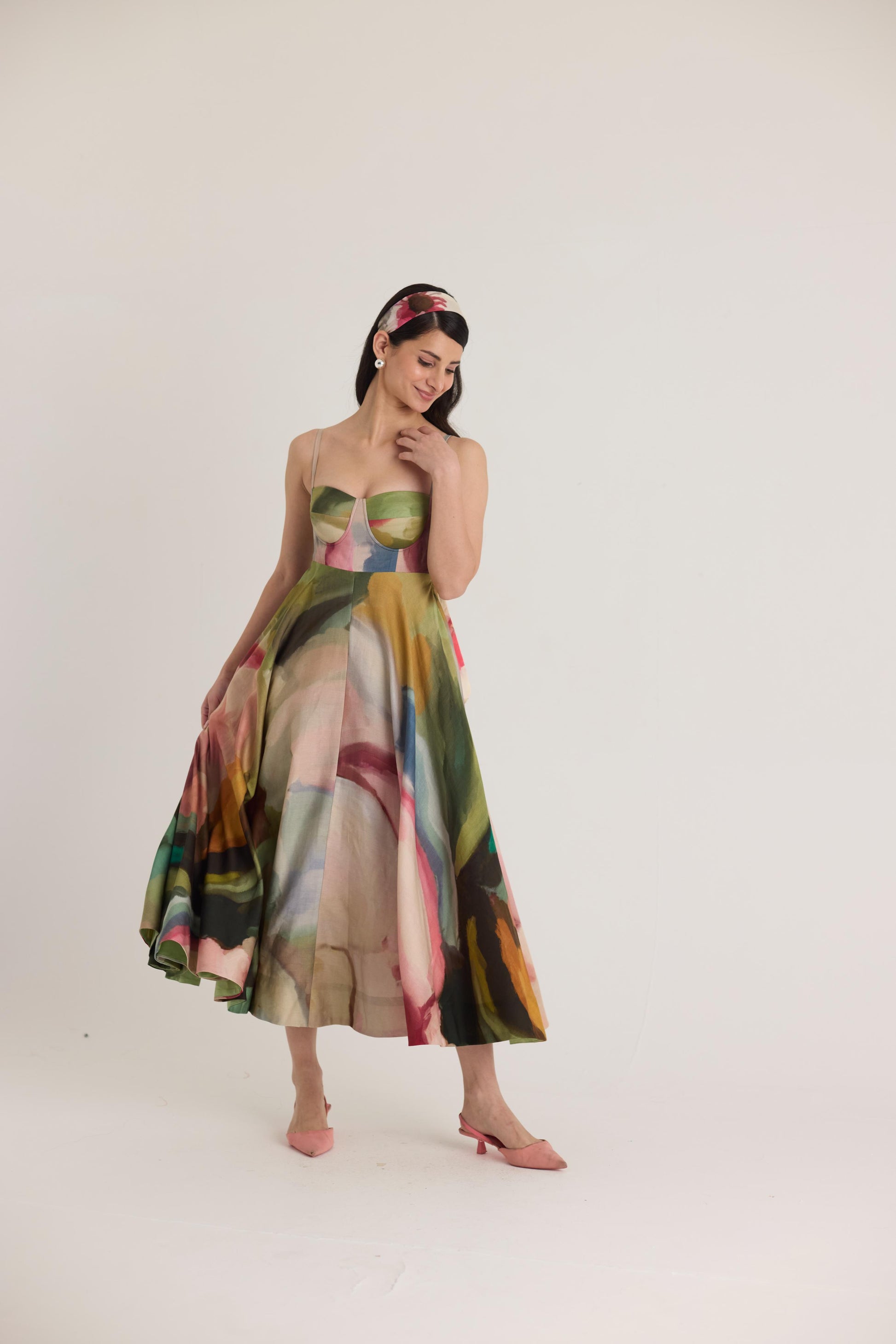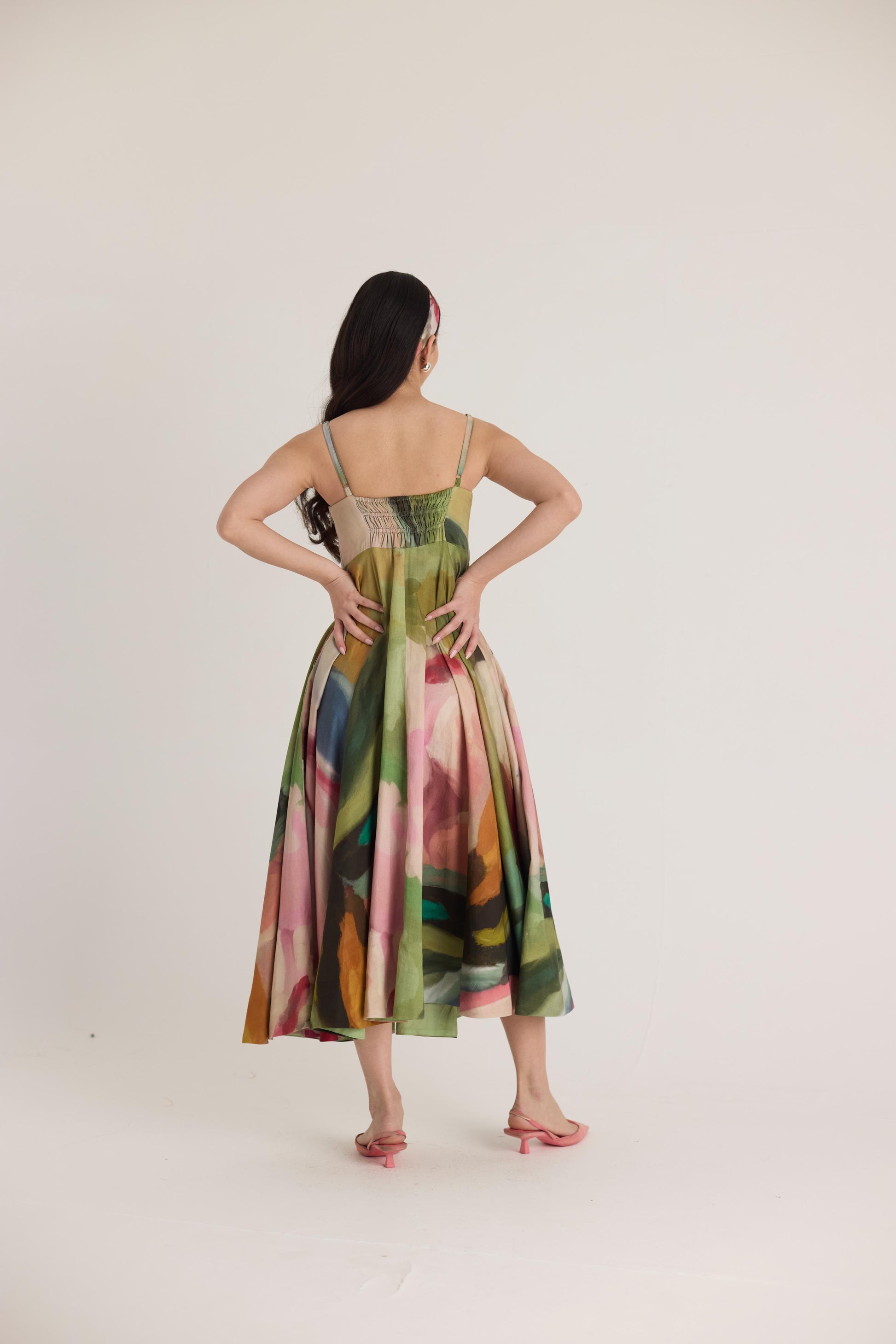 The dress showcases a breathtaking watercolor-inspired print, blending vibrant hues of green, pink, blue, and hints of ochre. The artistic brushstroke effect mimics a hand-painted floral canvas, exuding a dreamy, romantic aesthetic.