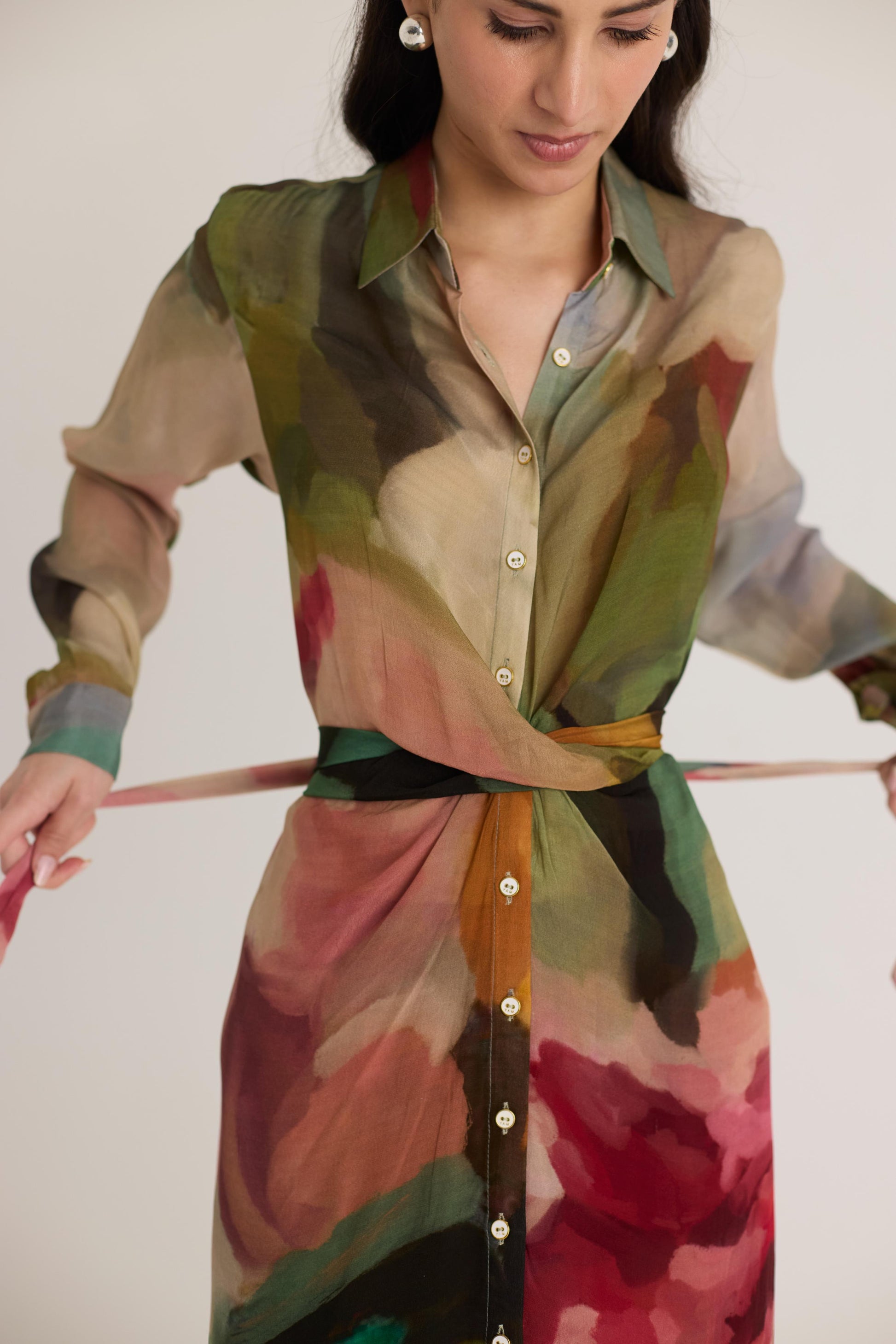 A breezy and elegant long shirt dress with a matching pair of flowy trousers, featuring an exquisite watercolor-inspired print. The dress has a button-down front, a classic collar, and a removable fabric belt that allows for a customizable fit. The trousers complement the dress with a relaxed silhouette, making the ensemble perfect for effortless sophistication.