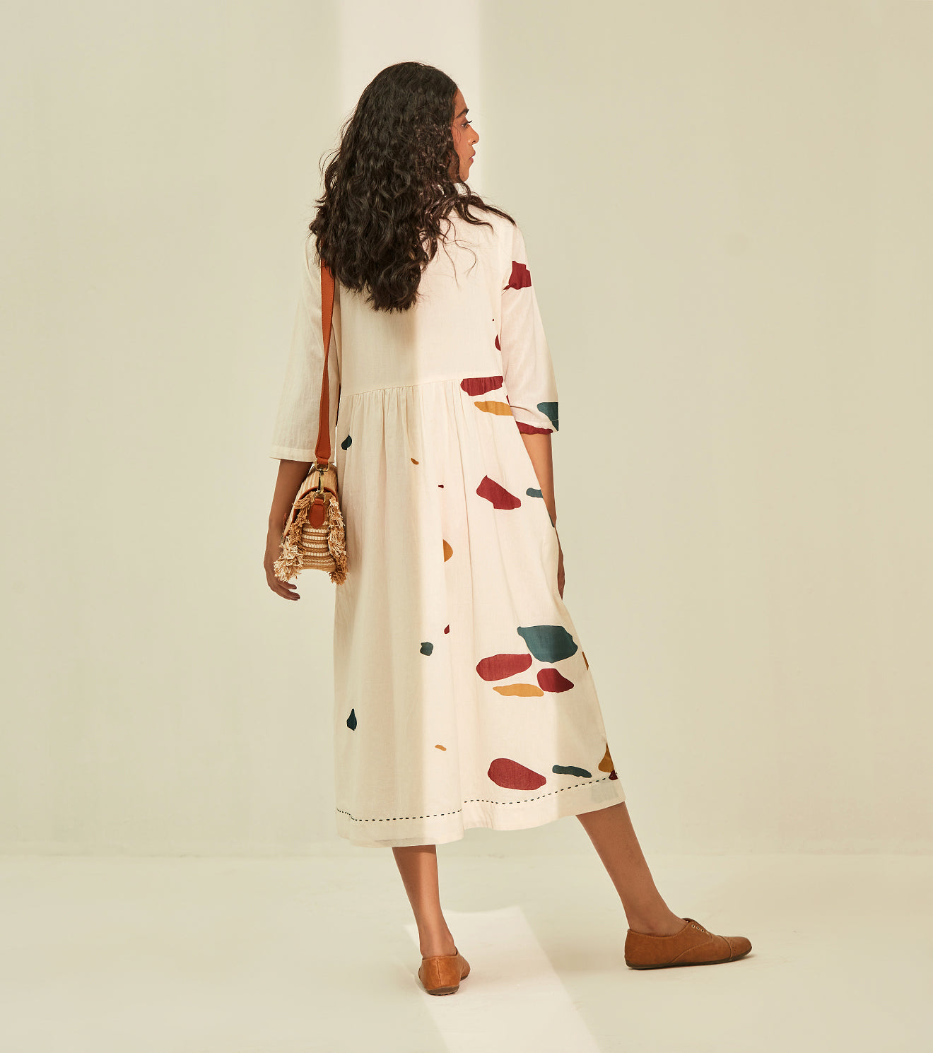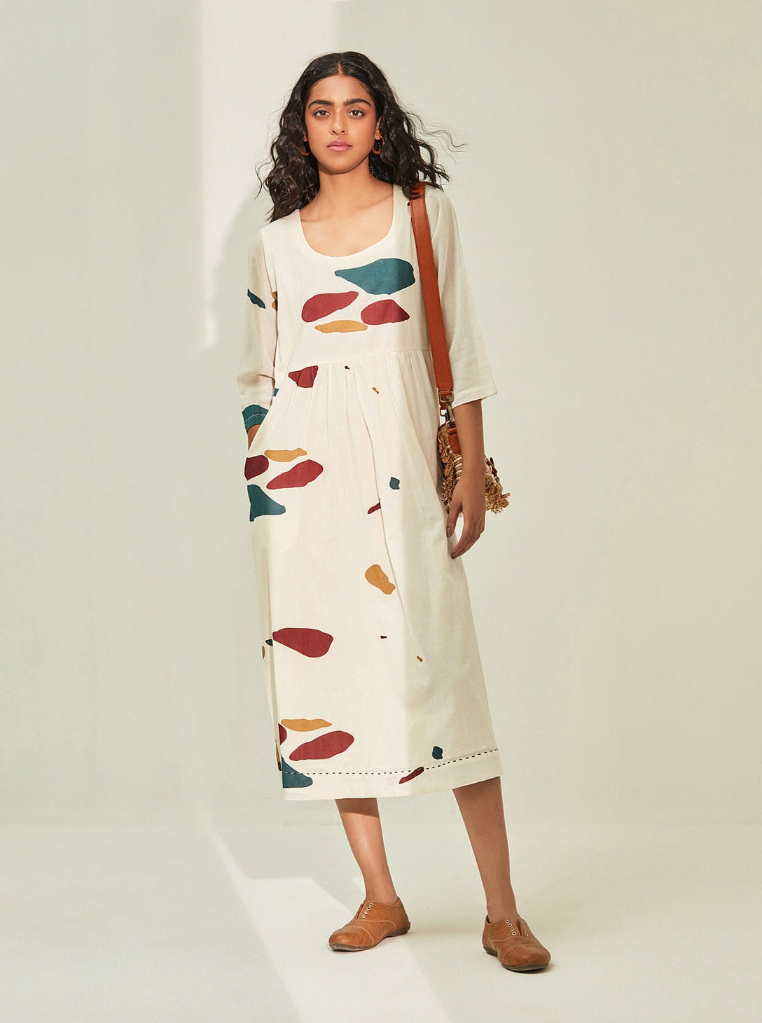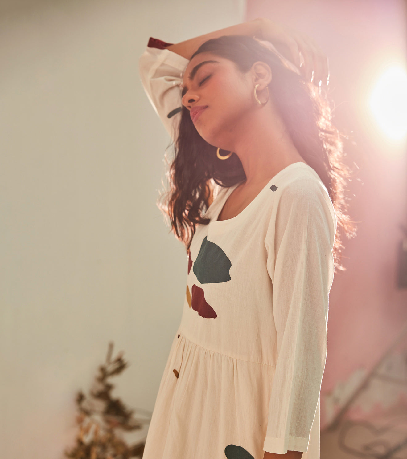 Artistic flair and everyday ease find home in our Timeless Romance midi dress. featuring the classic mosiac print on off white. Crafted in soft cotton mul Handcrafted in India. Side seam pockets. Fully lined.