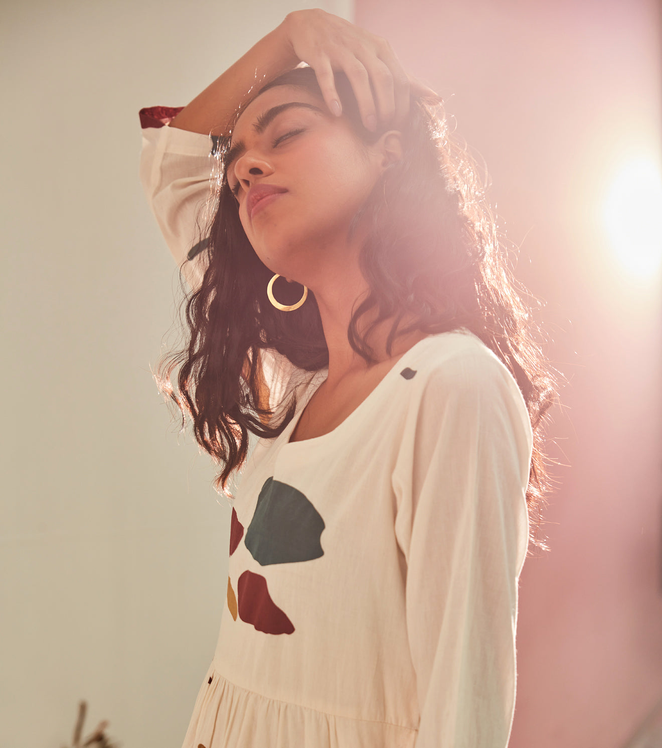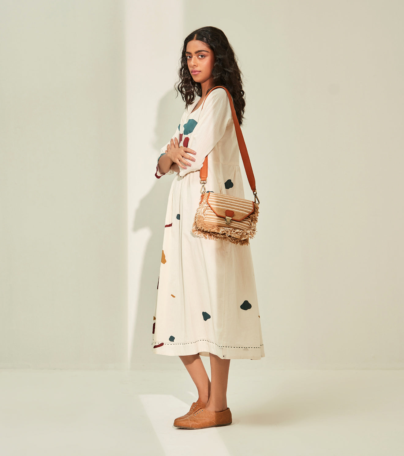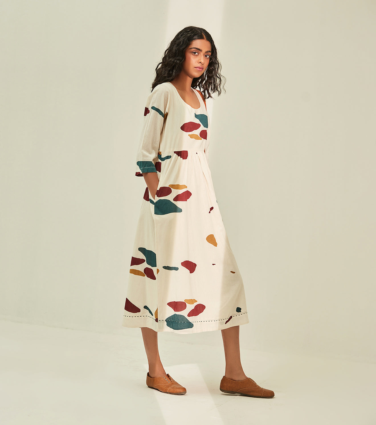Artistic flair and everyday ease find home in our Timeless Romance midi dress. featuring the classic mosiac print on off white. Crafted in soft cotton mul Handcrafted in India. Side seam pockets. Fully lined.