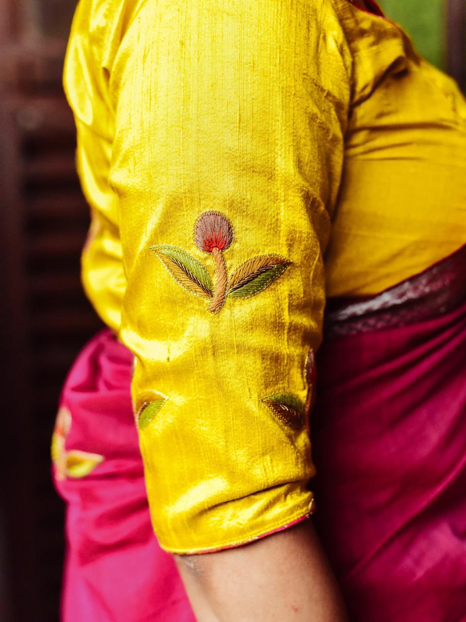 On yellow silk, Tiya Pakhi and Flowers are hand embroidered delicately. The brocade collars add to the drama.