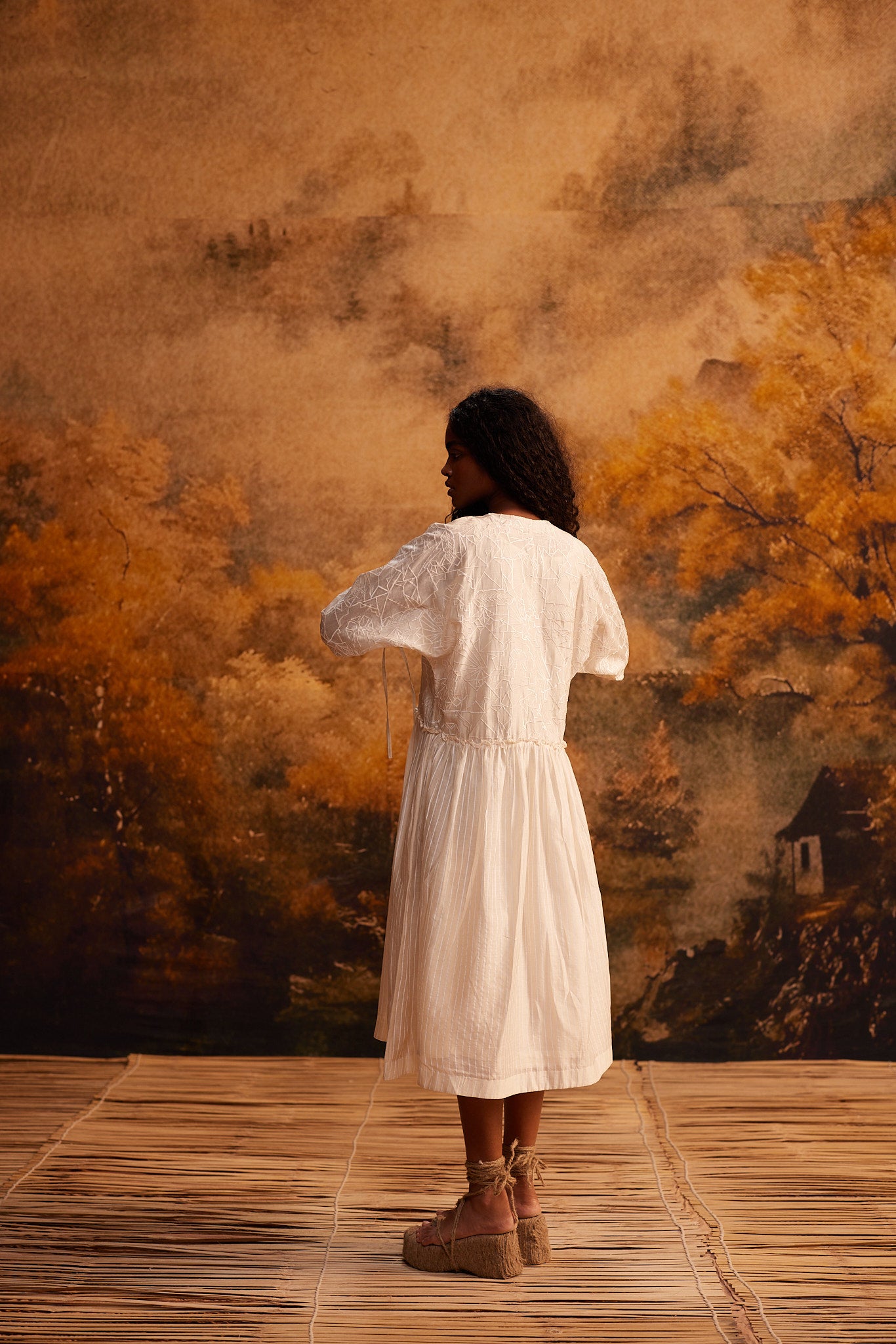 The Tobira Dolman Dress exudes a quiet elegance with its relaxed fit and artful detailing. Crafted from embroidered Chanderi, it features graceful dolman sleeves and delicate gathers at the waist, creating a soft and flowing silhouette. Paired with a coordinating slip, this versatile dress strikes the perfect balance between comfort and sophistication. Its timeless design makes it a wardrobe staple that effortlessly flatters and captivates.