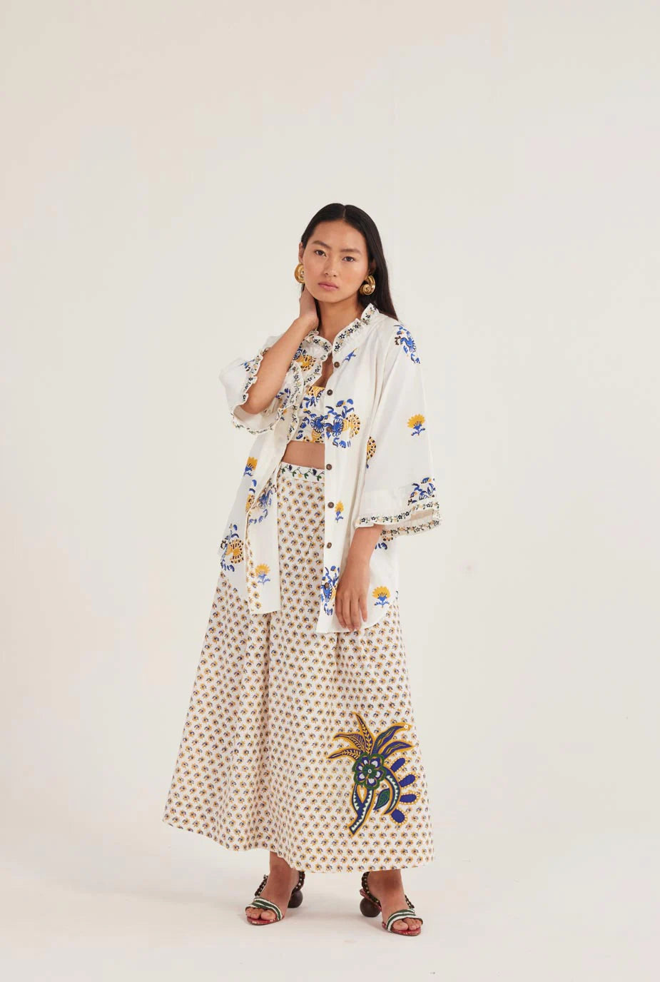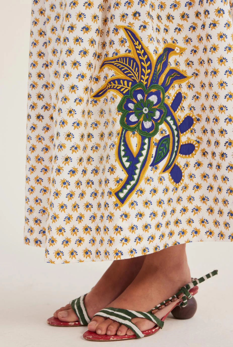 We love us a pleated skirt! This one is hand block printed in cotton with applique work and an embroidered waistline.