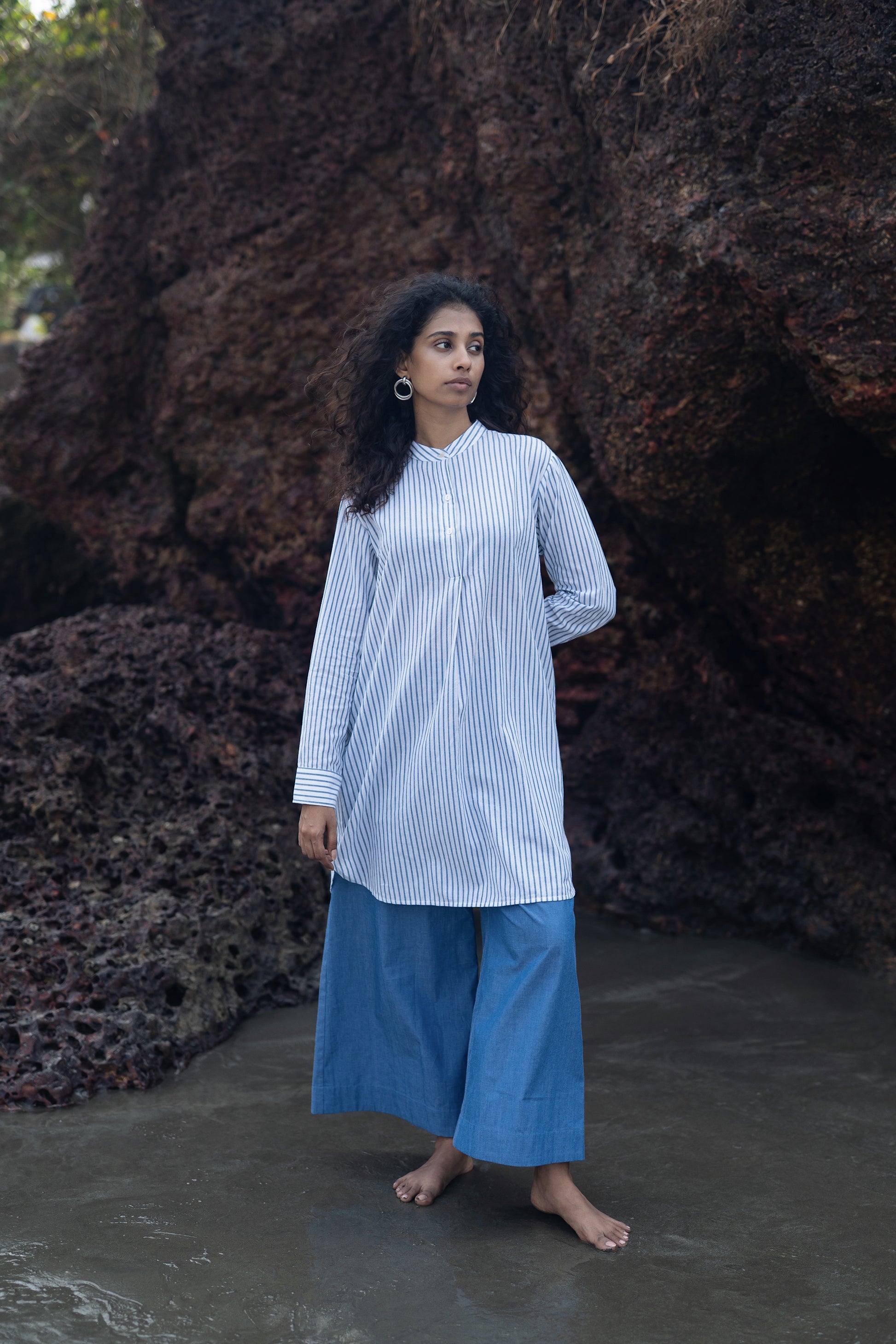 Tori Coord set is made from our yarn dyed madras striped short kurta with cotton chambray denim shade cullottes.