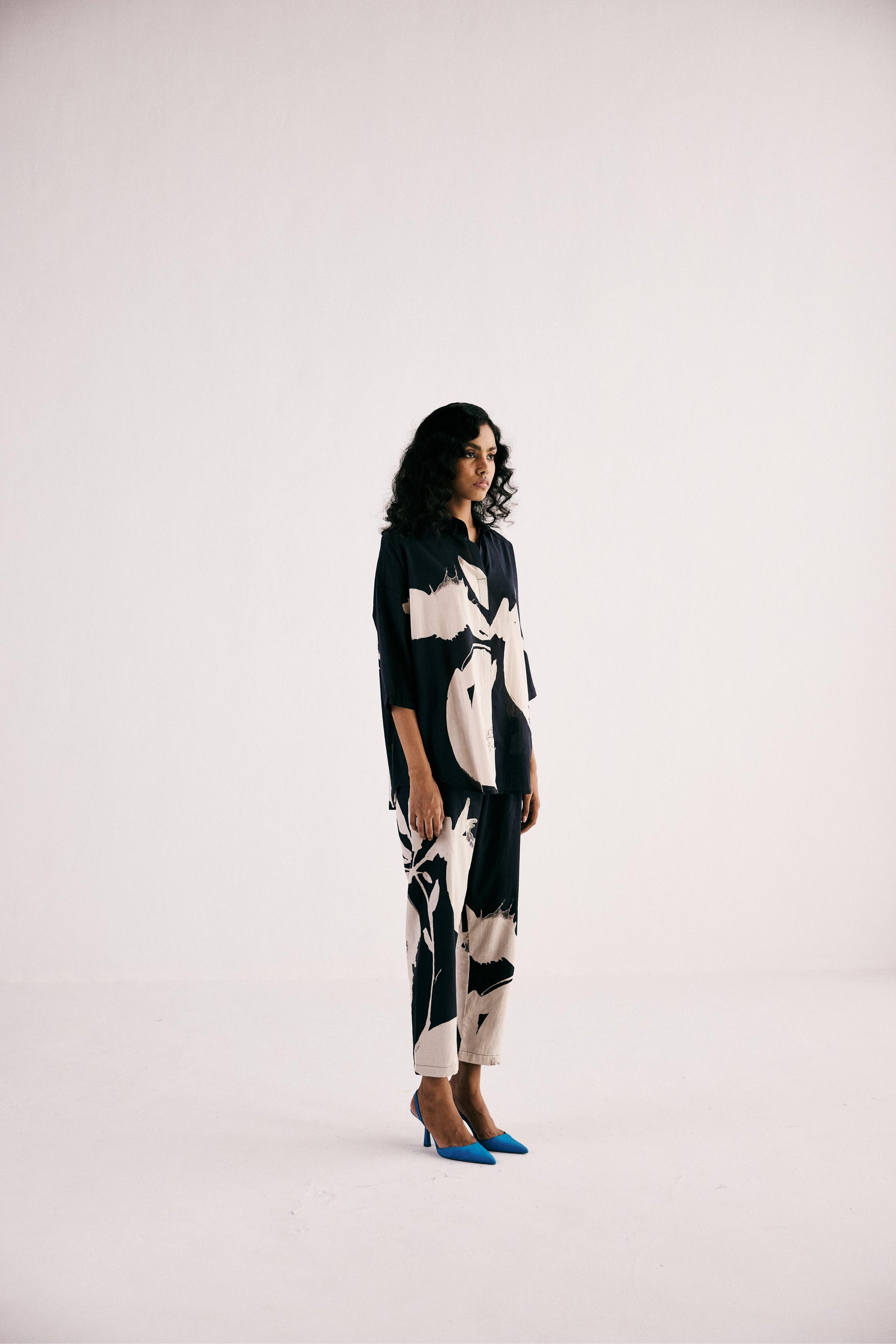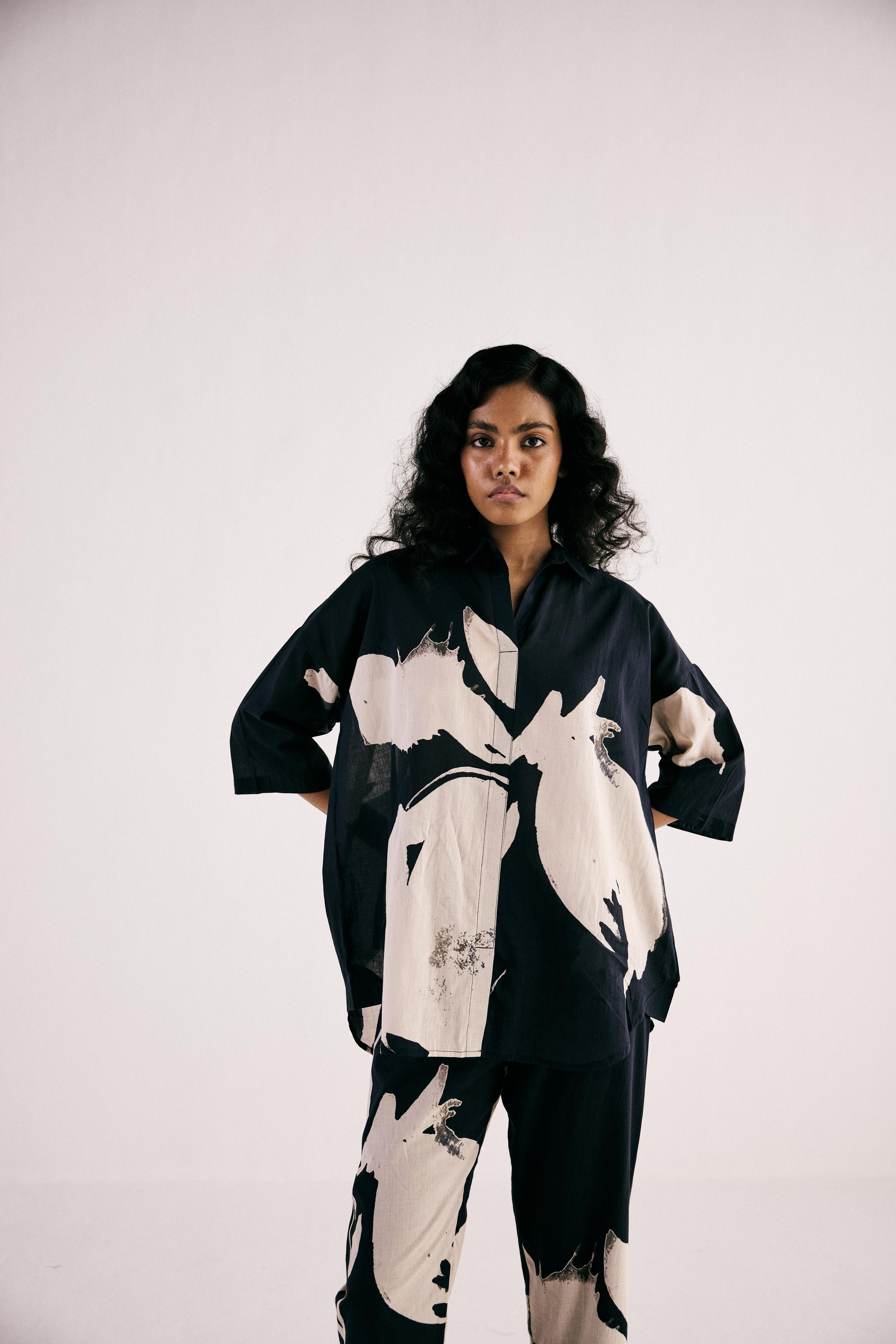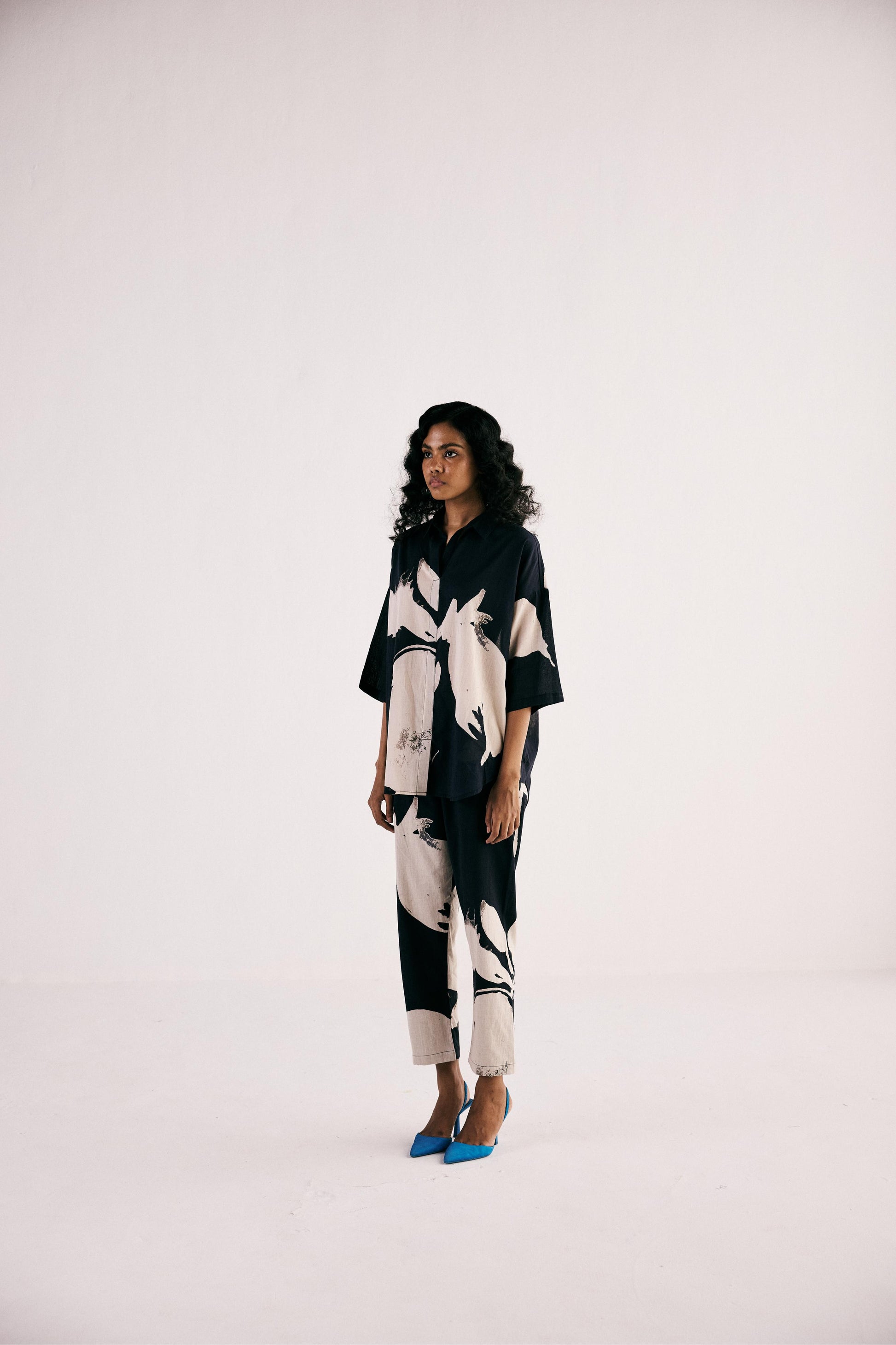 A classic charcoal floral printed button down shirt crafted in soft cotton mul paired with printed cotton mul pencil pants with elasticated back and front zipper opening with a button fastening. Co-ord Two piece
