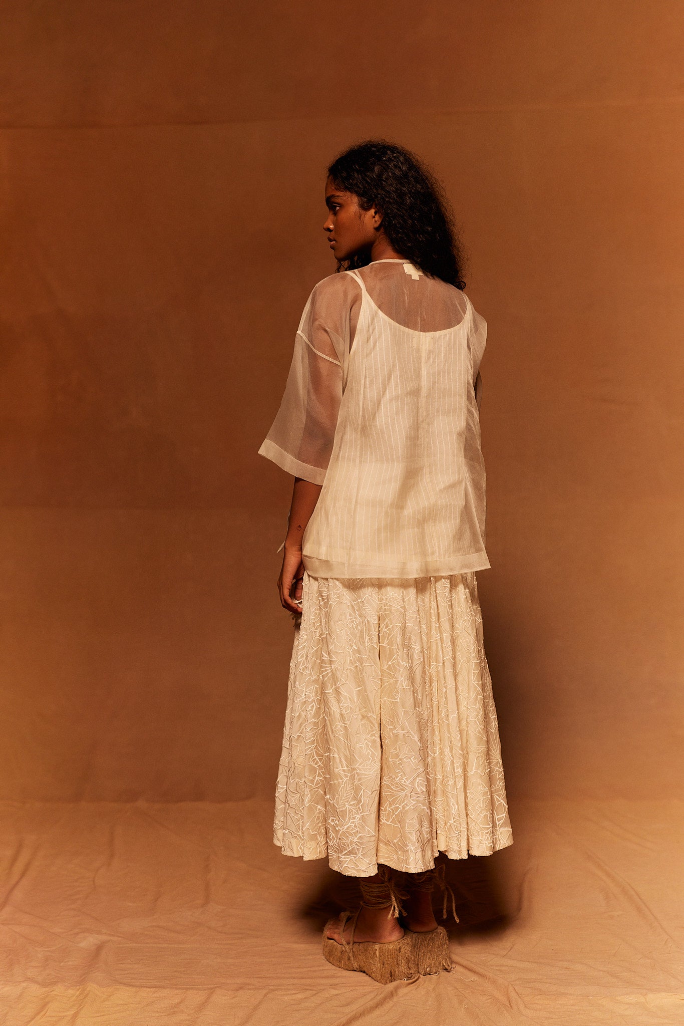 The Tsuru Angrakha, paired with a printed cotton slip, combines graceful overlapping panels with delicate handmade floral tie-ups. This airy, effortlessly stylish piece offers both comfort and charm, making it ideal for relaxed, everyday wear. The design captures the