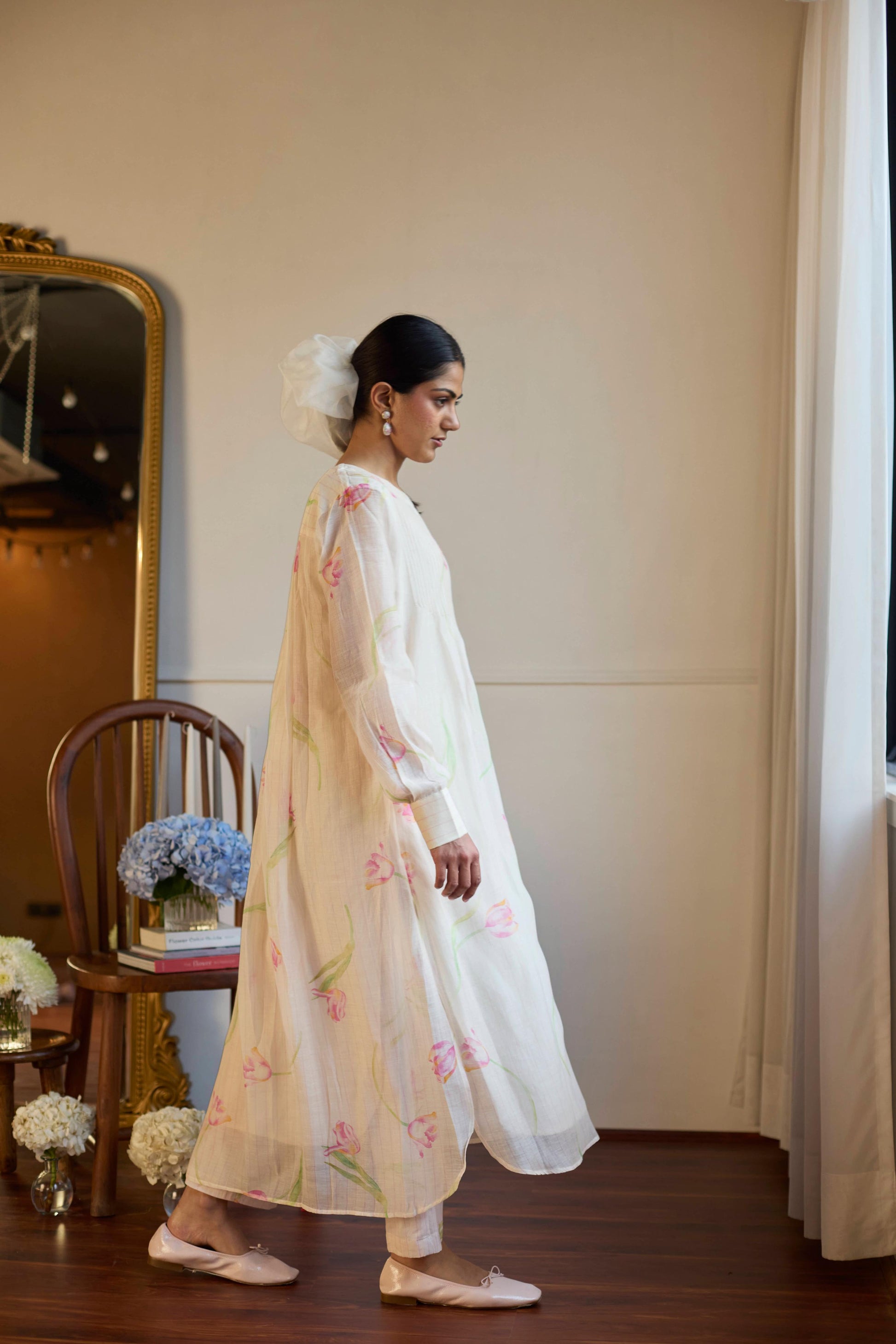 The sleeves kissed with cuffs, neat and refined, Paired with cotton tulip print trousers, bright, Where artful detail meets nature's bloom, A perfect balance of comfort and light.