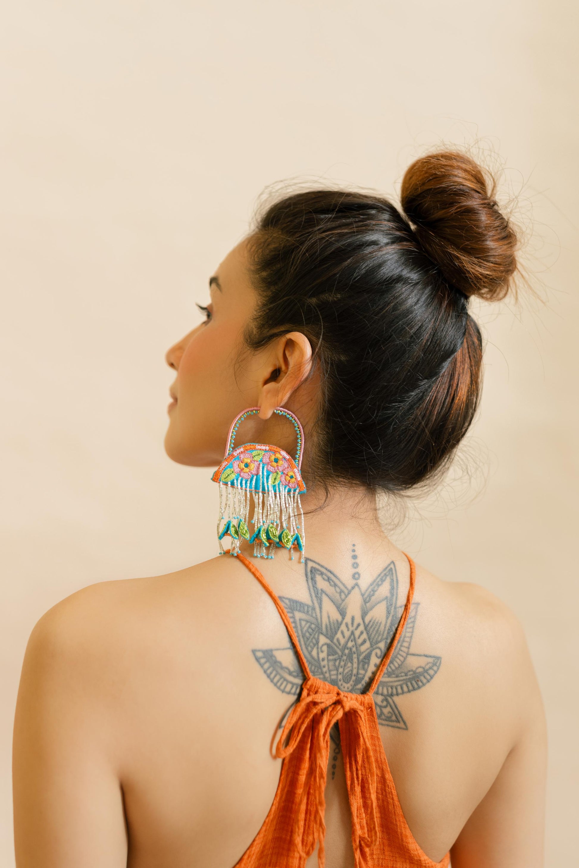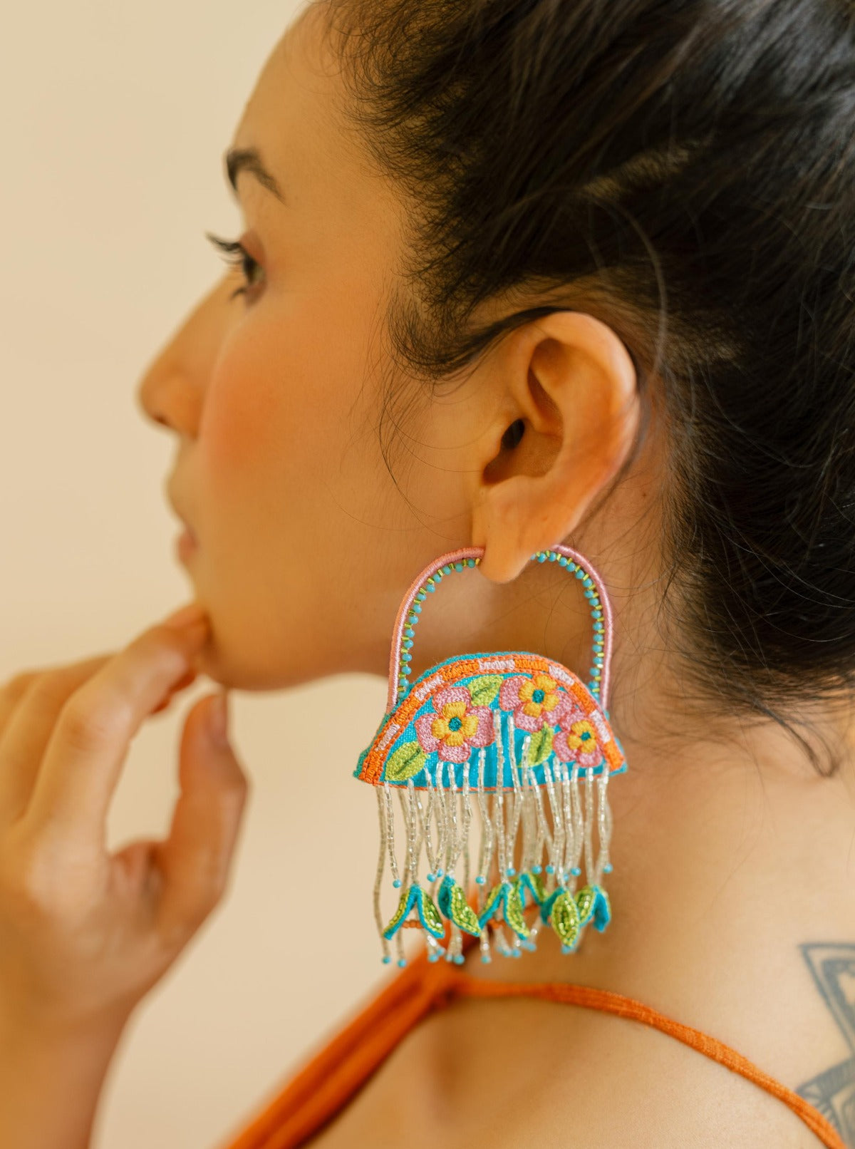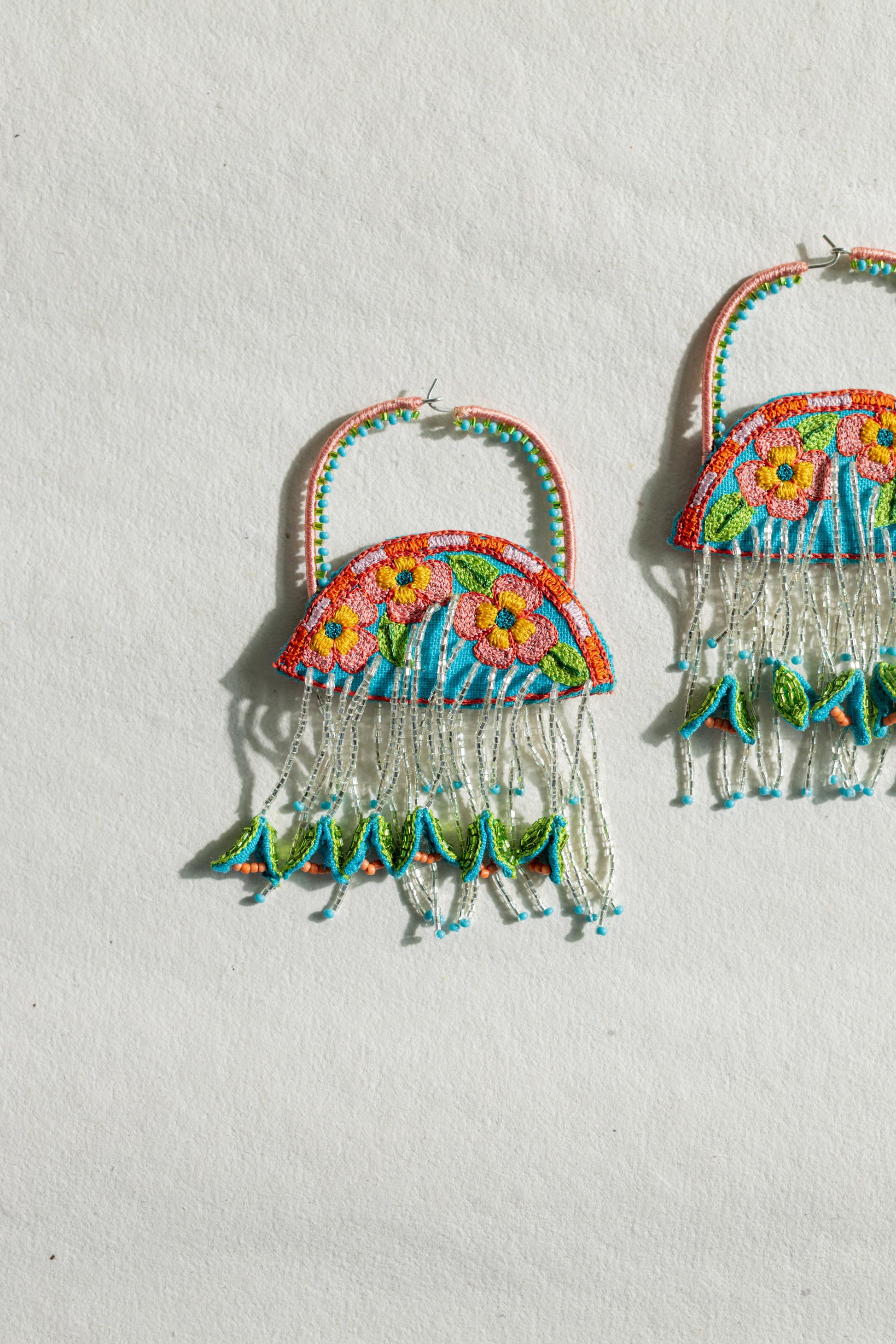 TULUM, an elegant yet simple floral hoop earrings with our unique flower motifs and bead detailing. Embroidered on both sides. Light weight and easy to carry. Provided with a hook on top.