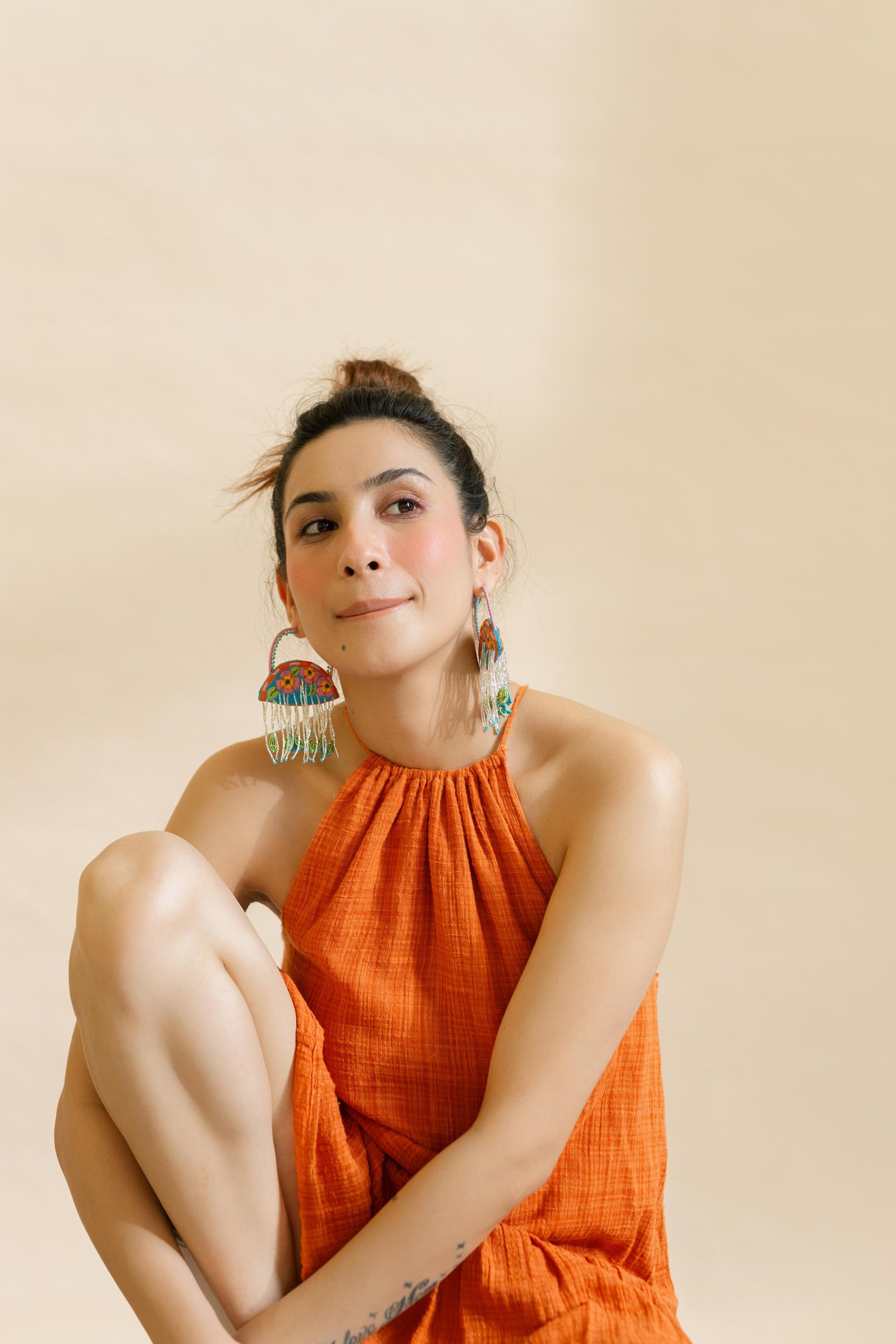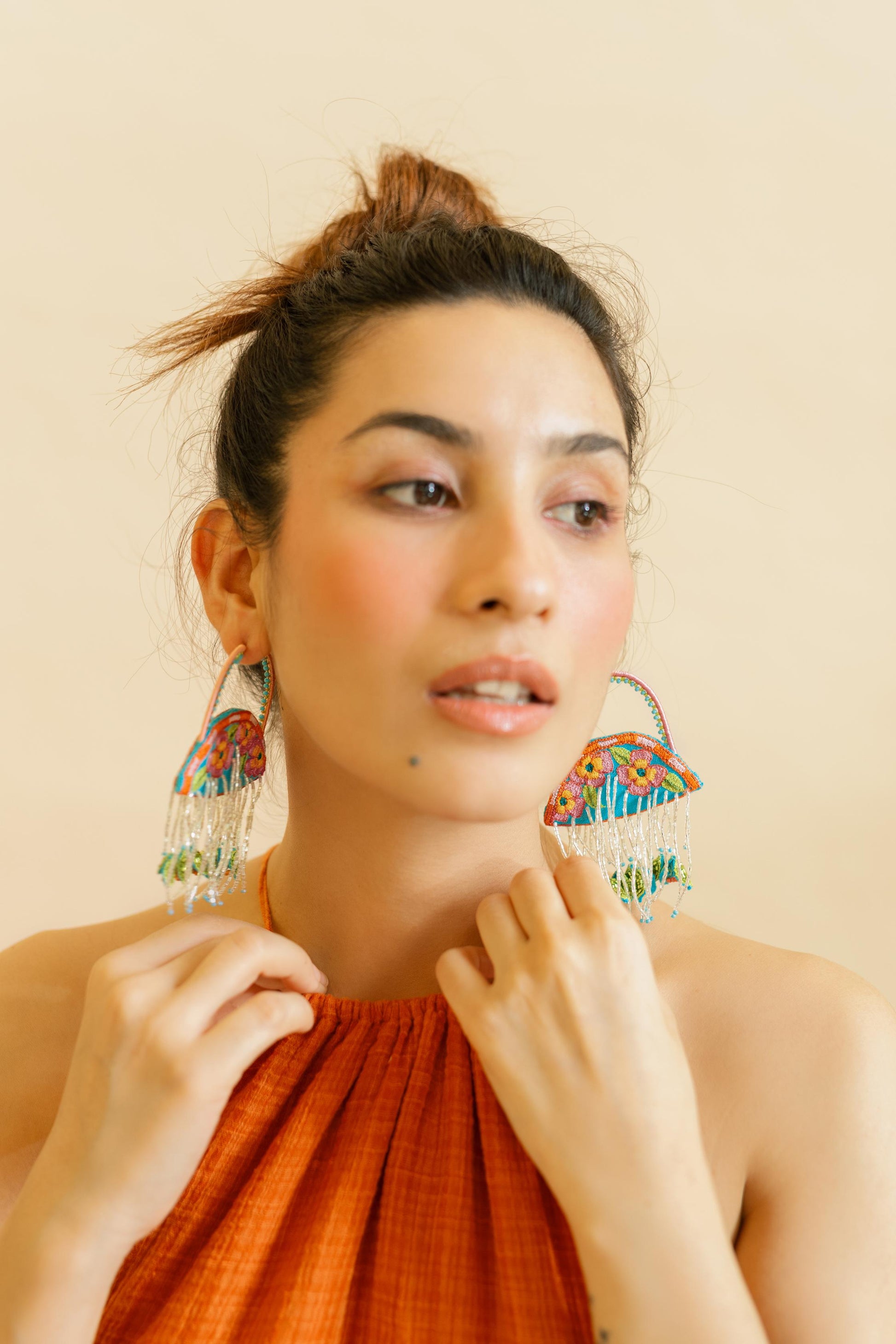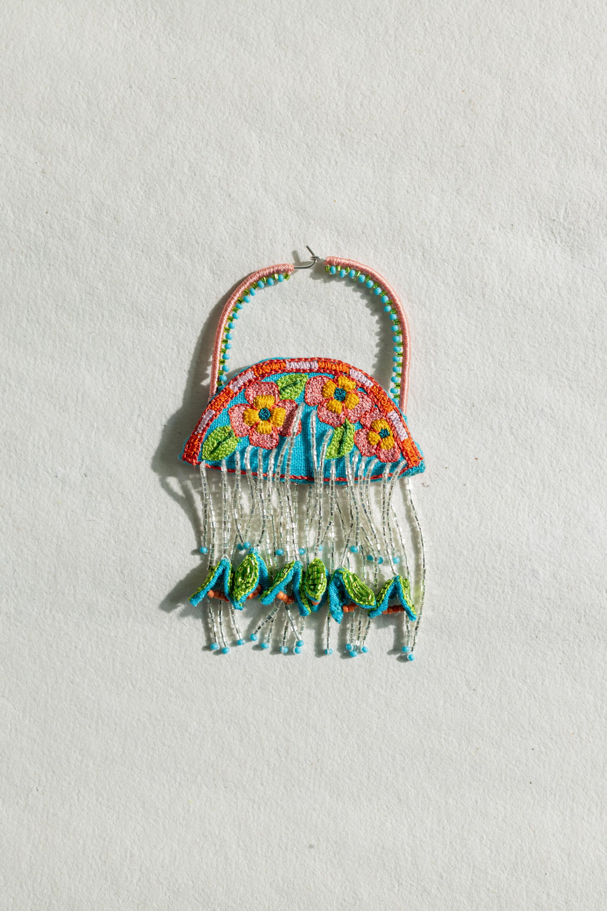 TULUM, an elegant yet simple floral hoop earrings with our unique flower motifs and bead detailing. Embroidered on both sides. Light weight and easy to carry. Provided with a hook on top.