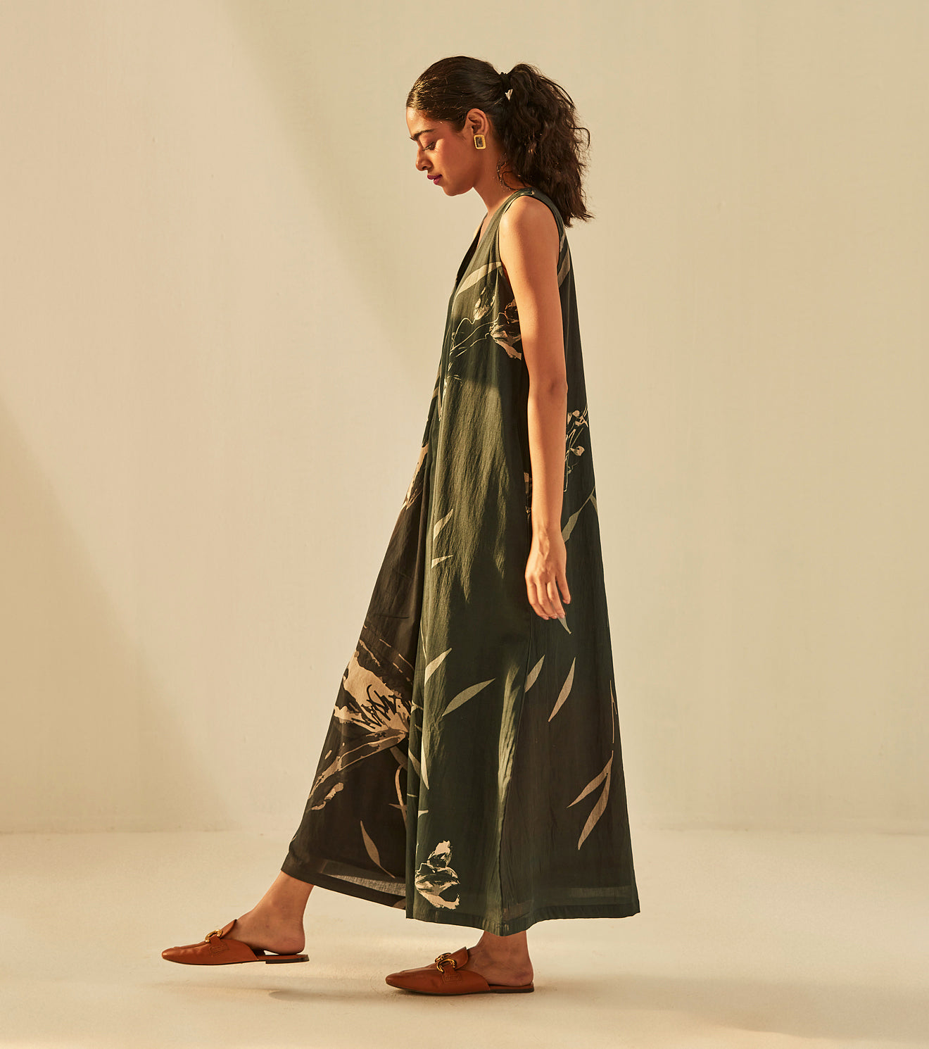 This jumpsuit symbolises refined grace. adorned with a classic floral print on a dark green base featuring a v neckline and front zipper opening, crafted in soft cotton mul. Handcrafted in India. Side seam pockets. Fully lined.
