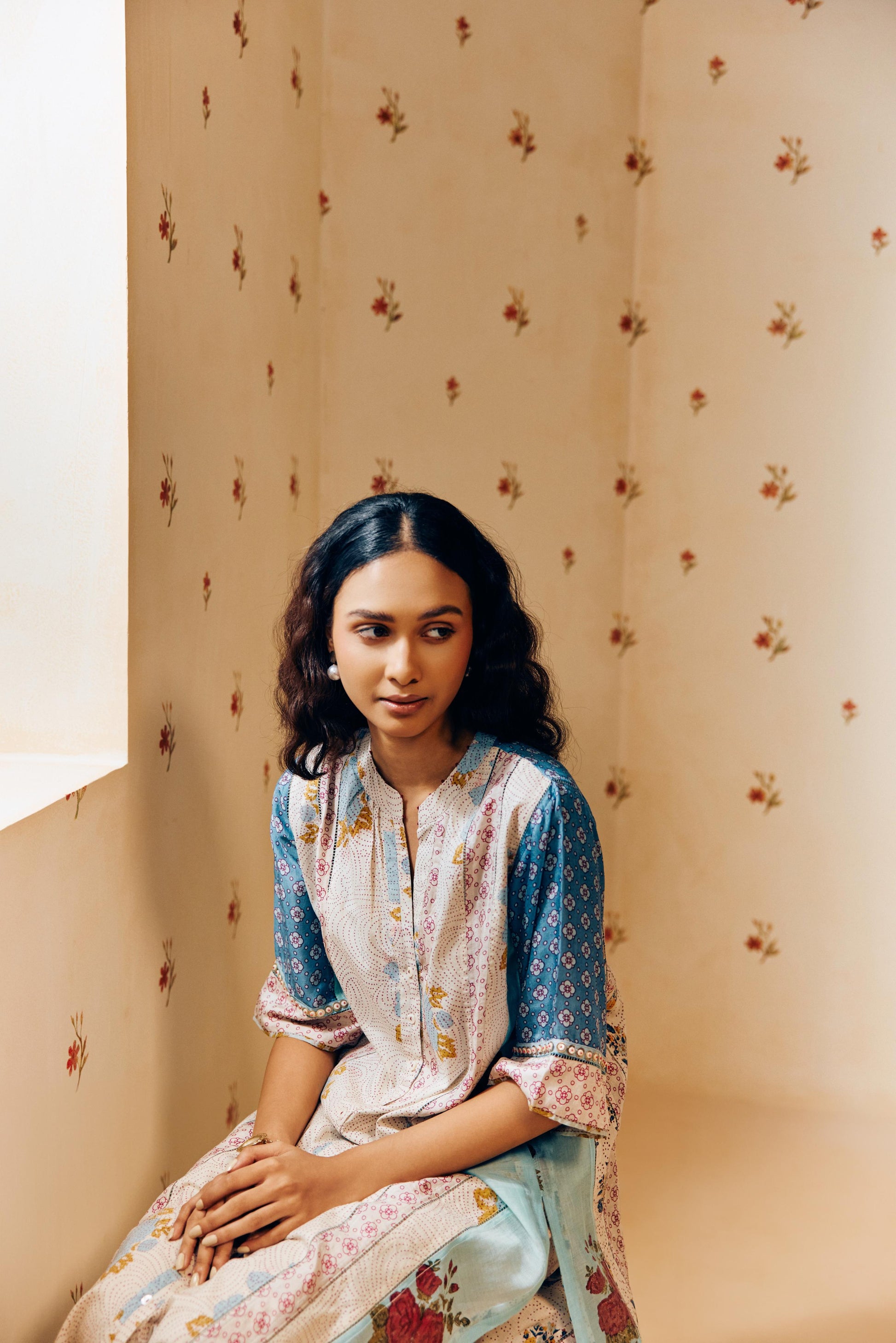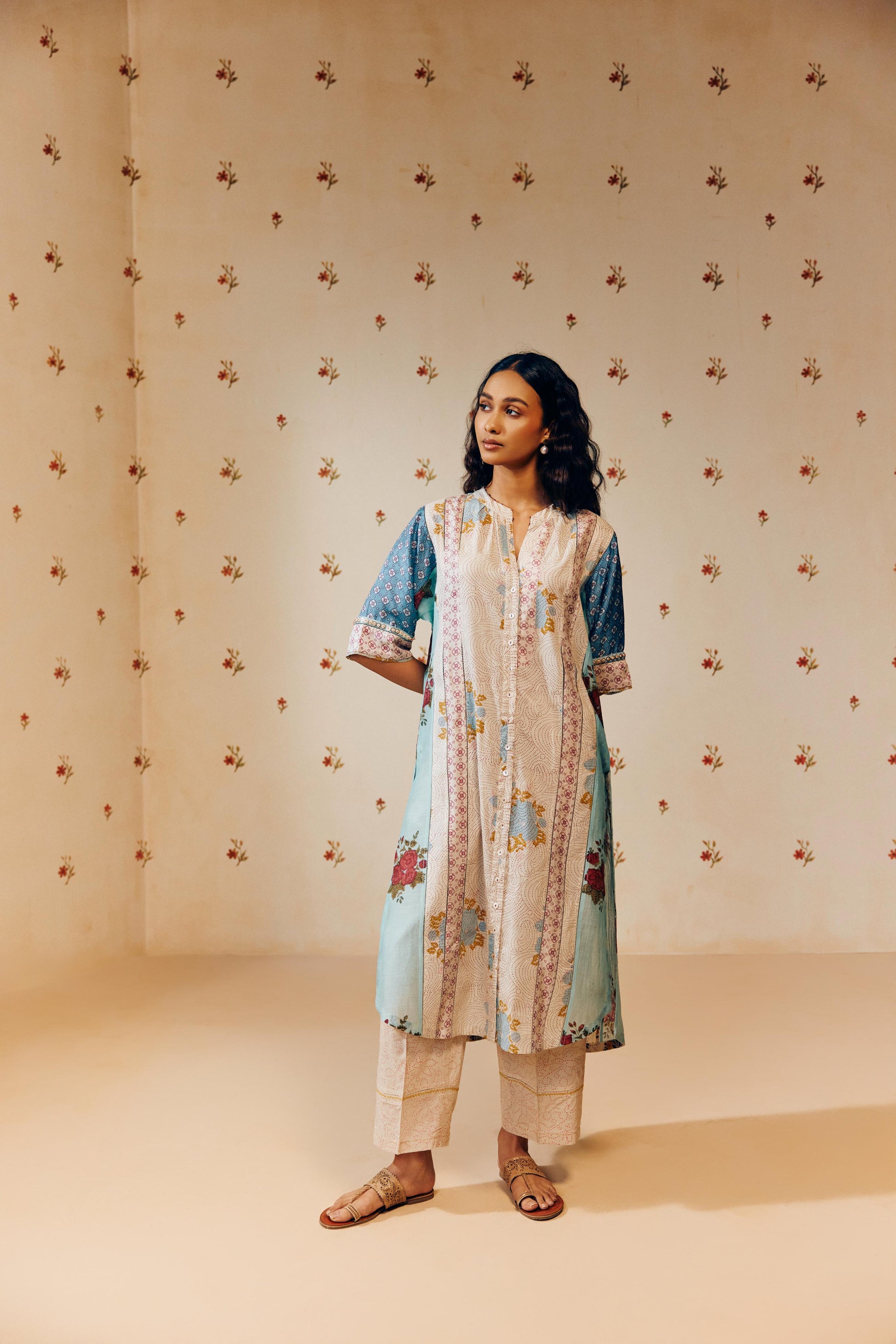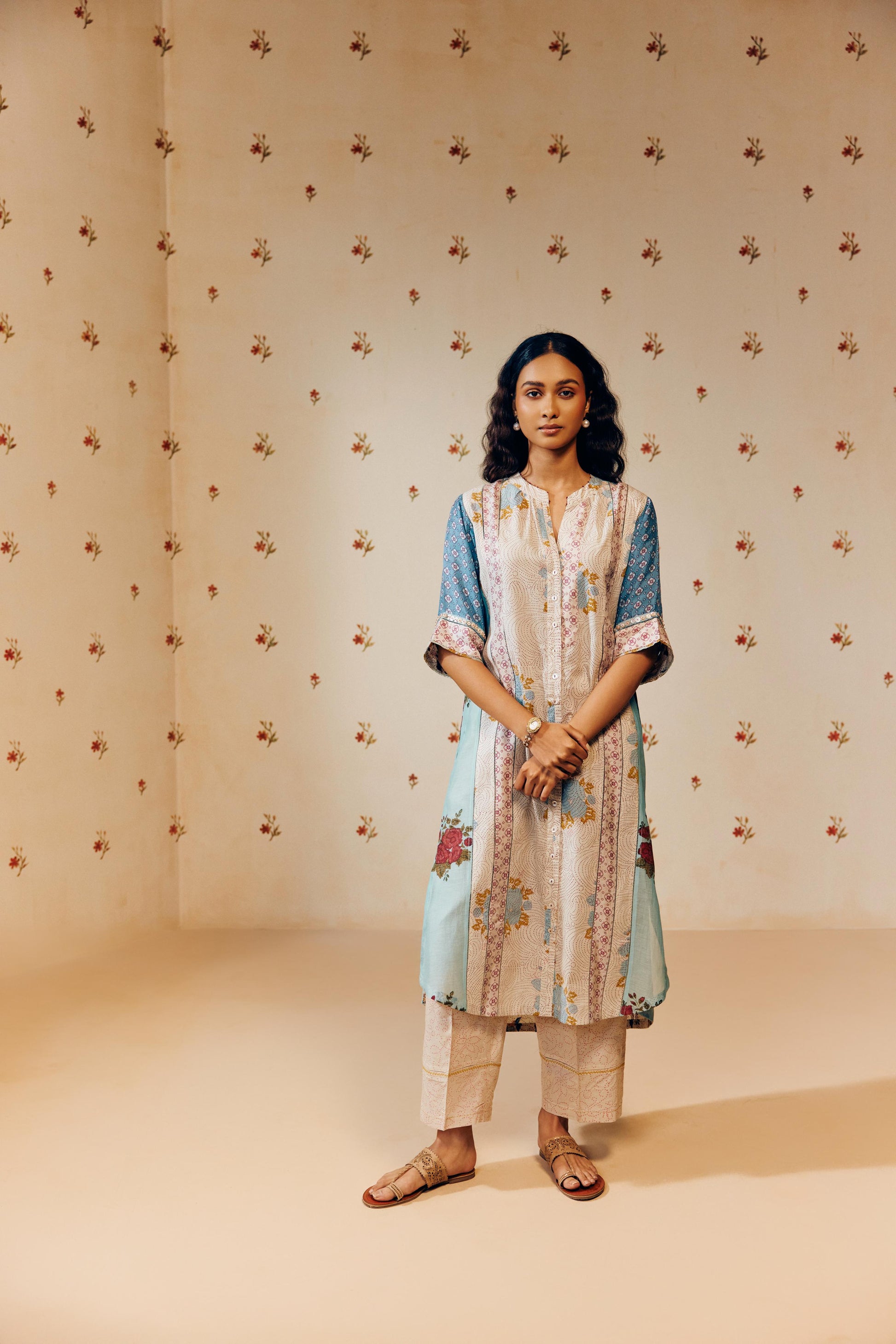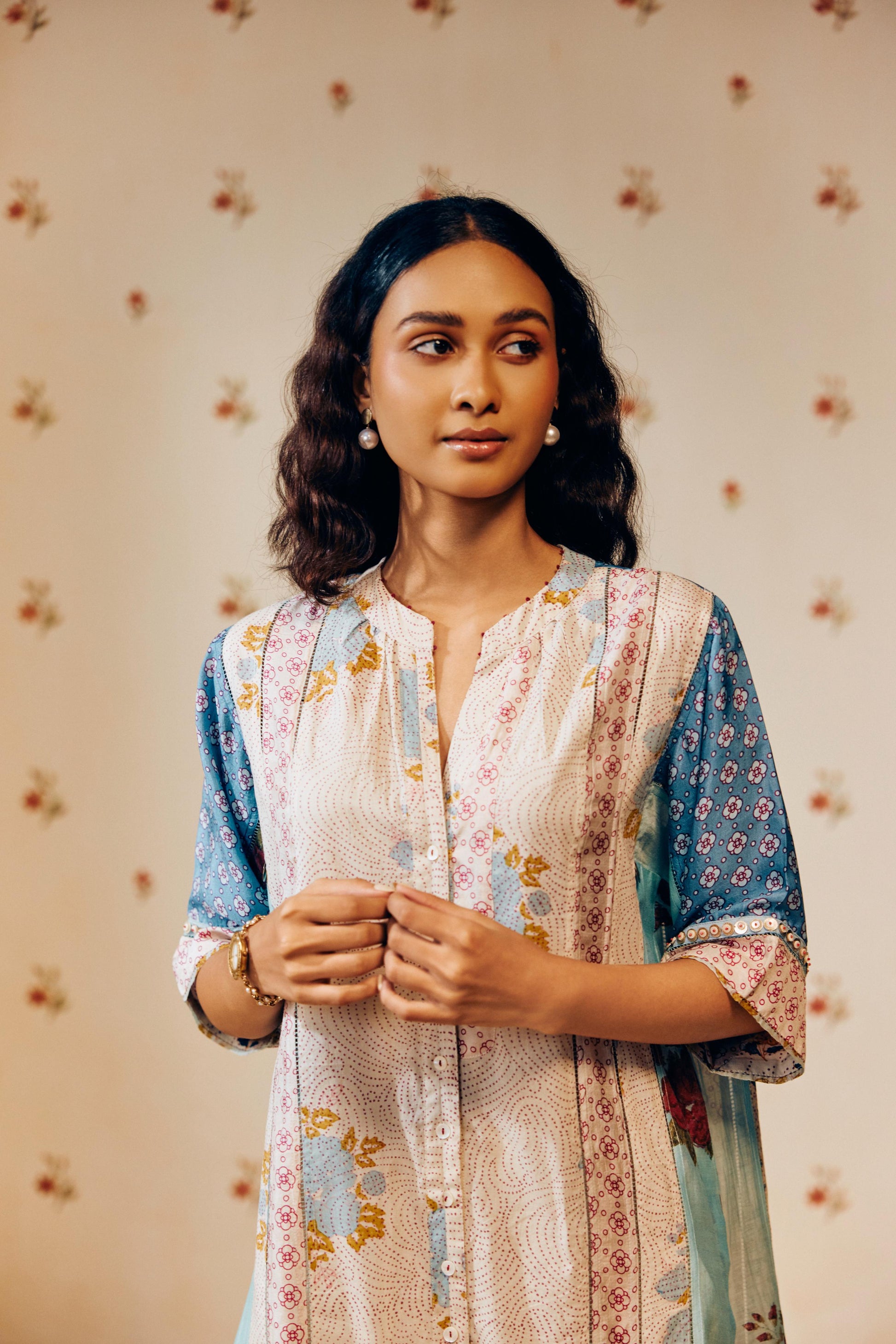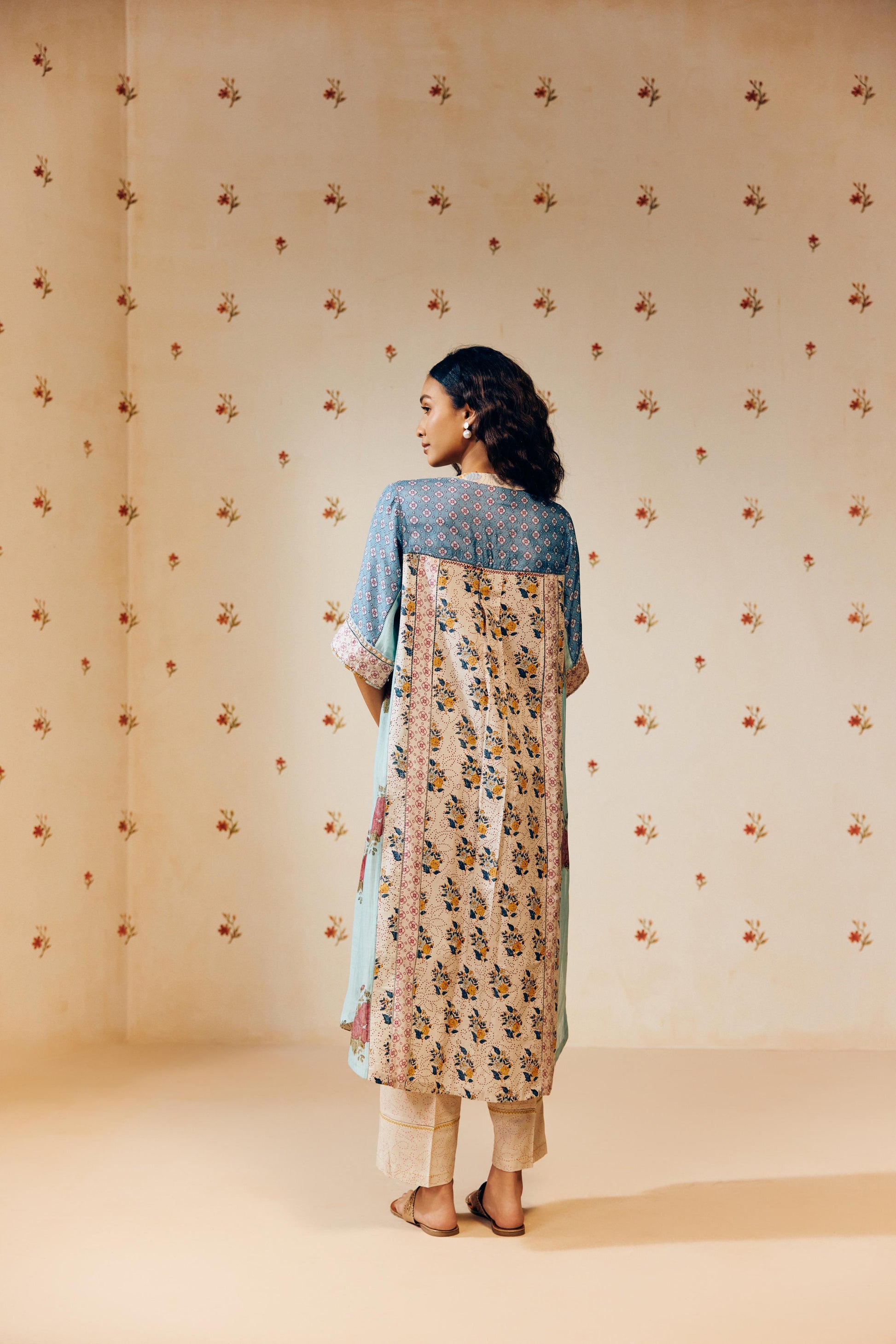 The multi-paneled design incorporates luxurious printed mulberry silk and hand block printed handloom Chanderi, blending rich Indian textile traditions into a modern, easy-to-wear outfit.