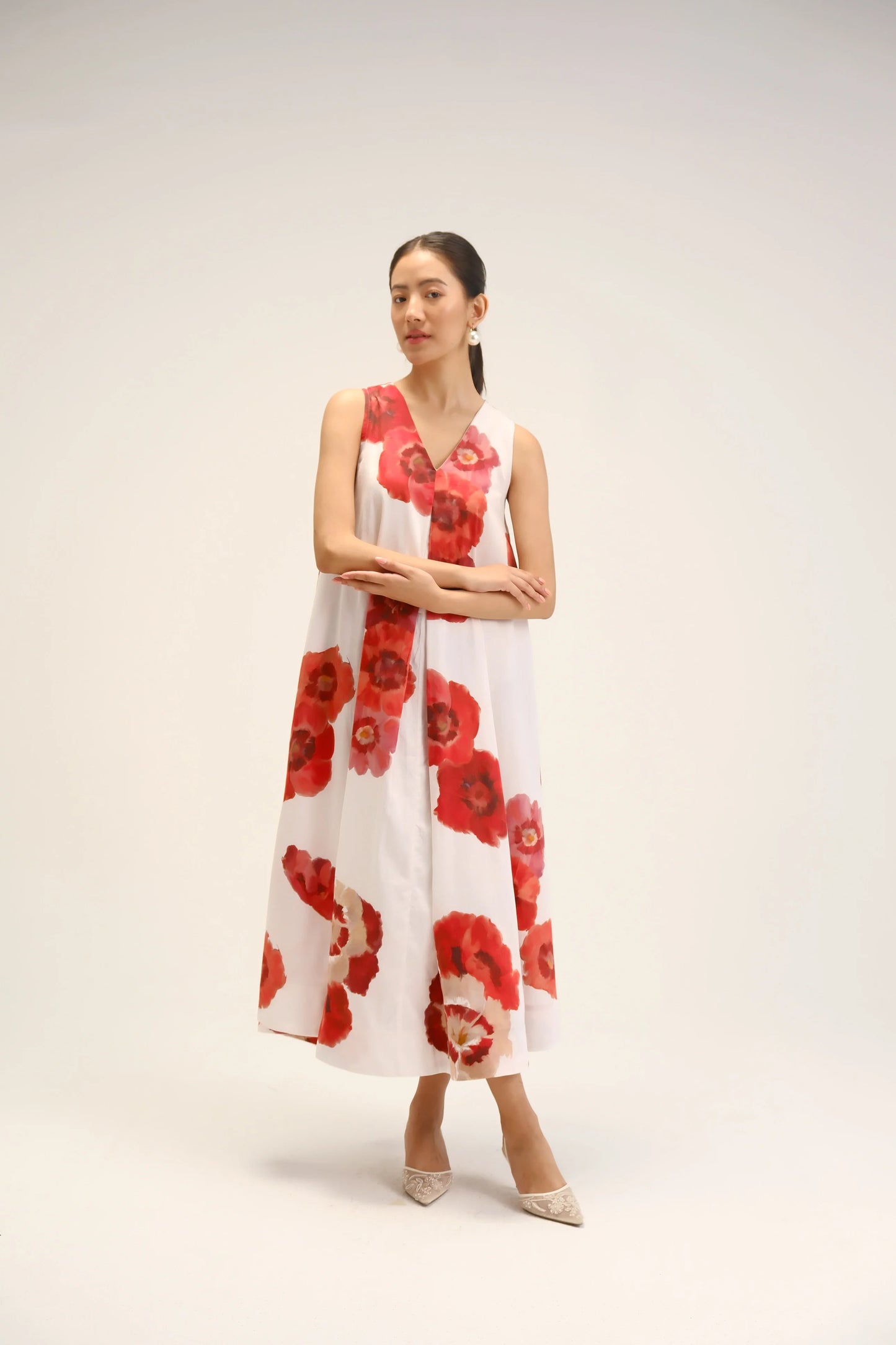This dress features a bold and artistic floral print, designed with large red and crimson blooms splashed across a pristine white backdrop. The poppy-inspired florals bring a fresh, romantic charm, perfect for both daytime events and elegant evenings.