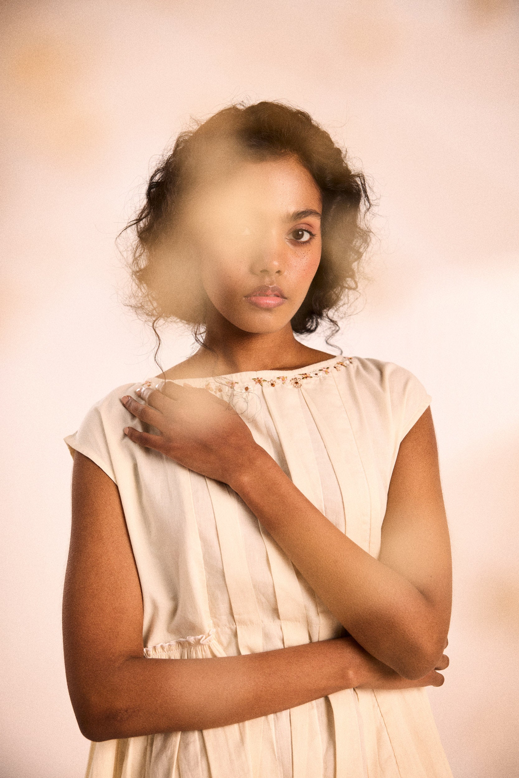 Ethereal and effortlessly charming, cthe dress is rafted in cotton mul with delicate floral embroidery. Featuring a tiered silhouette, pintuck detailing, and cap sleeves, it exudes a dreamy, vintage-inspired elegance.