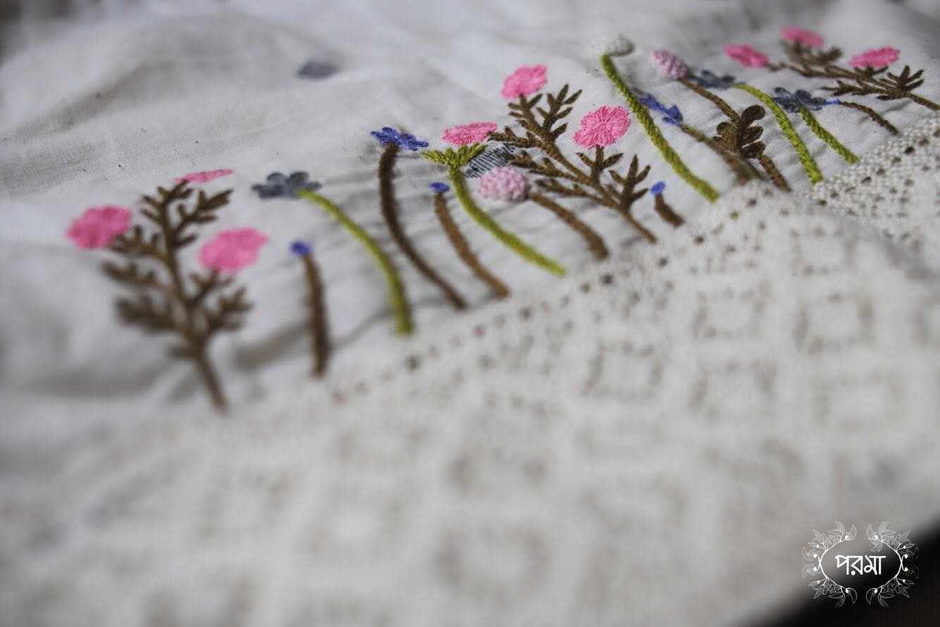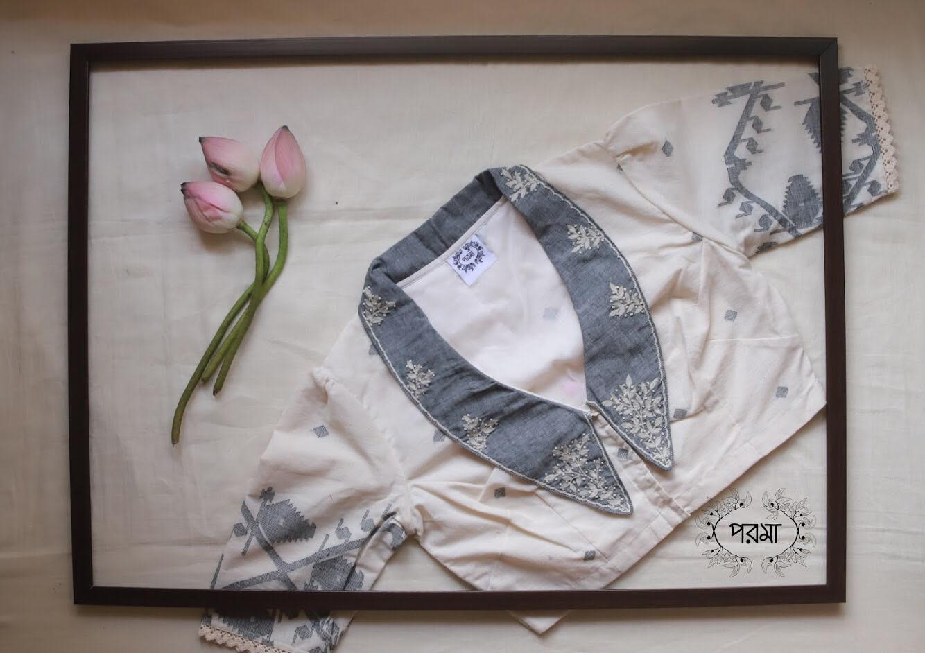On white dove soft Jamdani woven fabric, a tiny patch of happy flowers are hand embroidered and fenced with lace. The grey collars on the front also have cute little bunch of flowers. Of all the blouses we have made till date, this is the only one I can call Victoriar Pori. For me it is the epitome of all things delicate and beautiful.