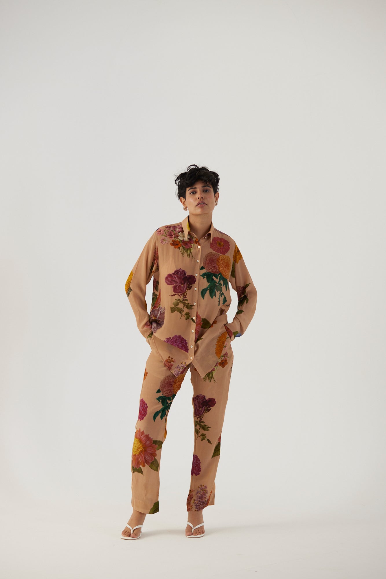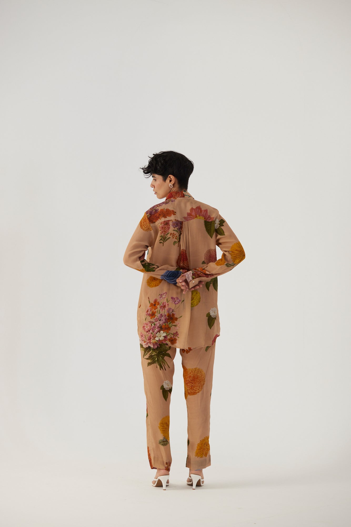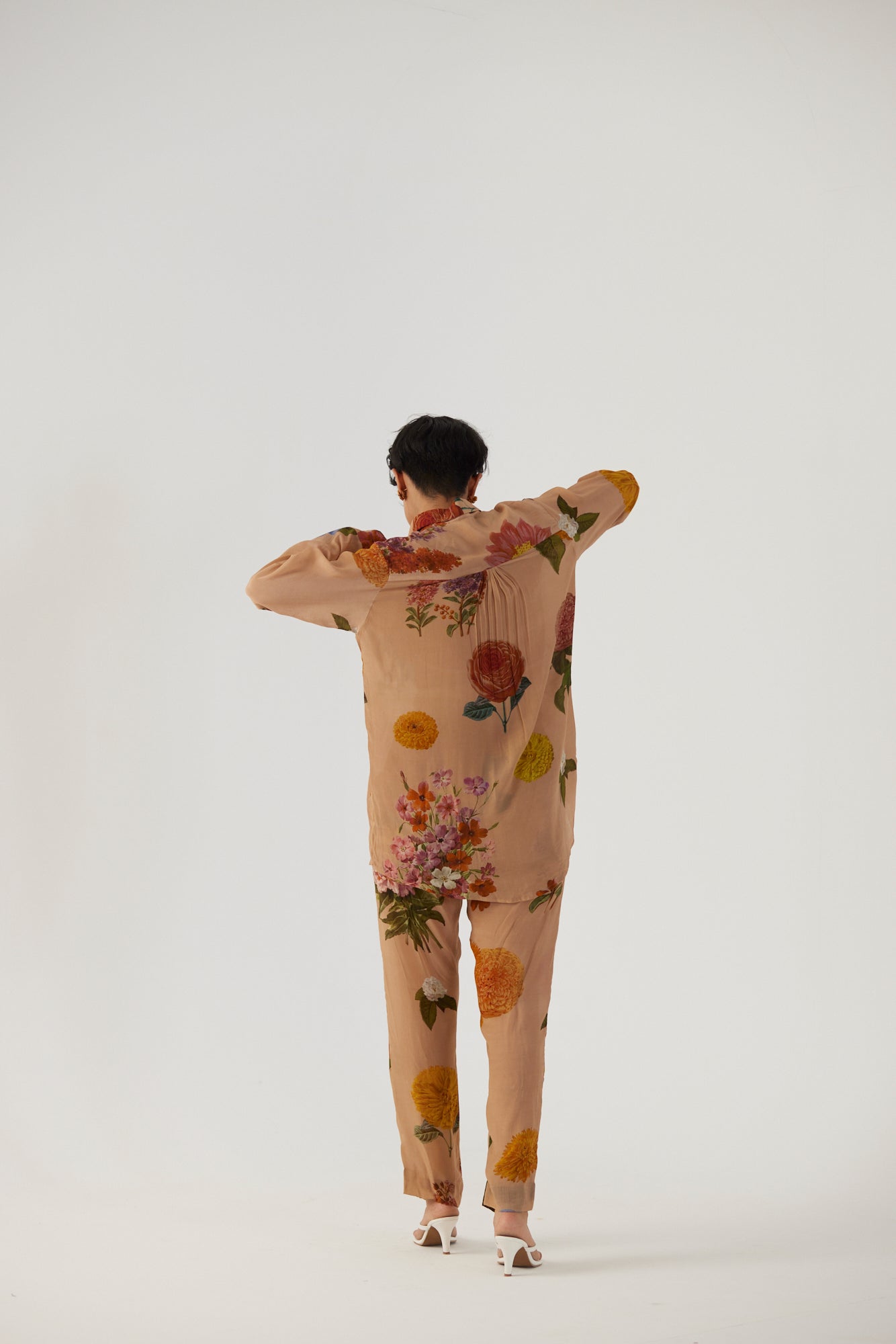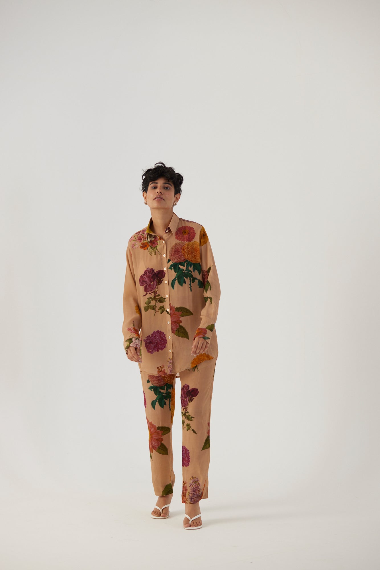 The vintage garden print inspired from an old botanical tapestry is just a breath-taking collection of a botanical garden. Watercolor florals and leaves s are playfully dancing on a beige background. All with the touch of vintage. The set includes a button down shirt with back gathers and straight pants.