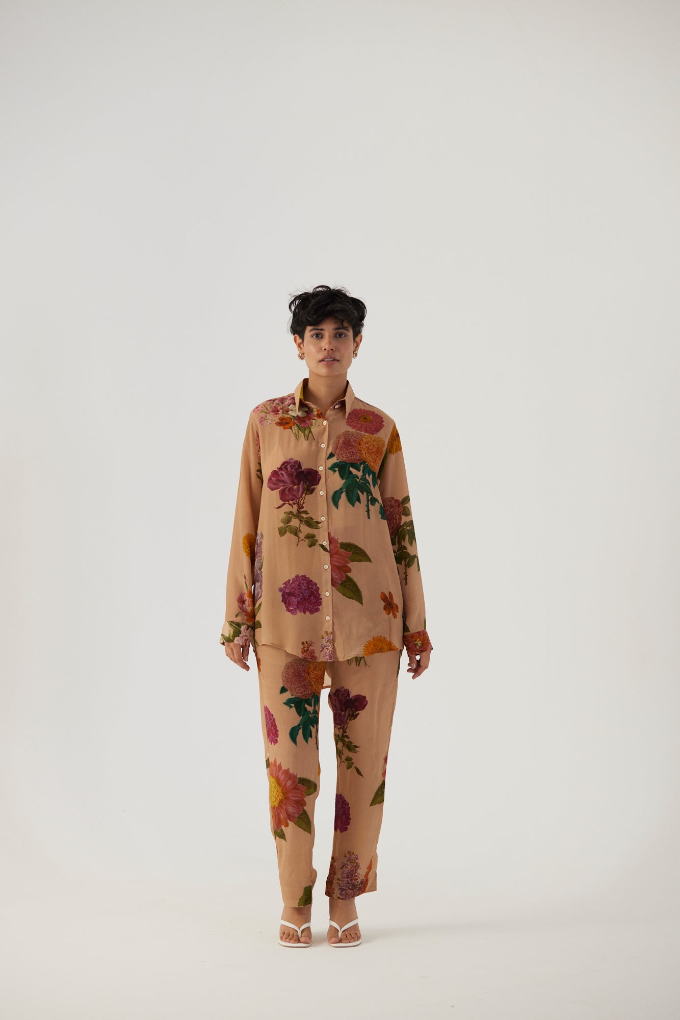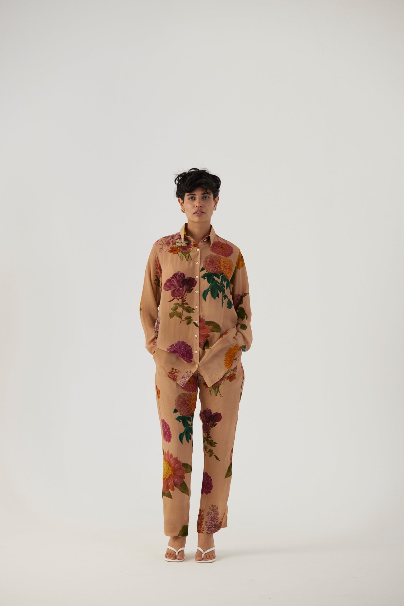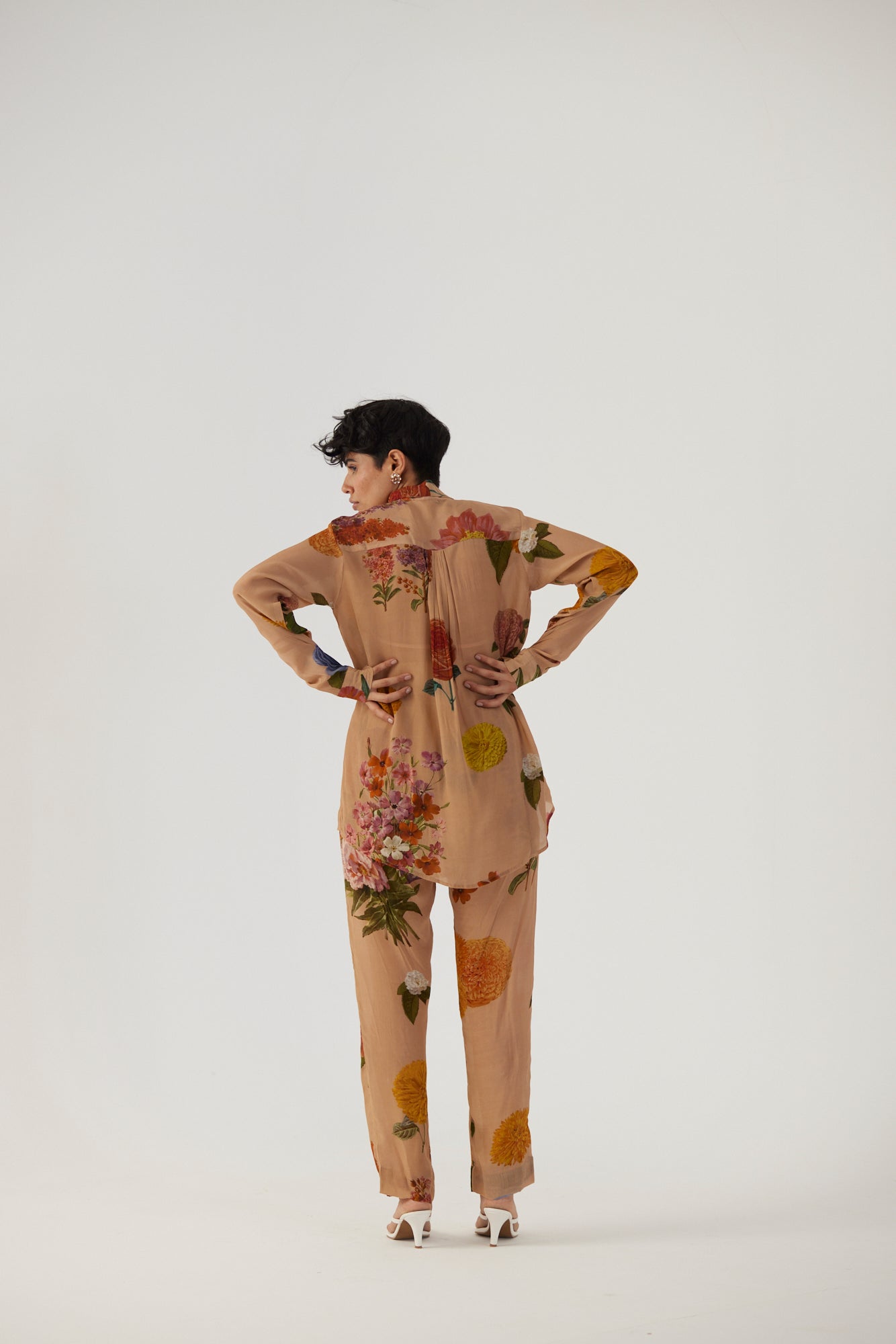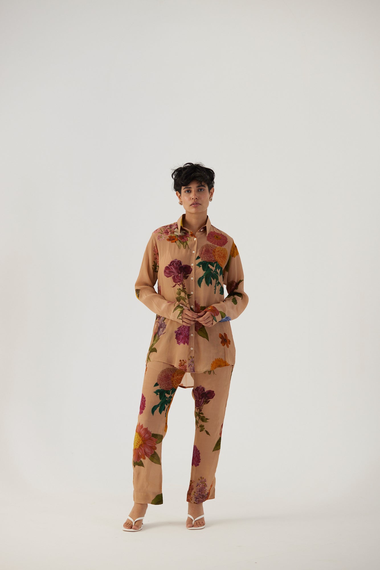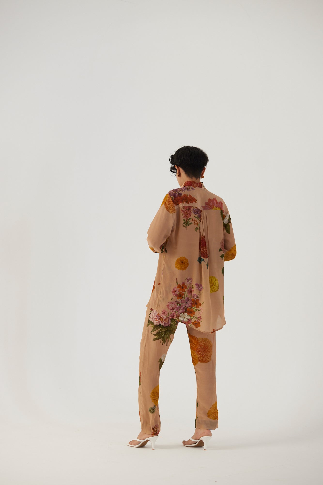 The vintage garden print inspired from an old botanical tapestry is just a breath-taking collection of a botanical garden. Watercolor florals and leaves s are playfully dancing on a beige background. All with the touch of vintage. The set includes a button down shirt with back gathers and straight pants.