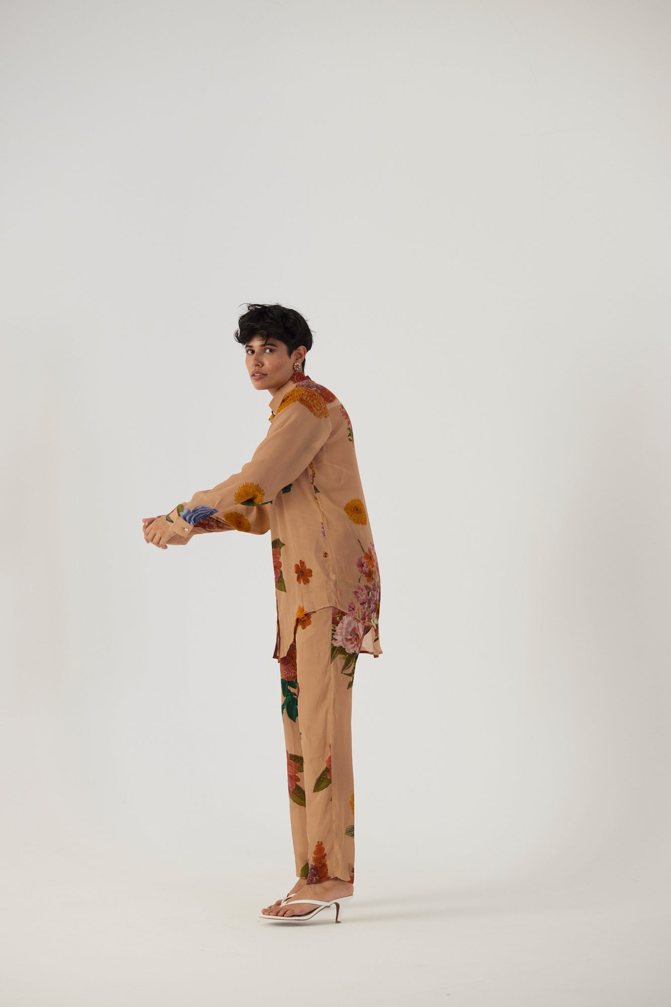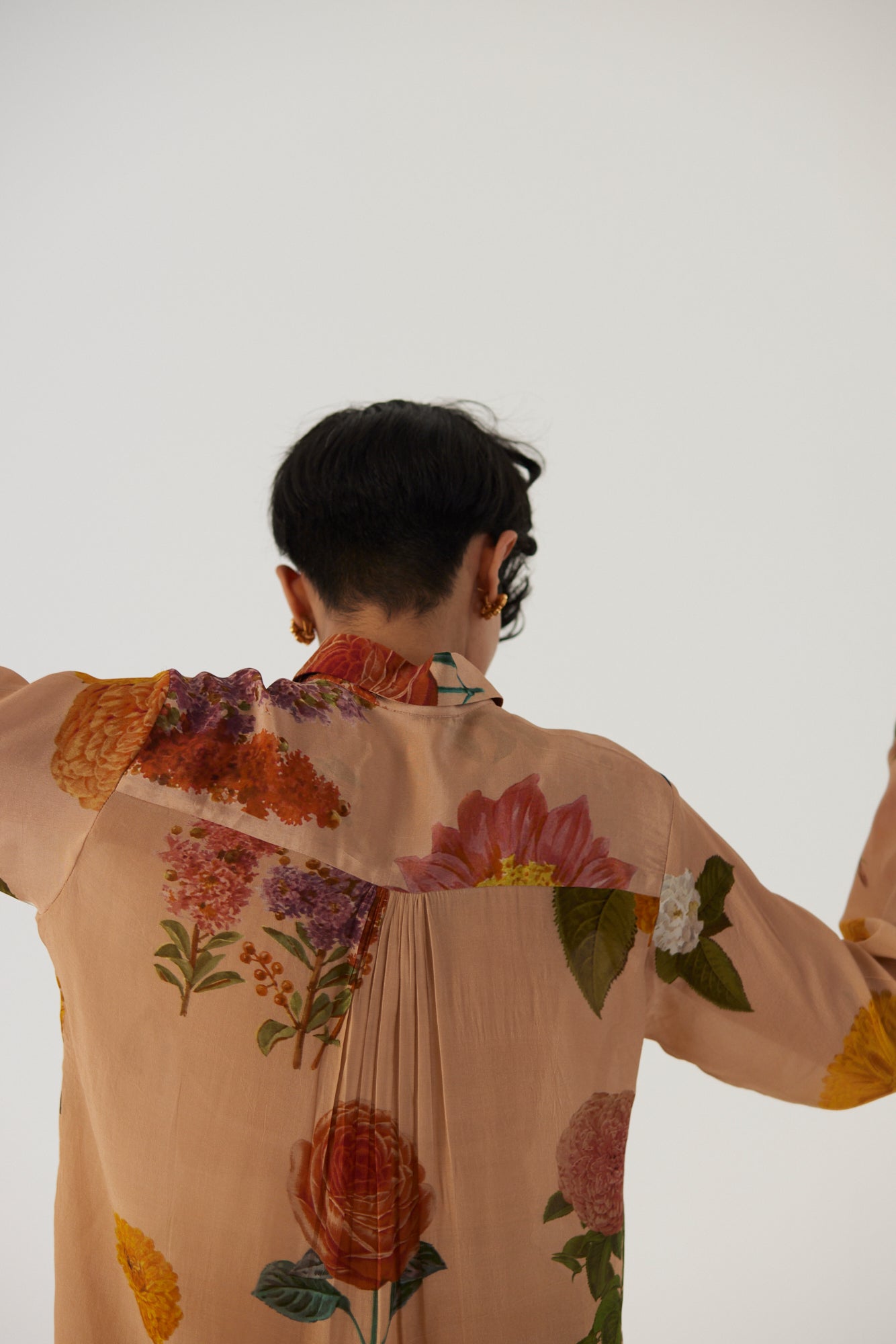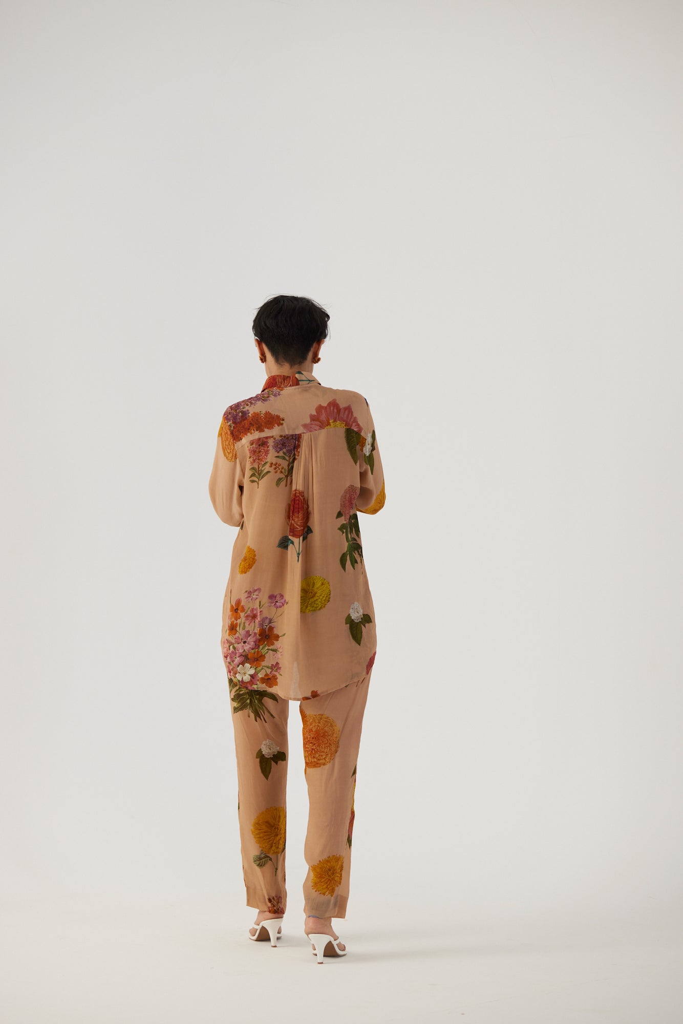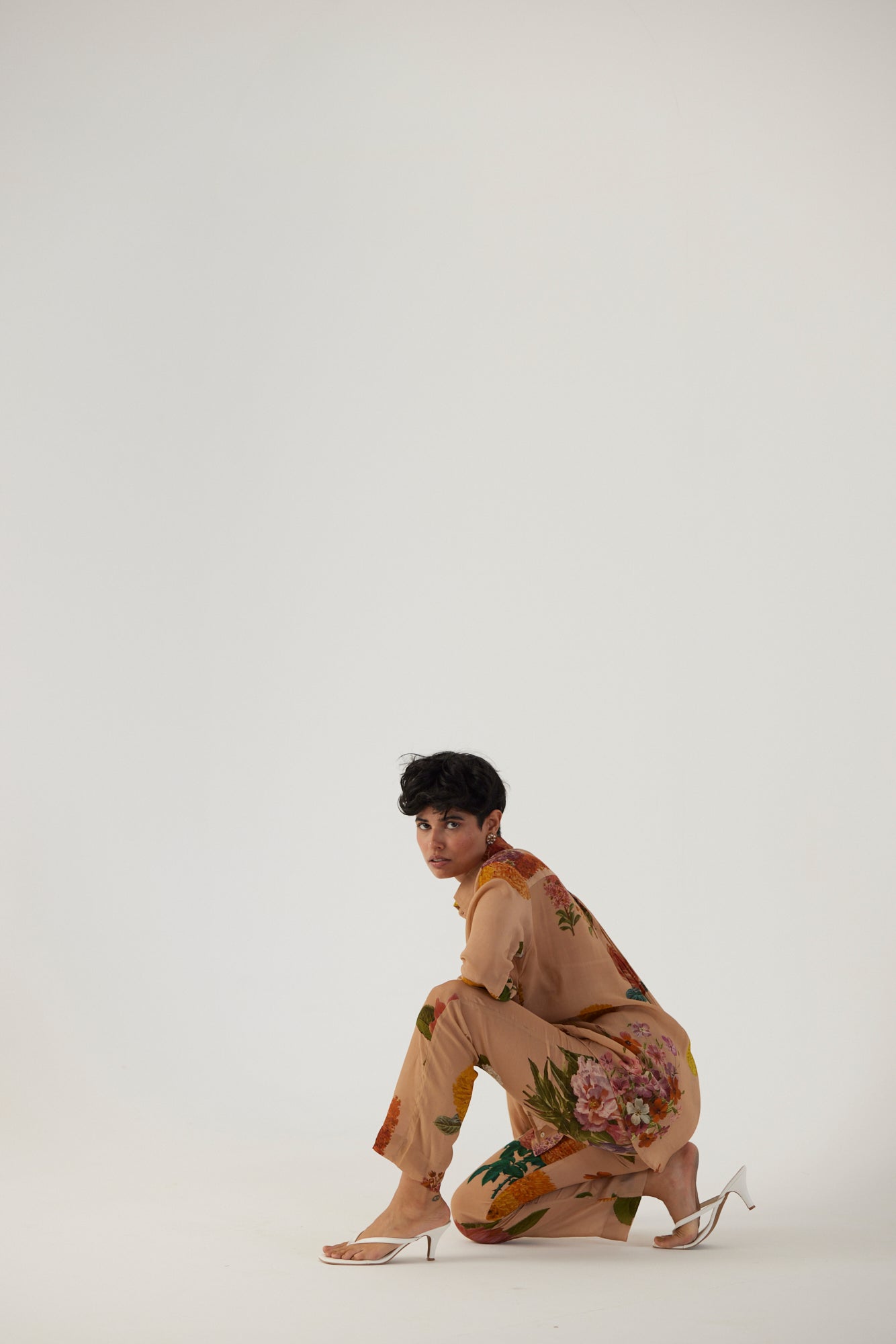 The vintage garden print inspired from an old botanical tapestry is just a breath-taking collection of a botanical garden. Watercolor florals and leaves s are playfully dancing on a beige background. All with the touch of vintage. The set includes a button down shirt with back gathers and straight pants.
