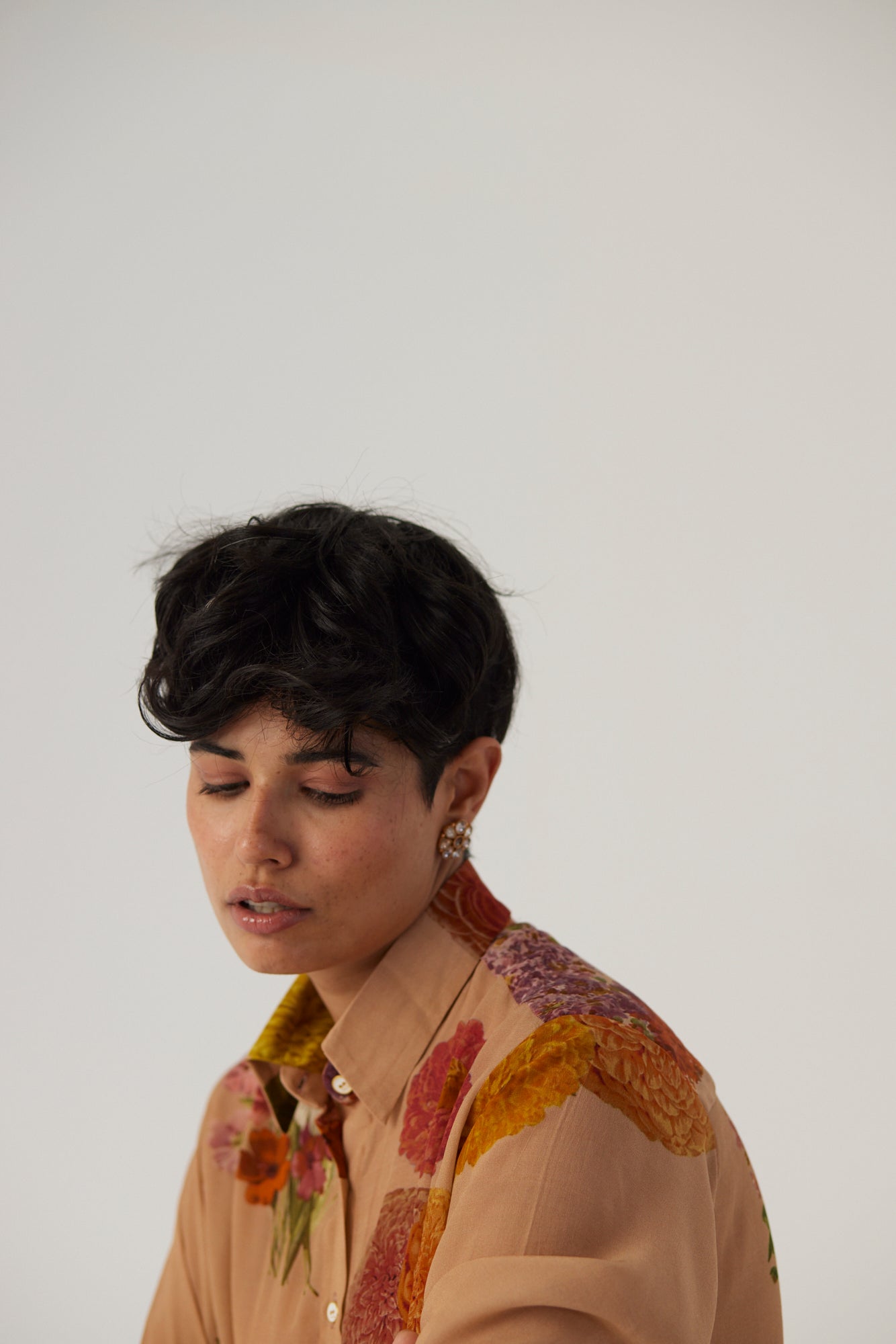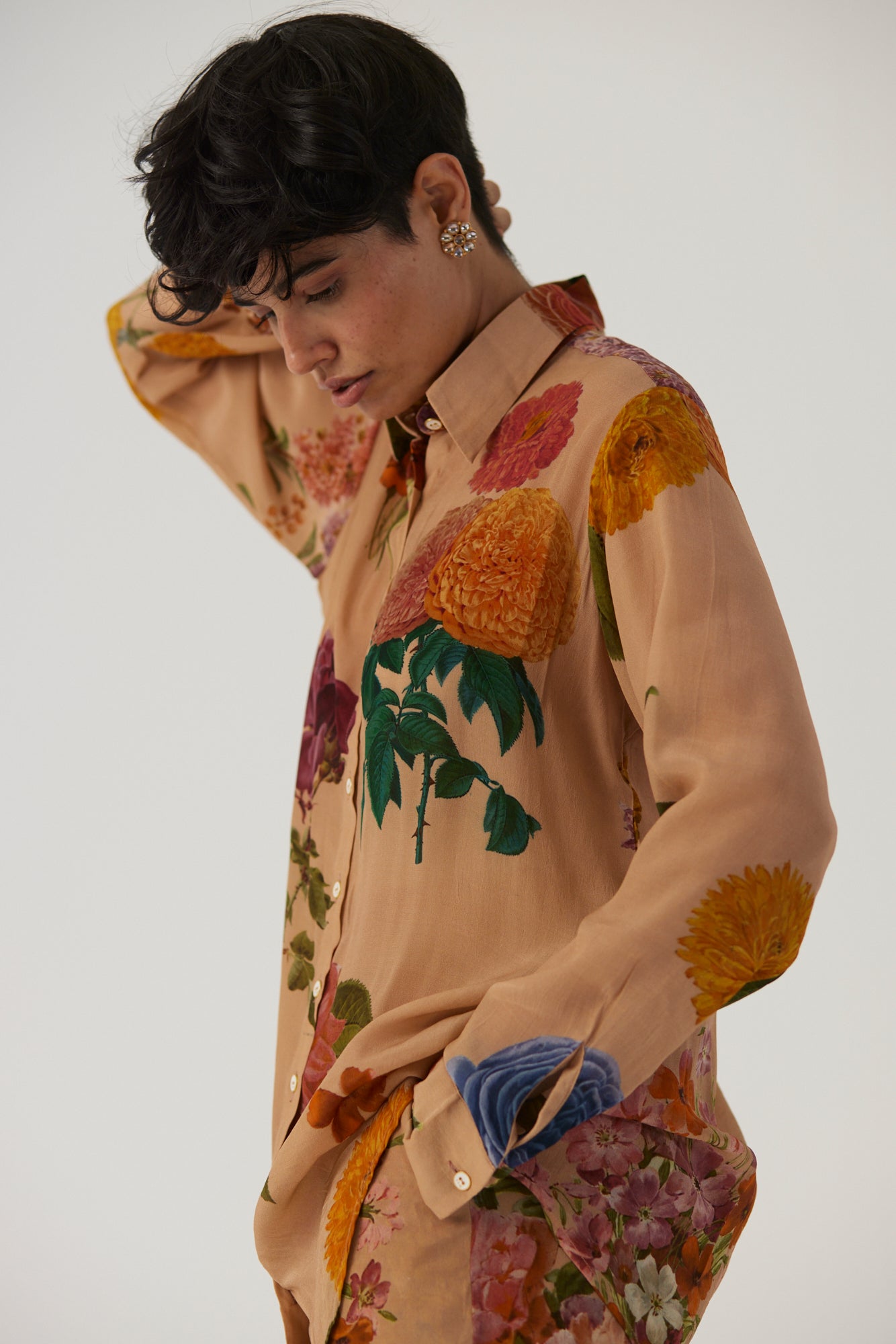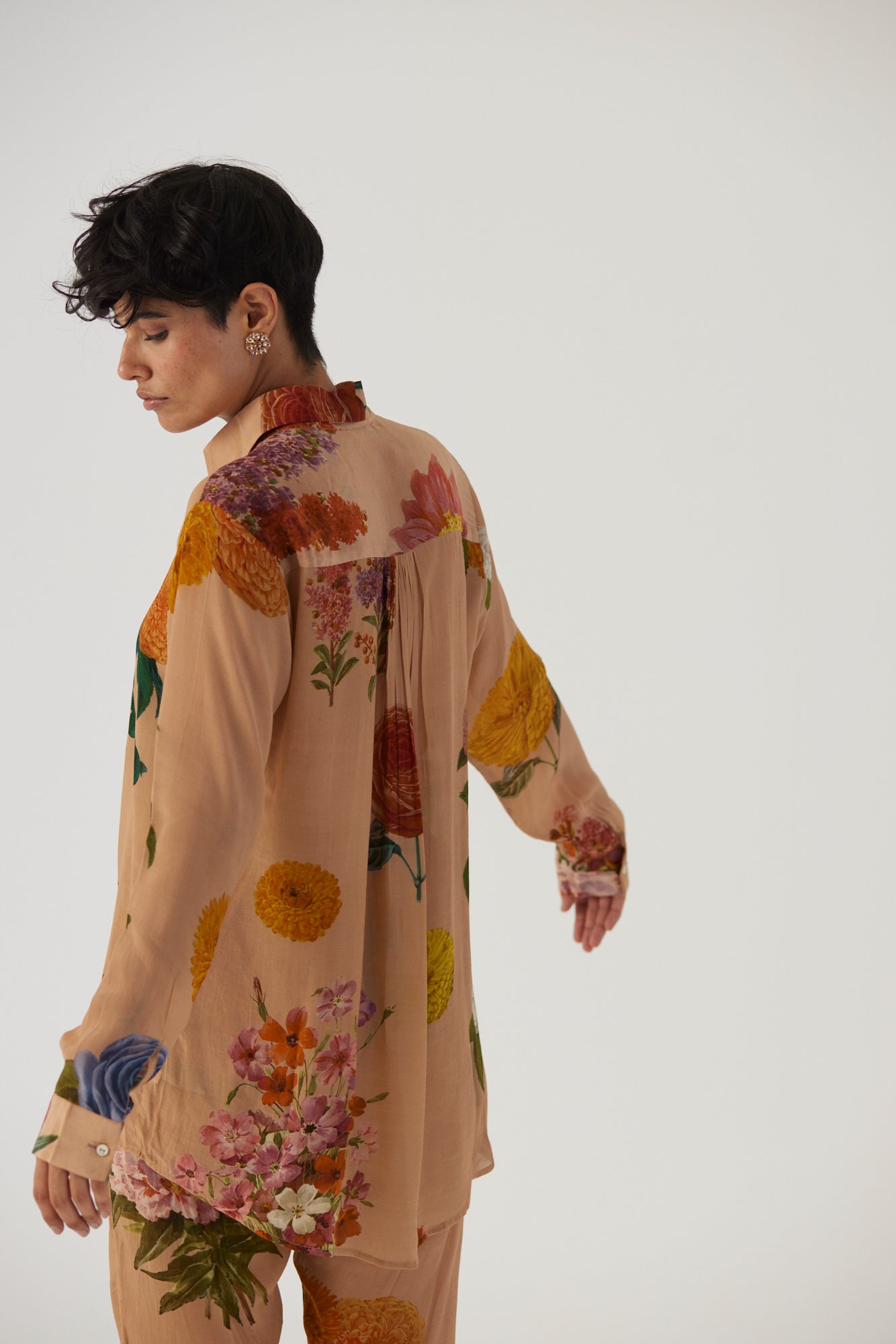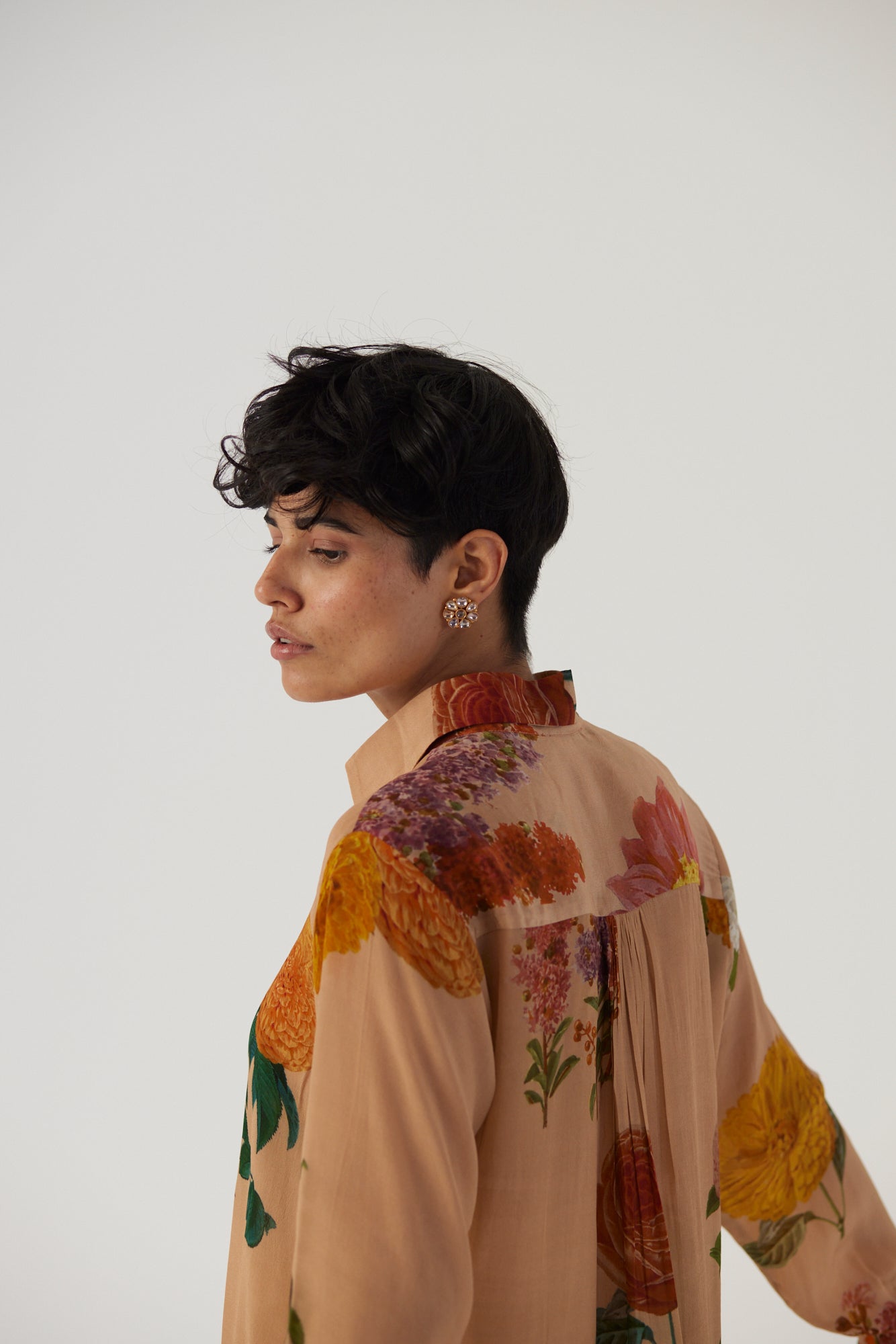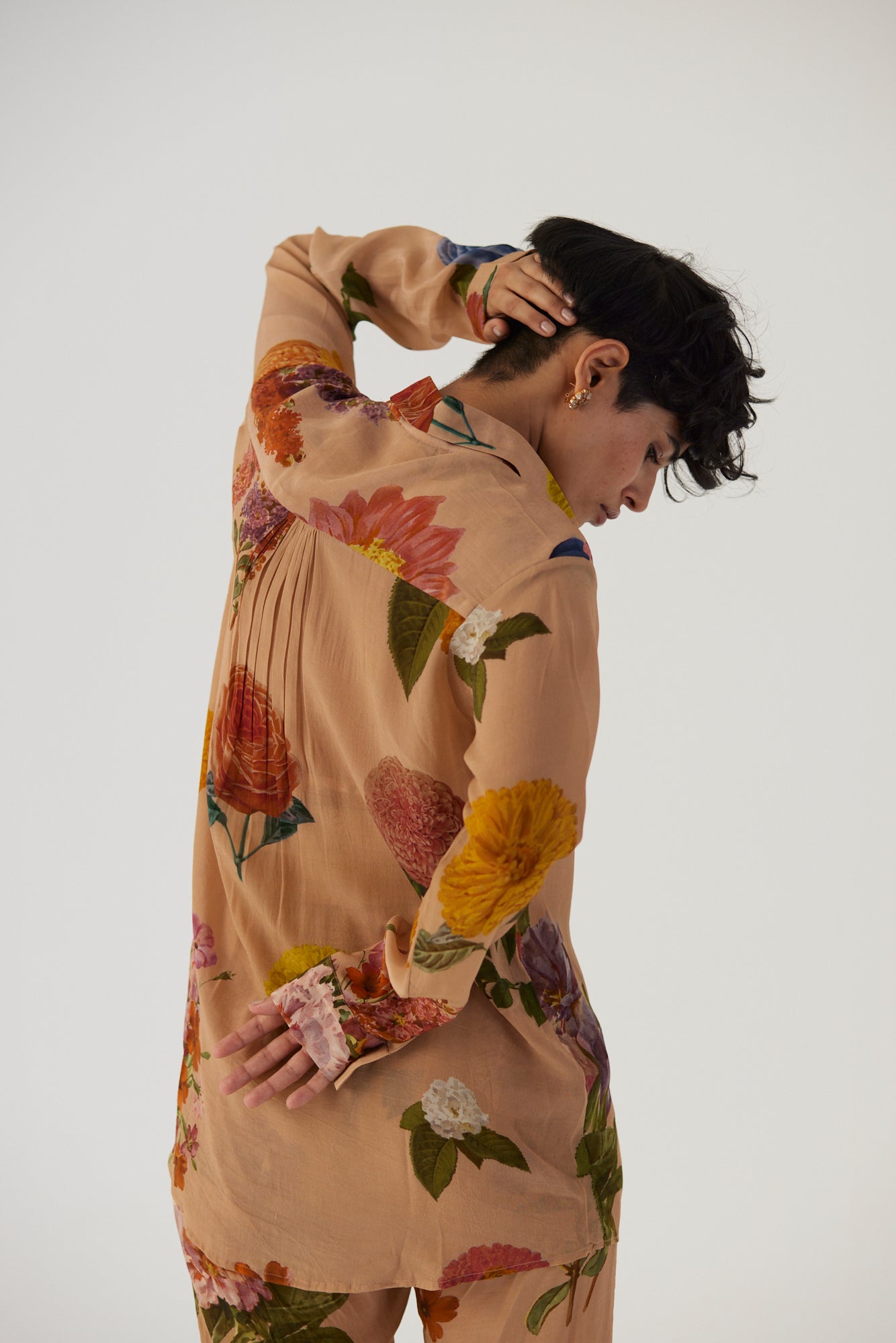 The vintage garden print inspired from an old botanical tapestry is just a breath-taking collection of a botanical garden. Watercolor florals and leaves s are playfully dancing on a beige background. All with the touch of vintage. The set includes a button down shirt with back gathers and straight pants.
