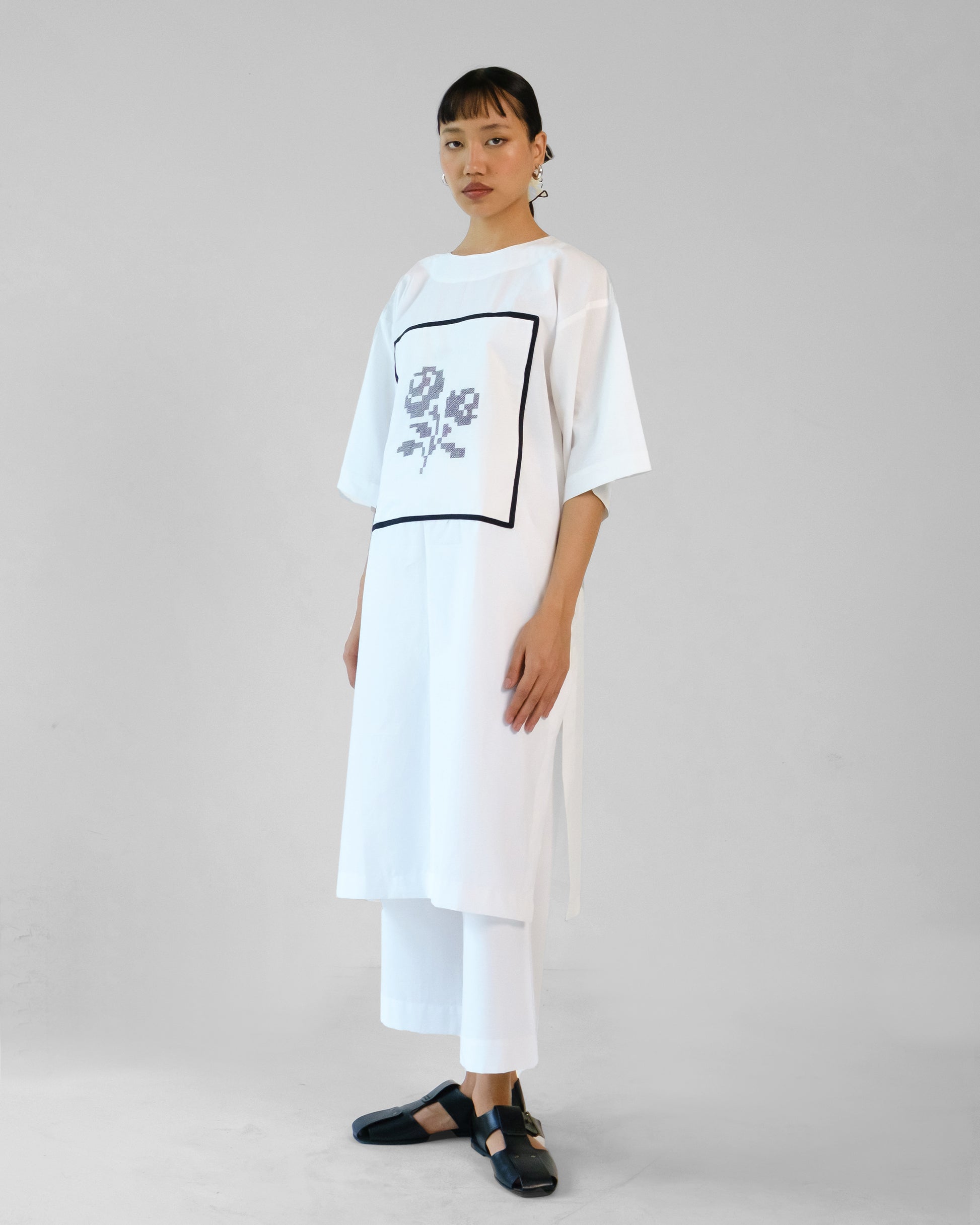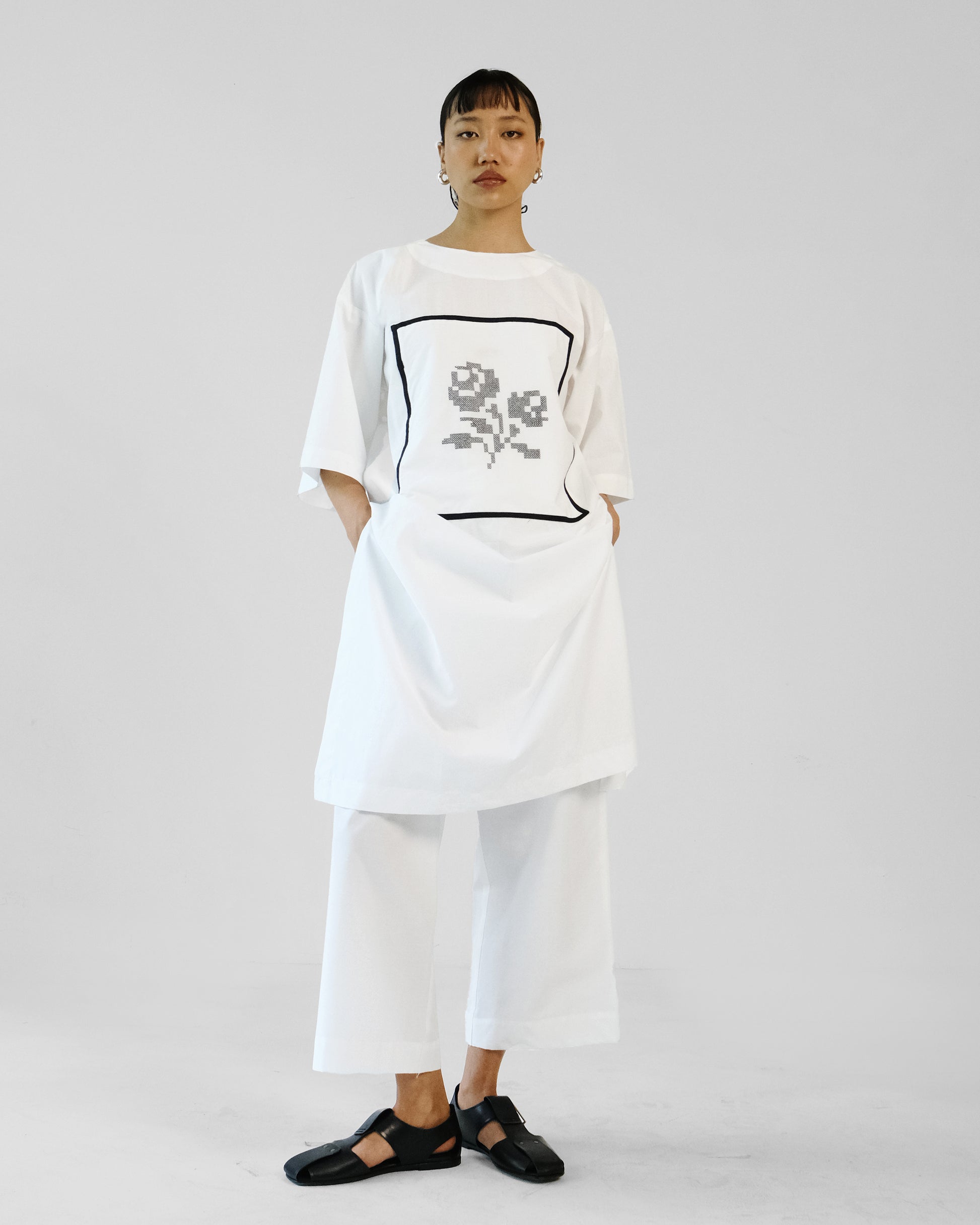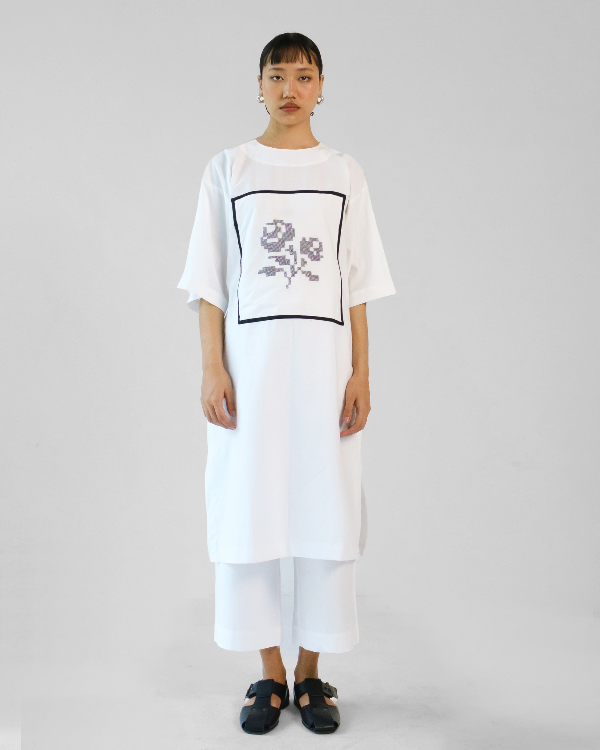 This minimal coord set features a tunic and pants in a stunning White colour, accented with delicate black colour Cross stitch embroidery details. Pant has a fully elasticated waist.