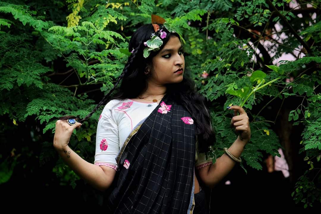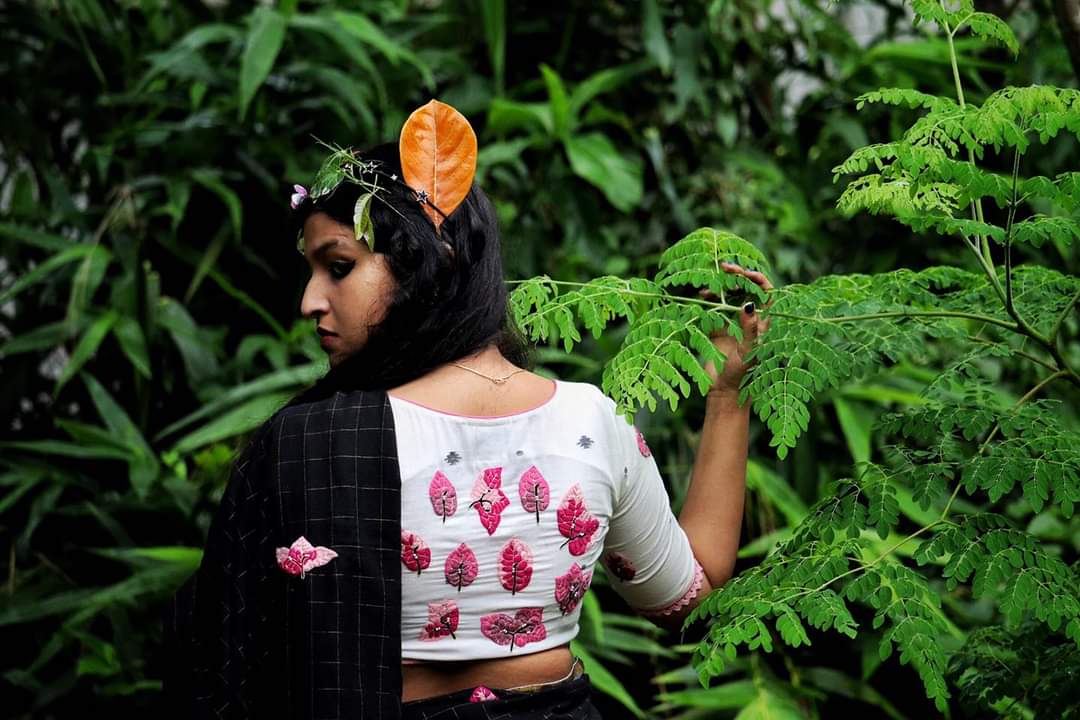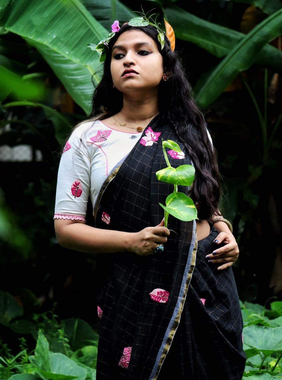 On handwoven white Jamdani, Bougainvillea petals are hand embroidered with little pearl details.