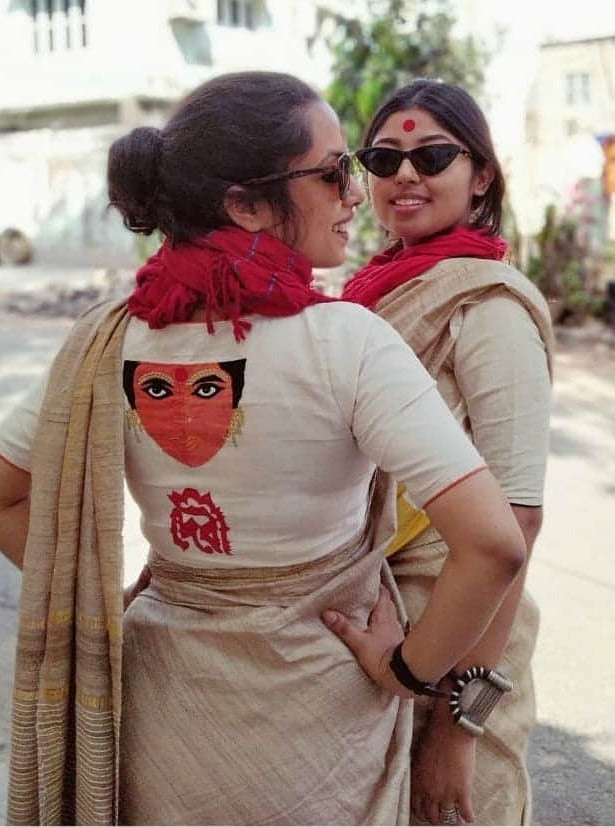 On white jamdani cotton, the Satyajit Ray movie poster is recreated on applique and embroidery. One of Parama bestsellers.