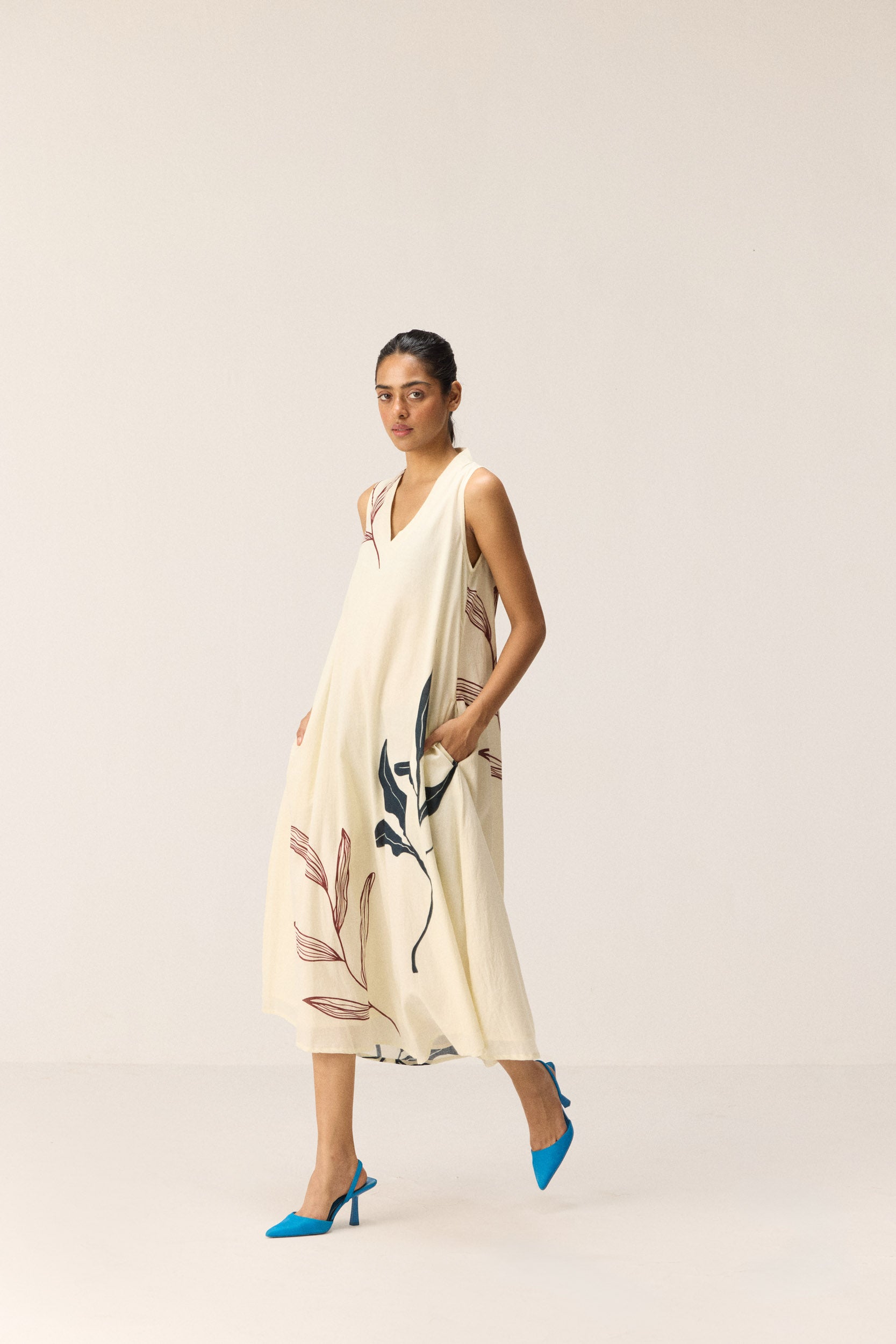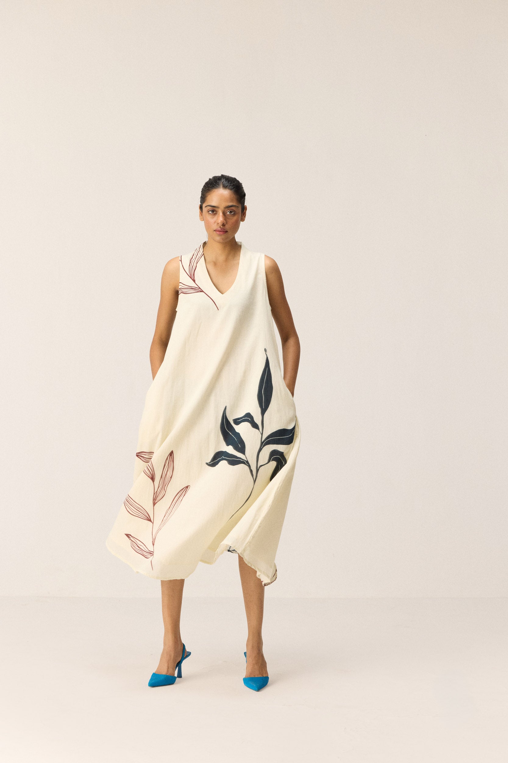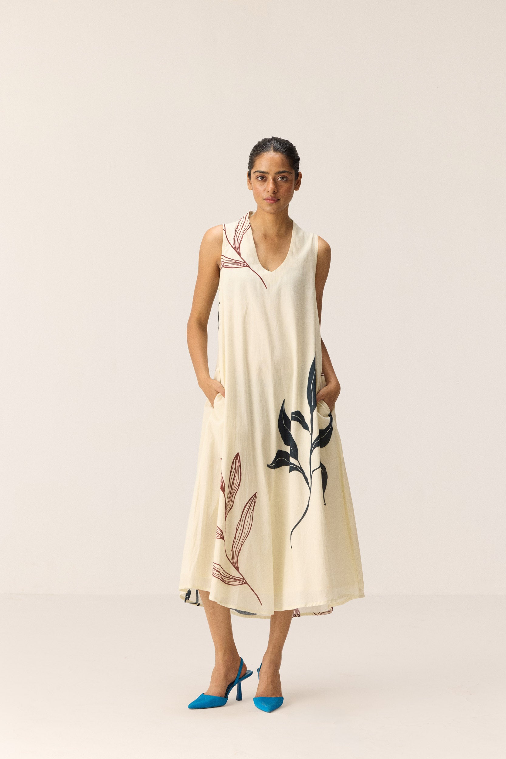 A classic Khara Kapas silhouette in soft white cotton mul, this sleeveless dress features a rounded V-neck and practical side pockets. The abstract black and red leaf print adds a bold, modern edge to its minimal form.