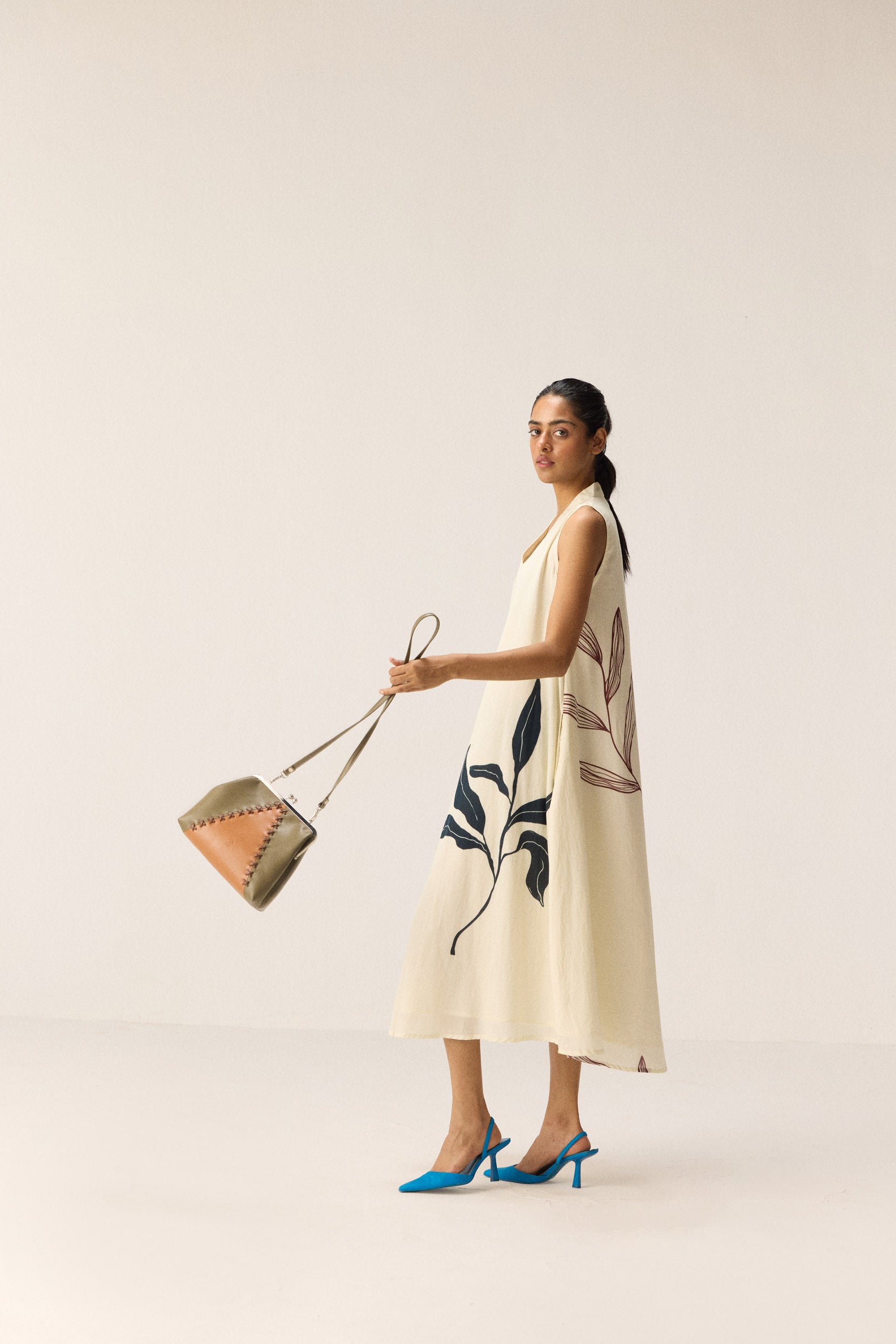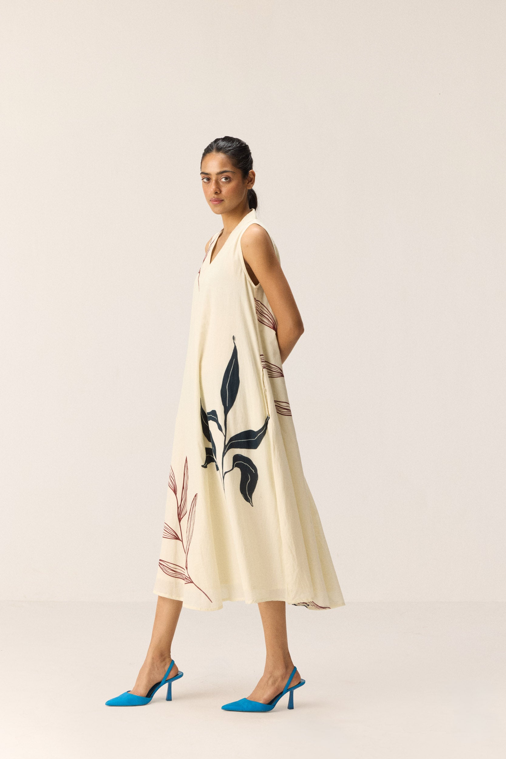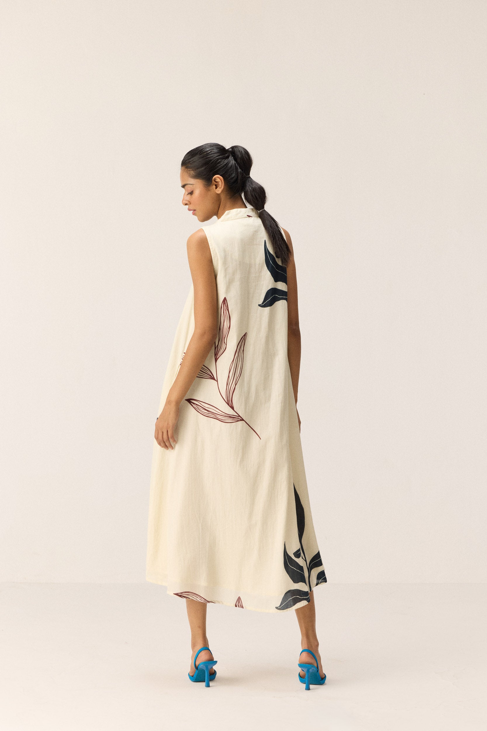 A classic Khara Kapas silhouette in soft white cotton mul, this sleeveless dress features a rounded V-neck and practical side pockets. The abstract black and red leaf print adds a bold, modern edge to its minimal form.