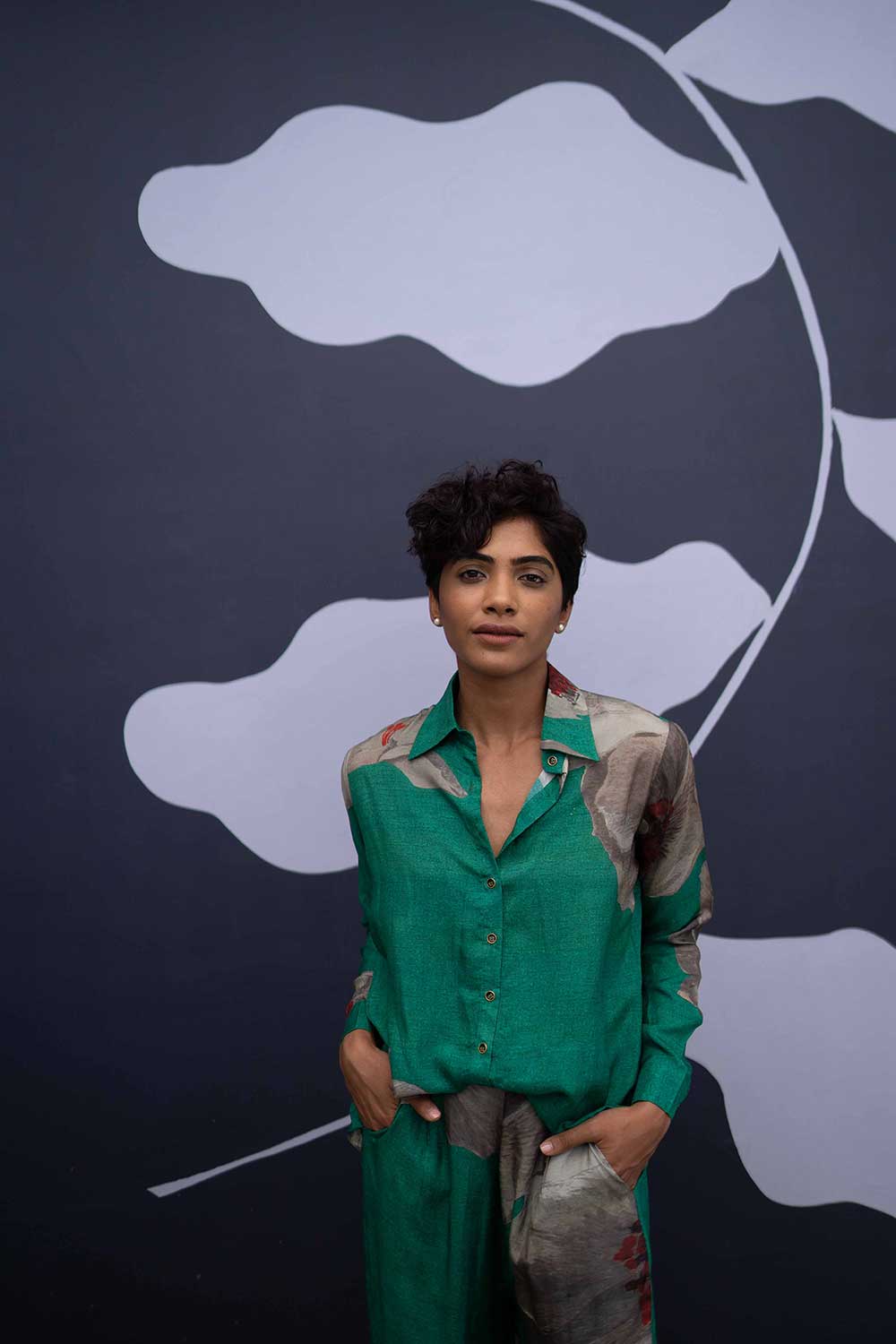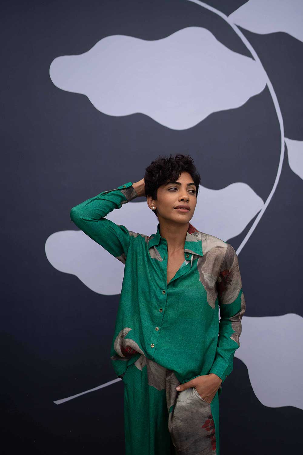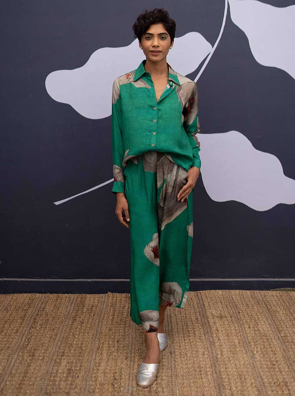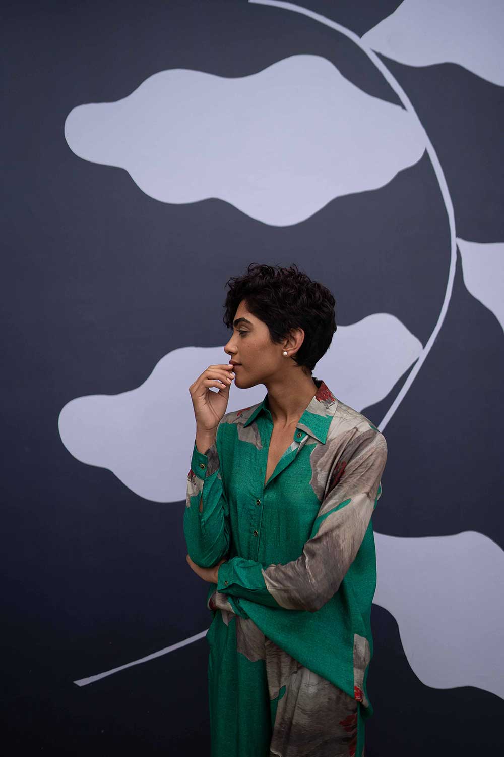 The set is crafted in a unique green colour with massive white poppies carefully printed on dora silk.