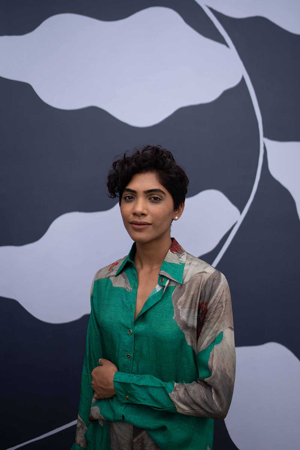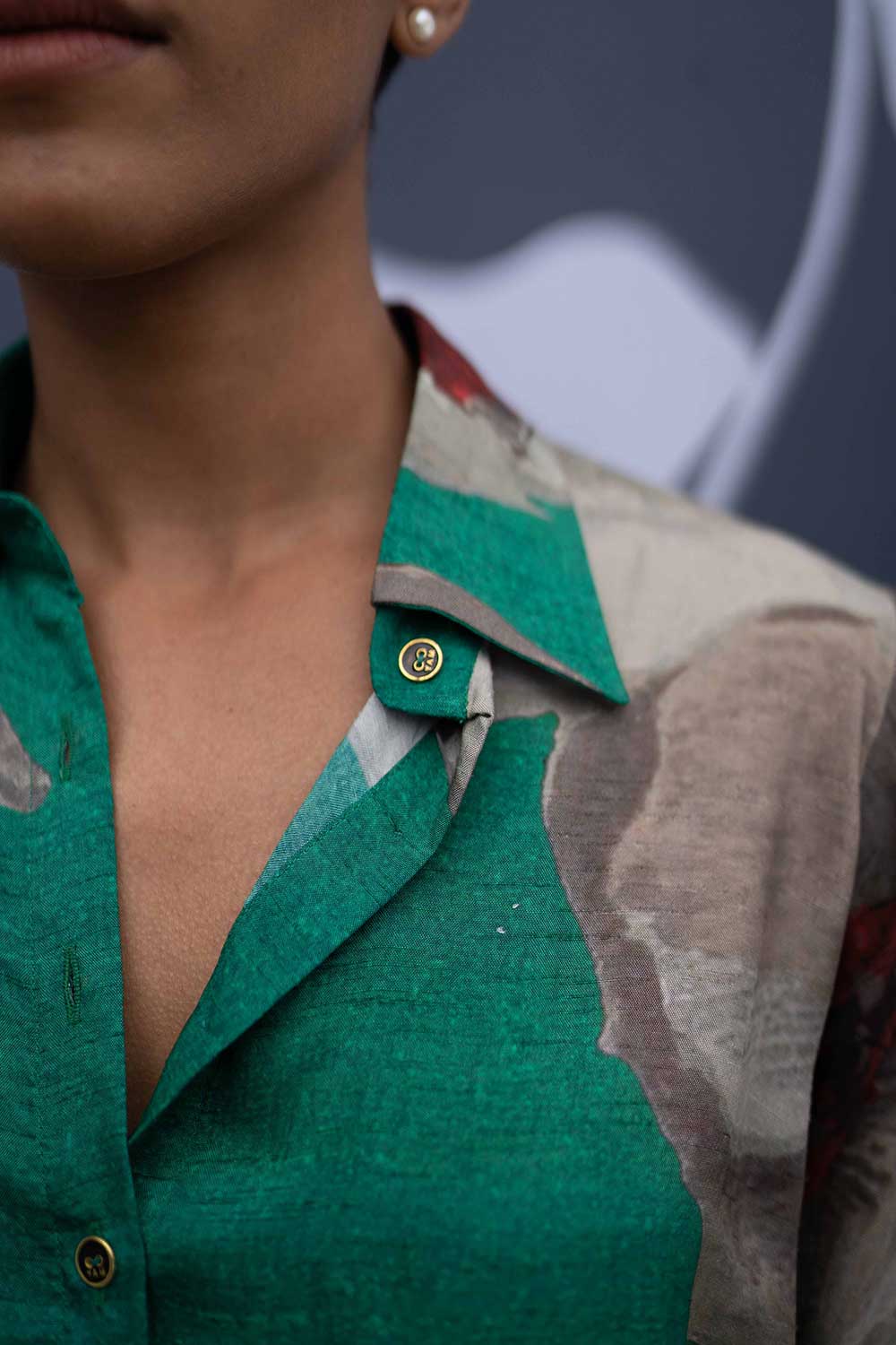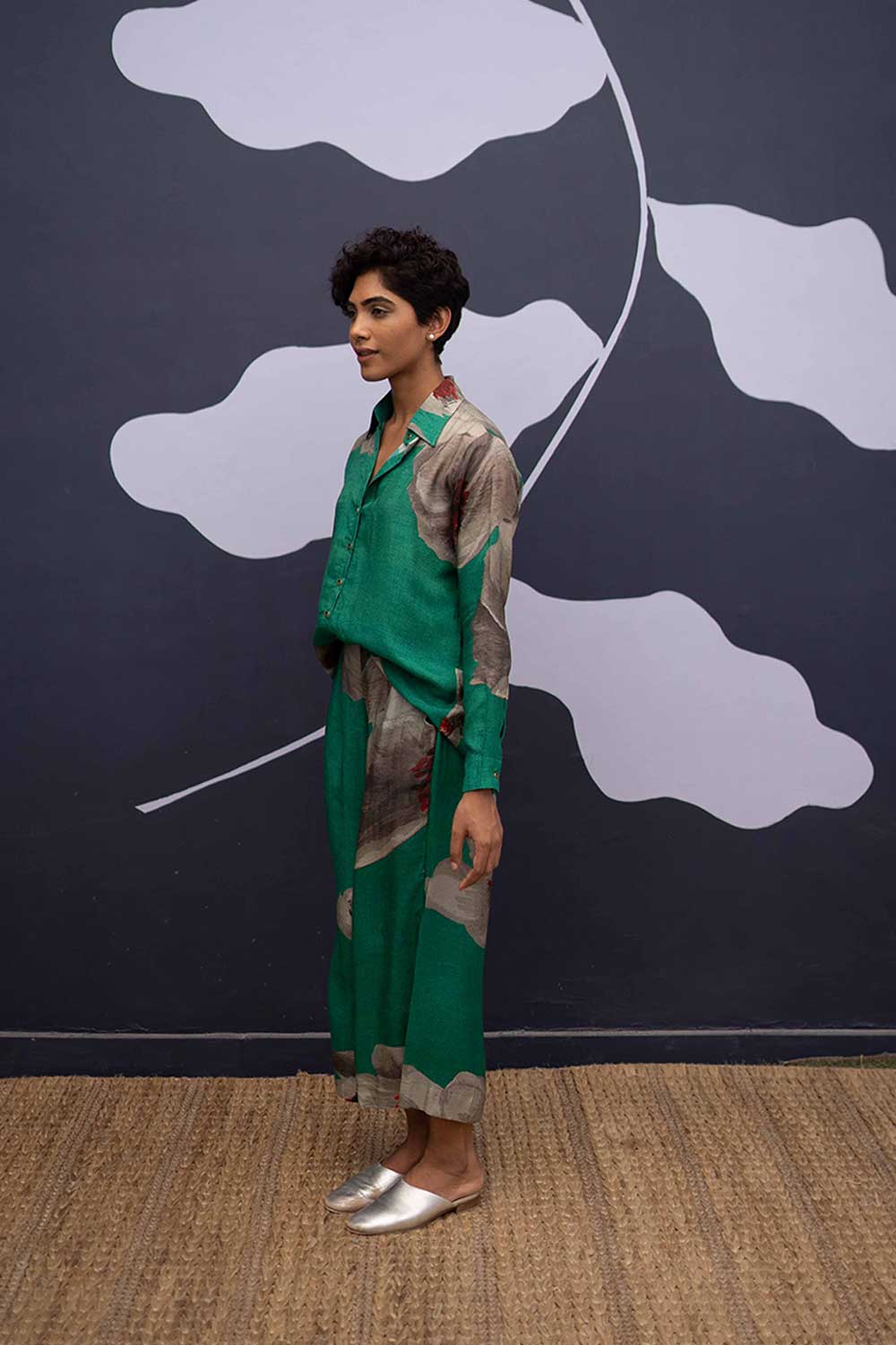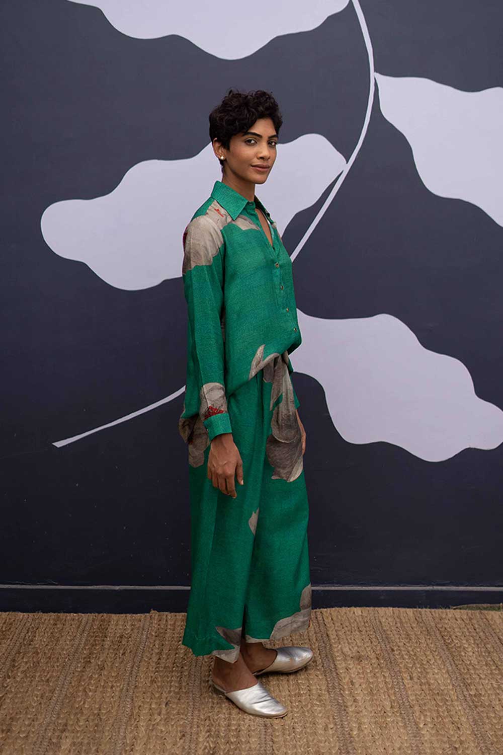 The set is crafted in a unique green colour with massive white poppies carefully printed on dora silk.
