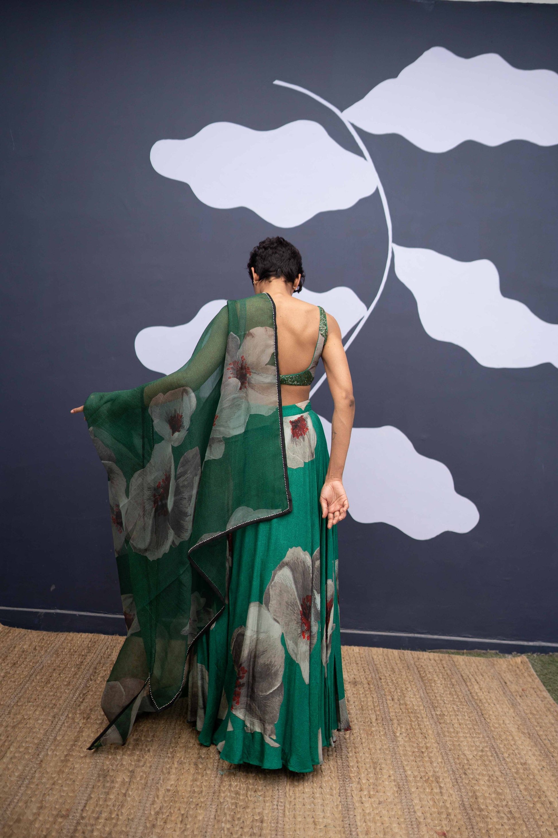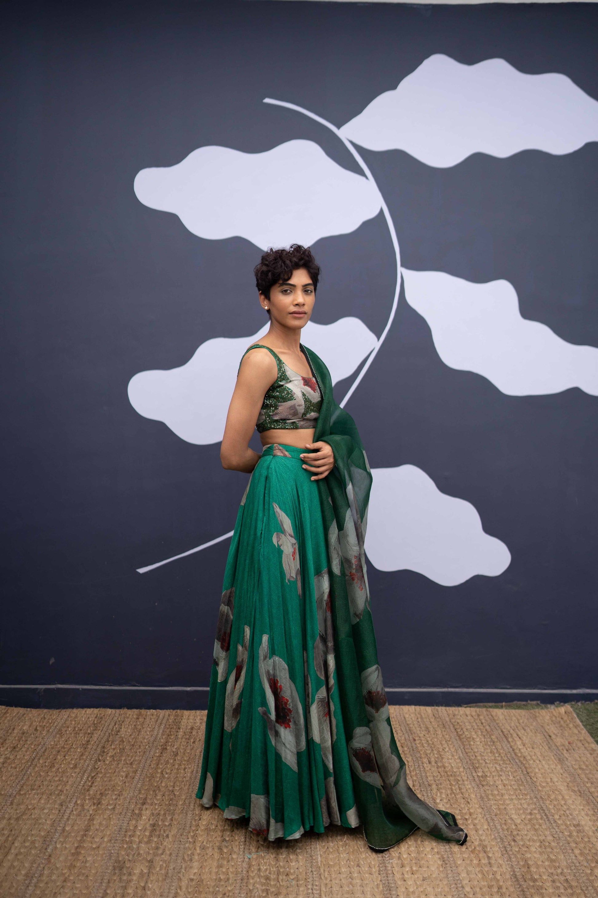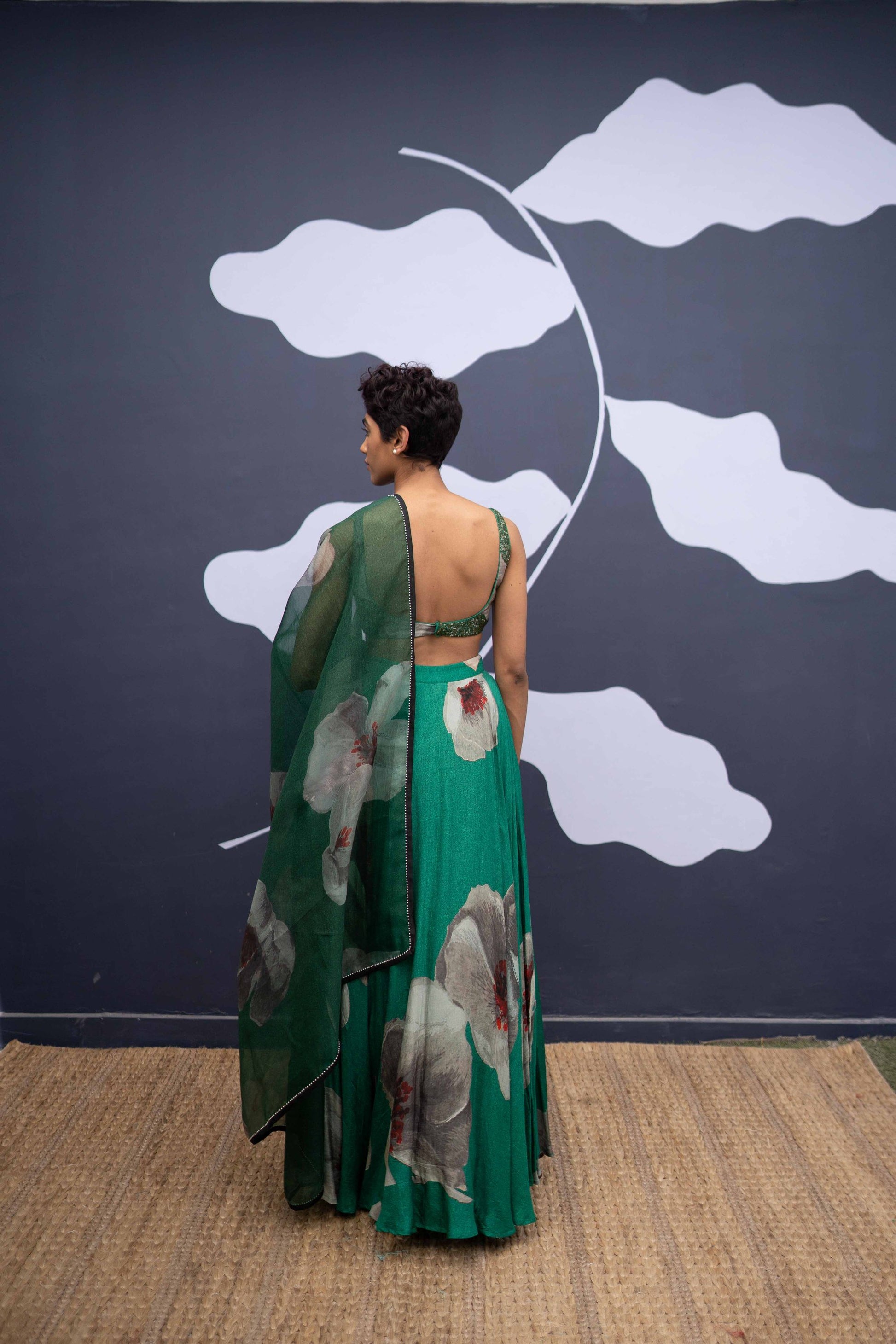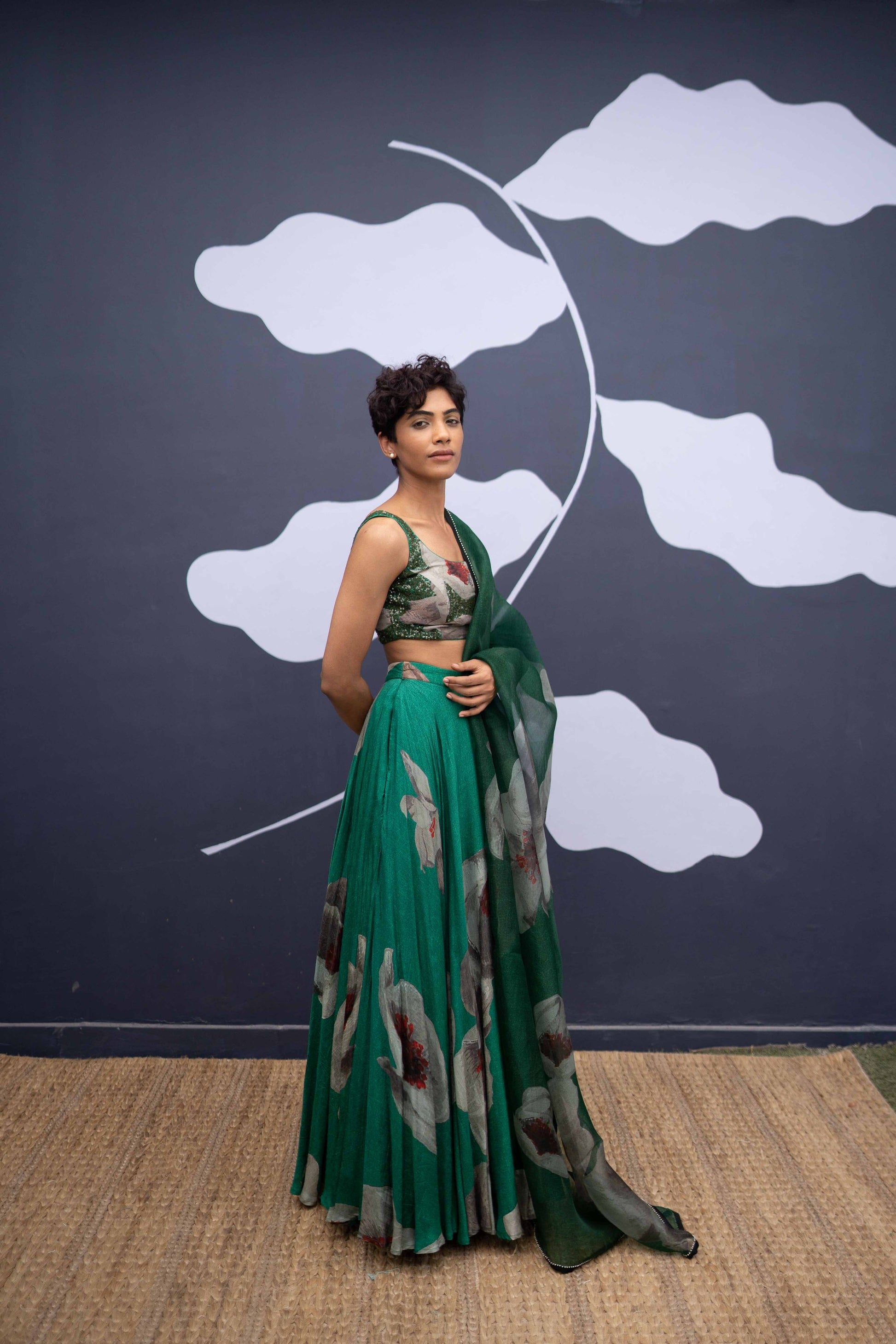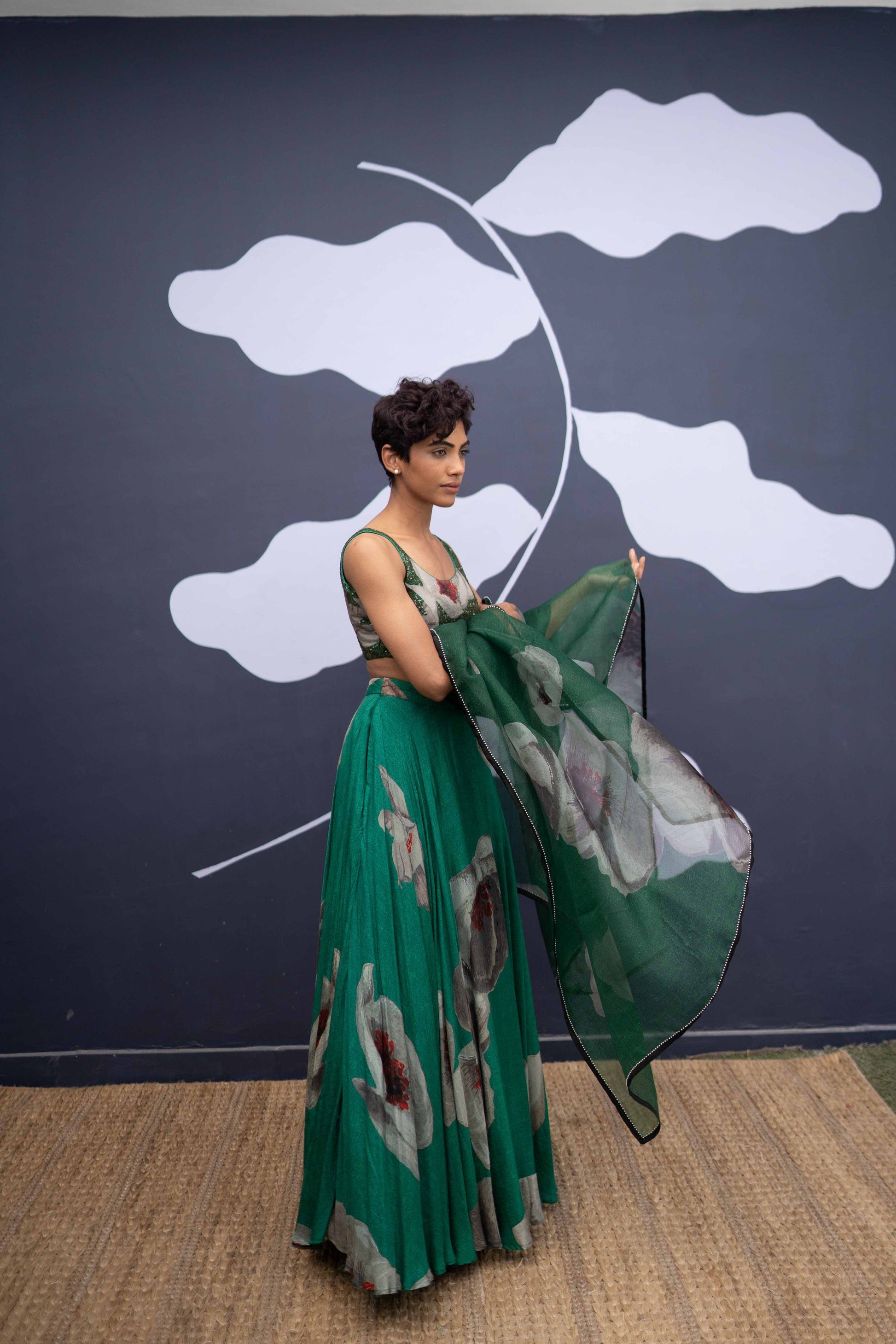 The Lehenga is crafted in a unique green color with massive white poppies carefully printed on luxe pure silk organza.