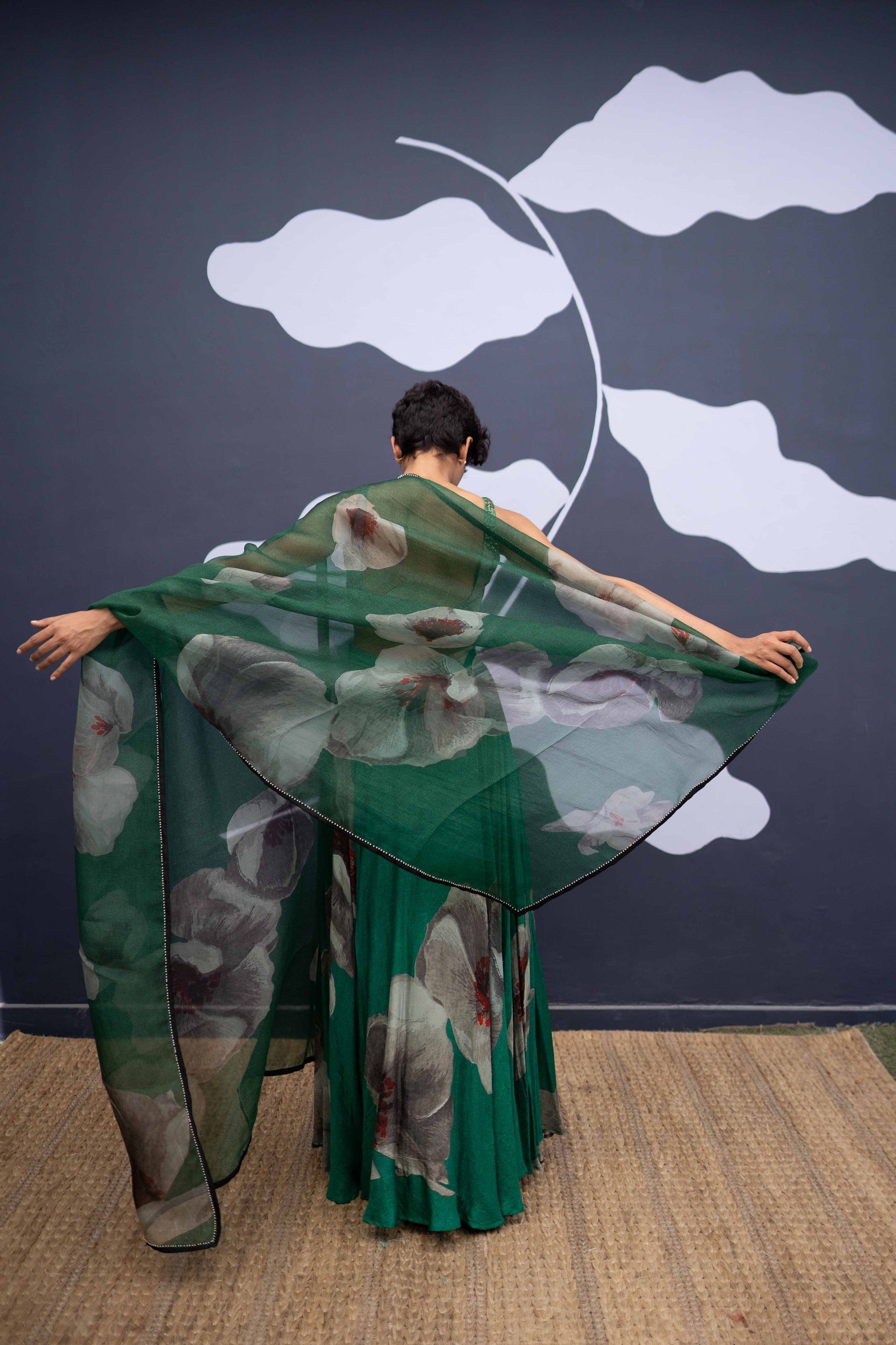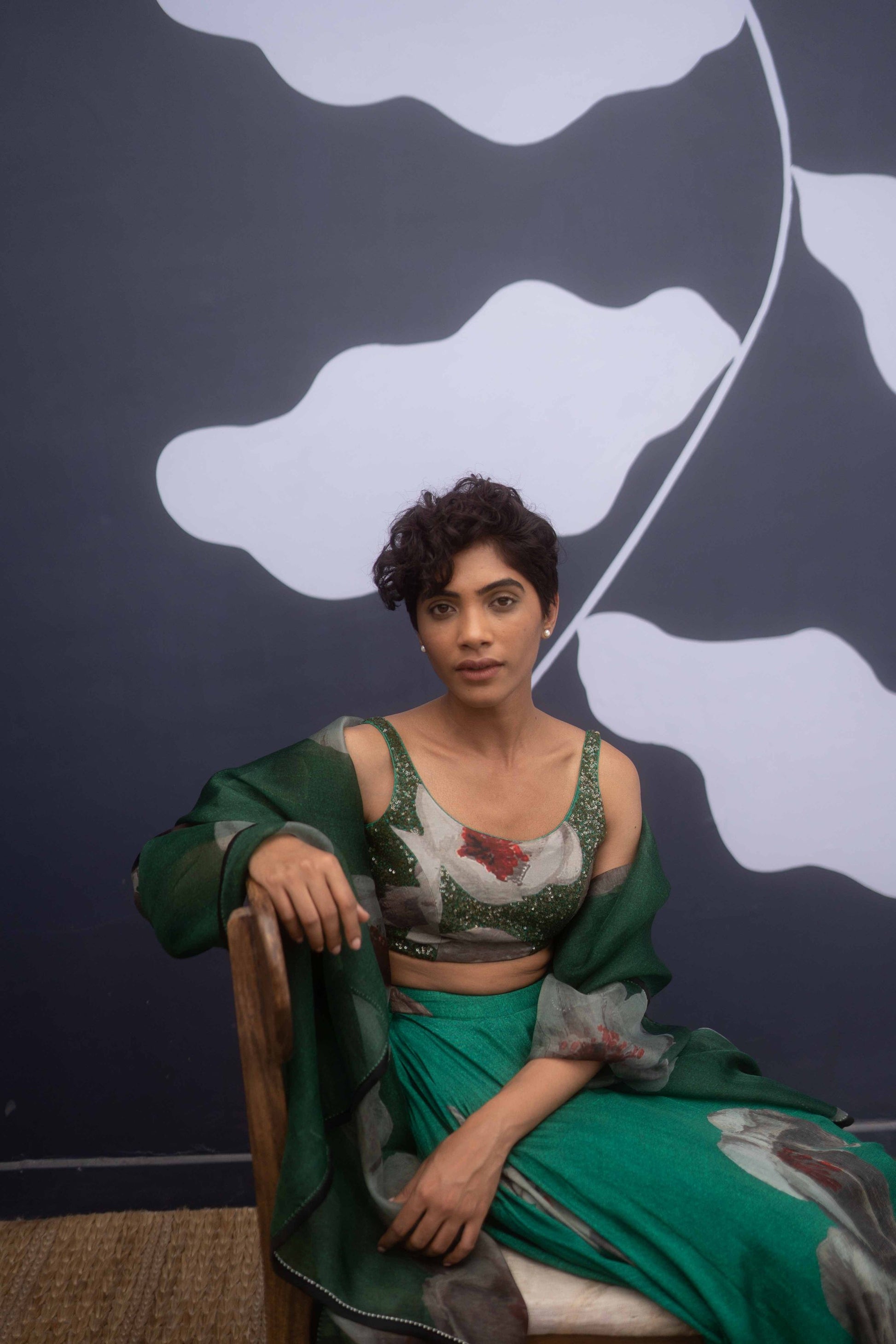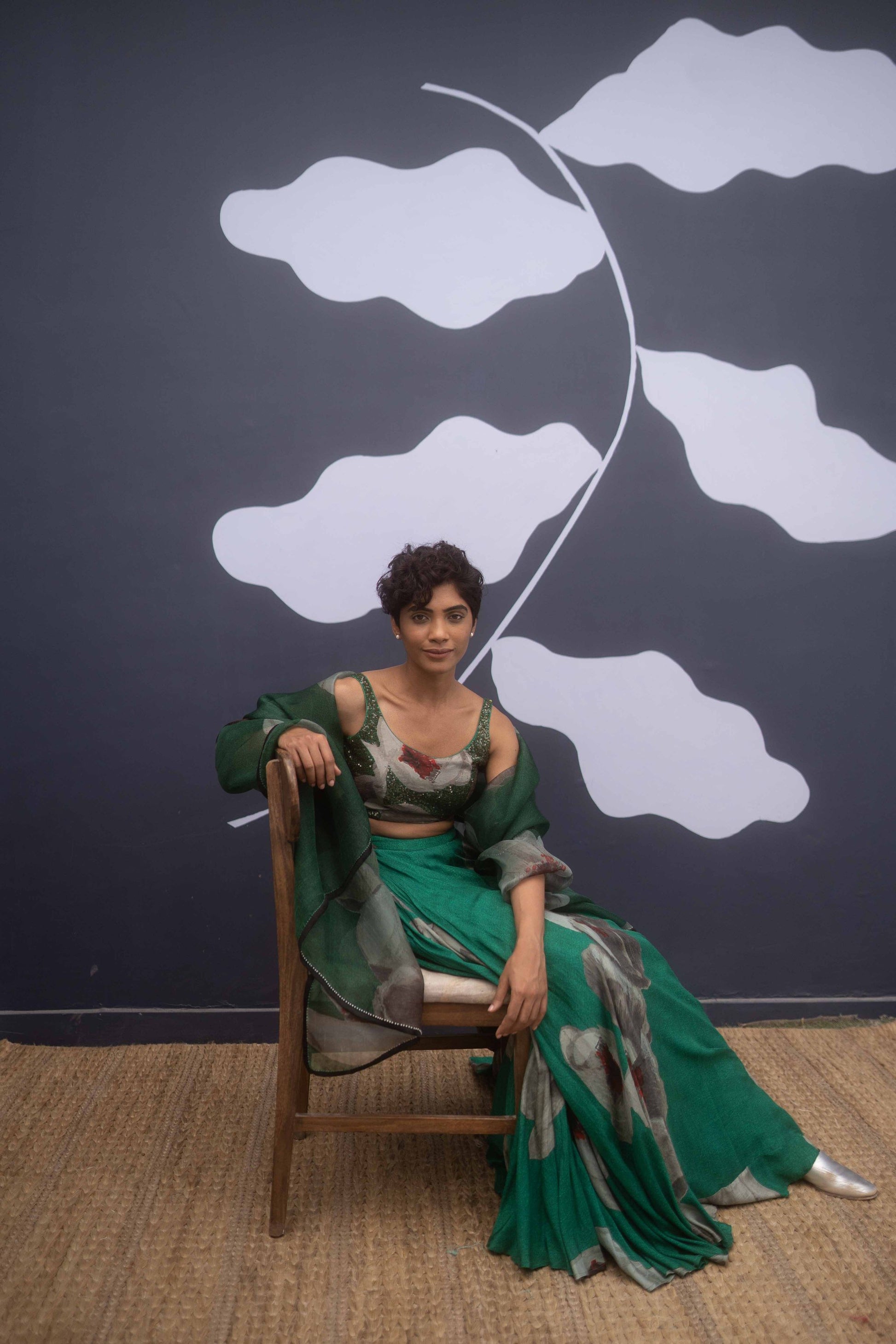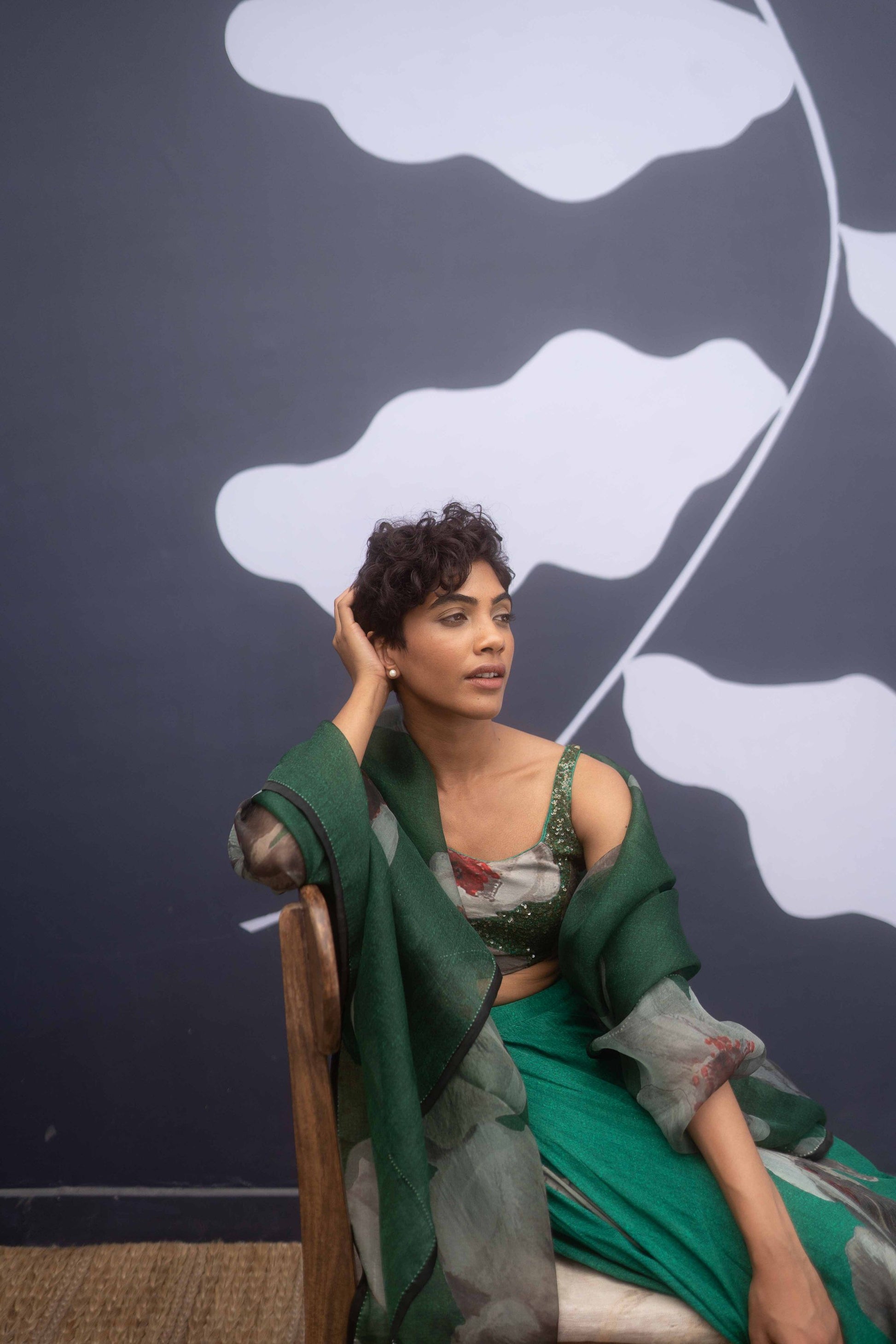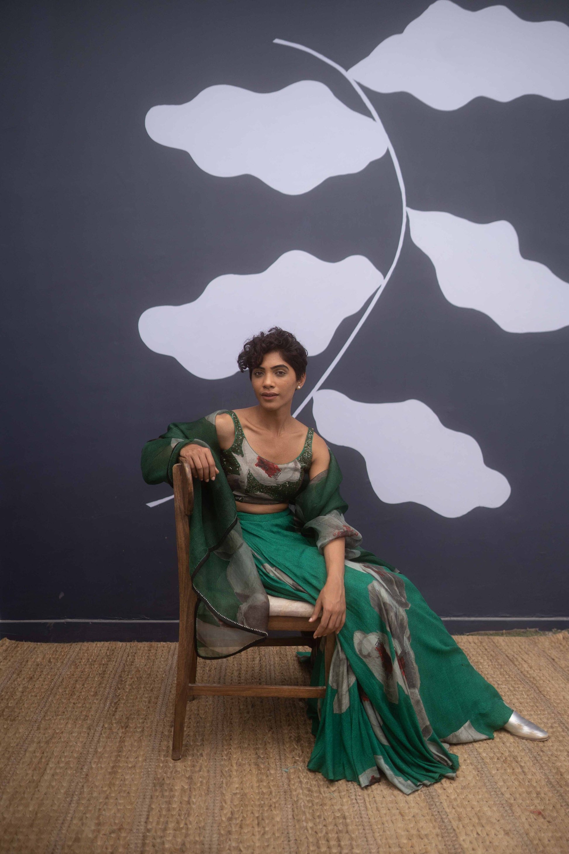 The Lehenga is crafted in a unique green color with massive white poppies carefully printed on luxe pure silk organza.