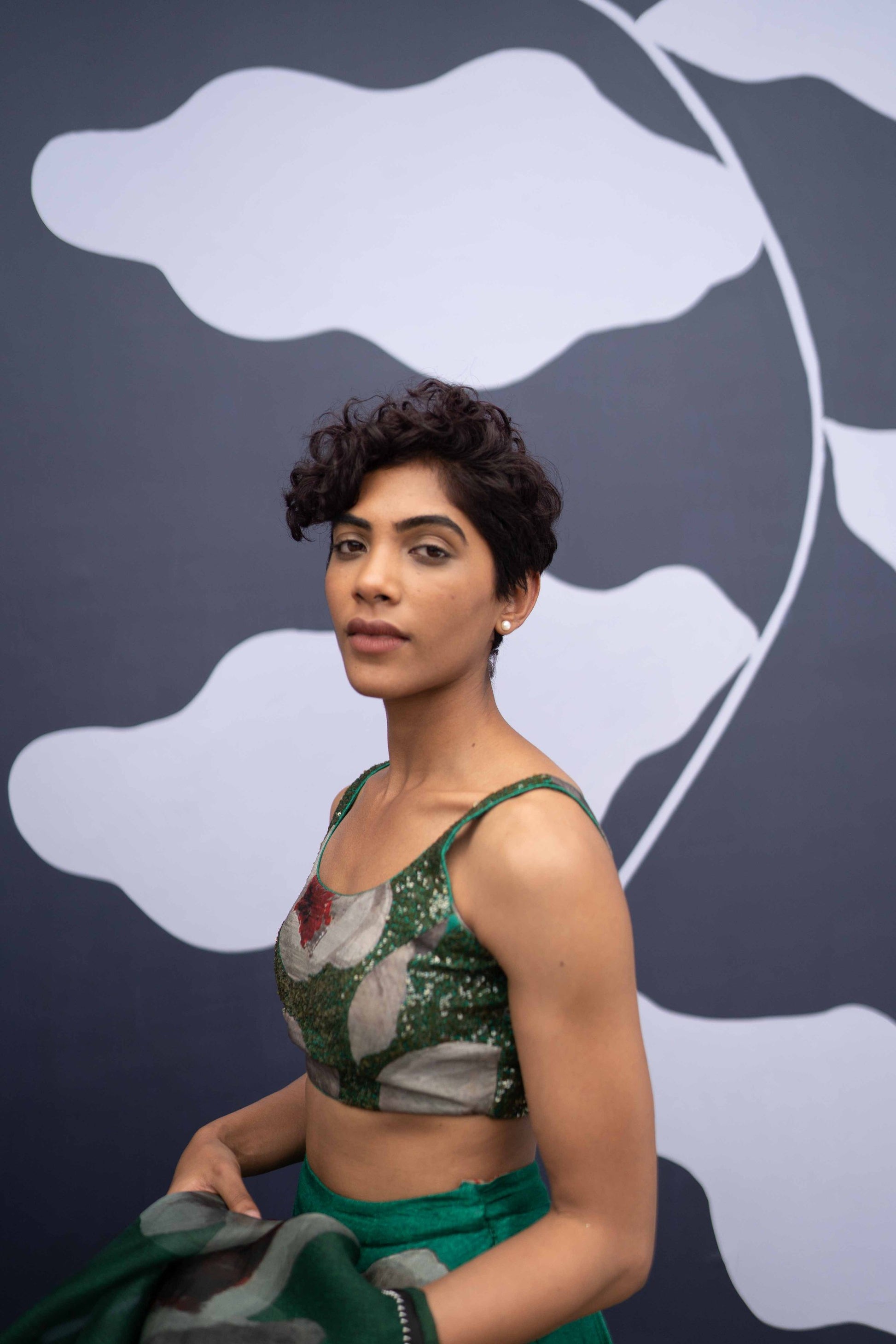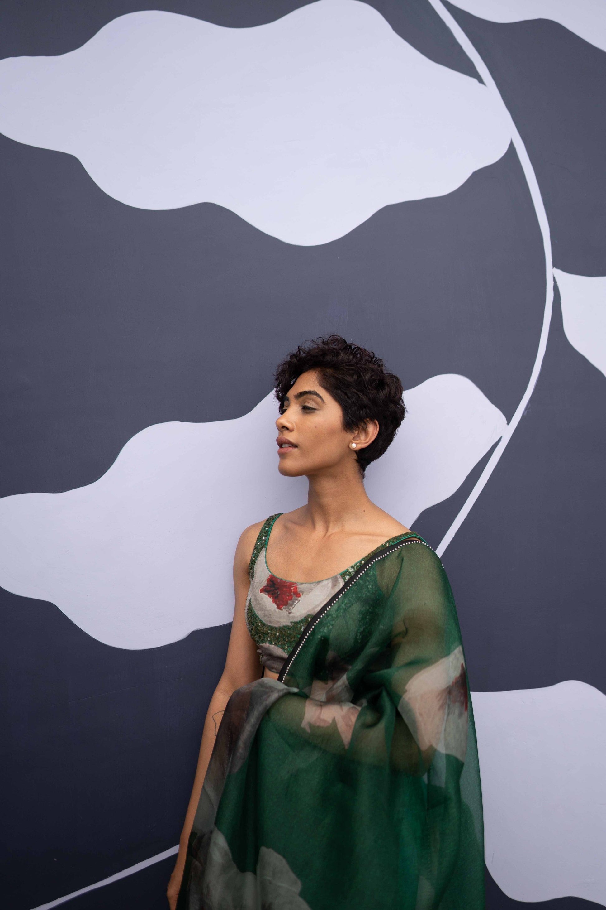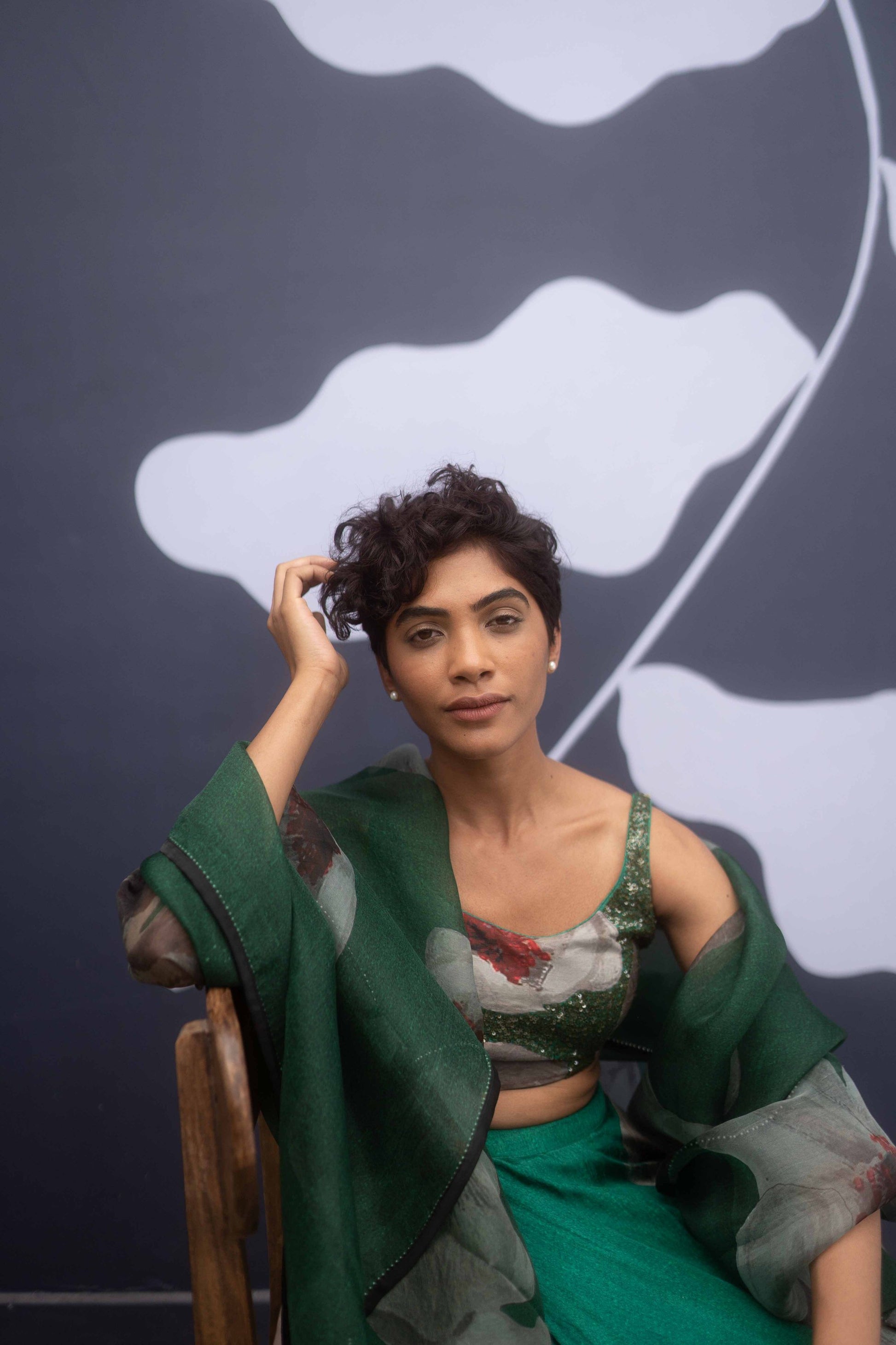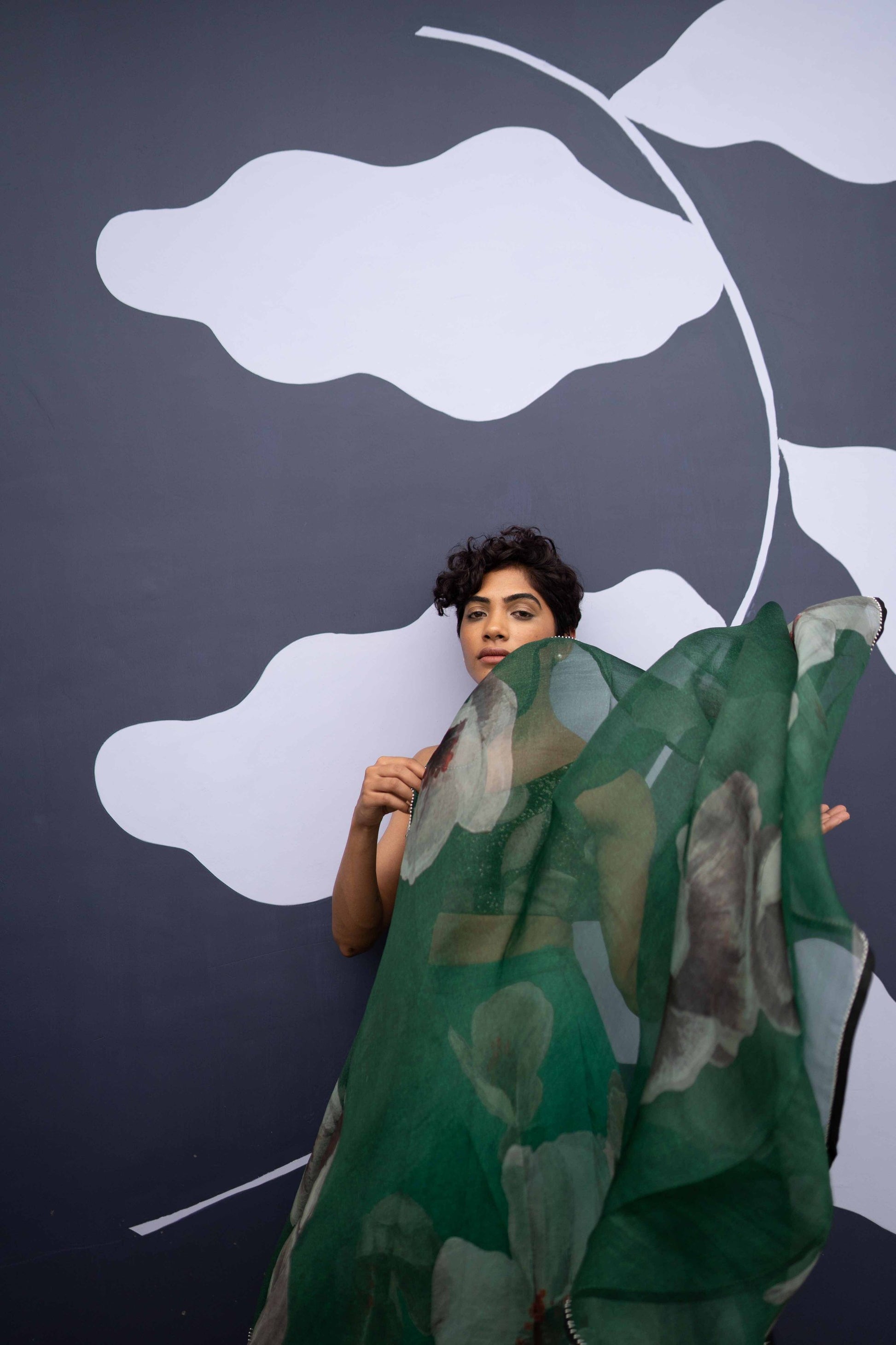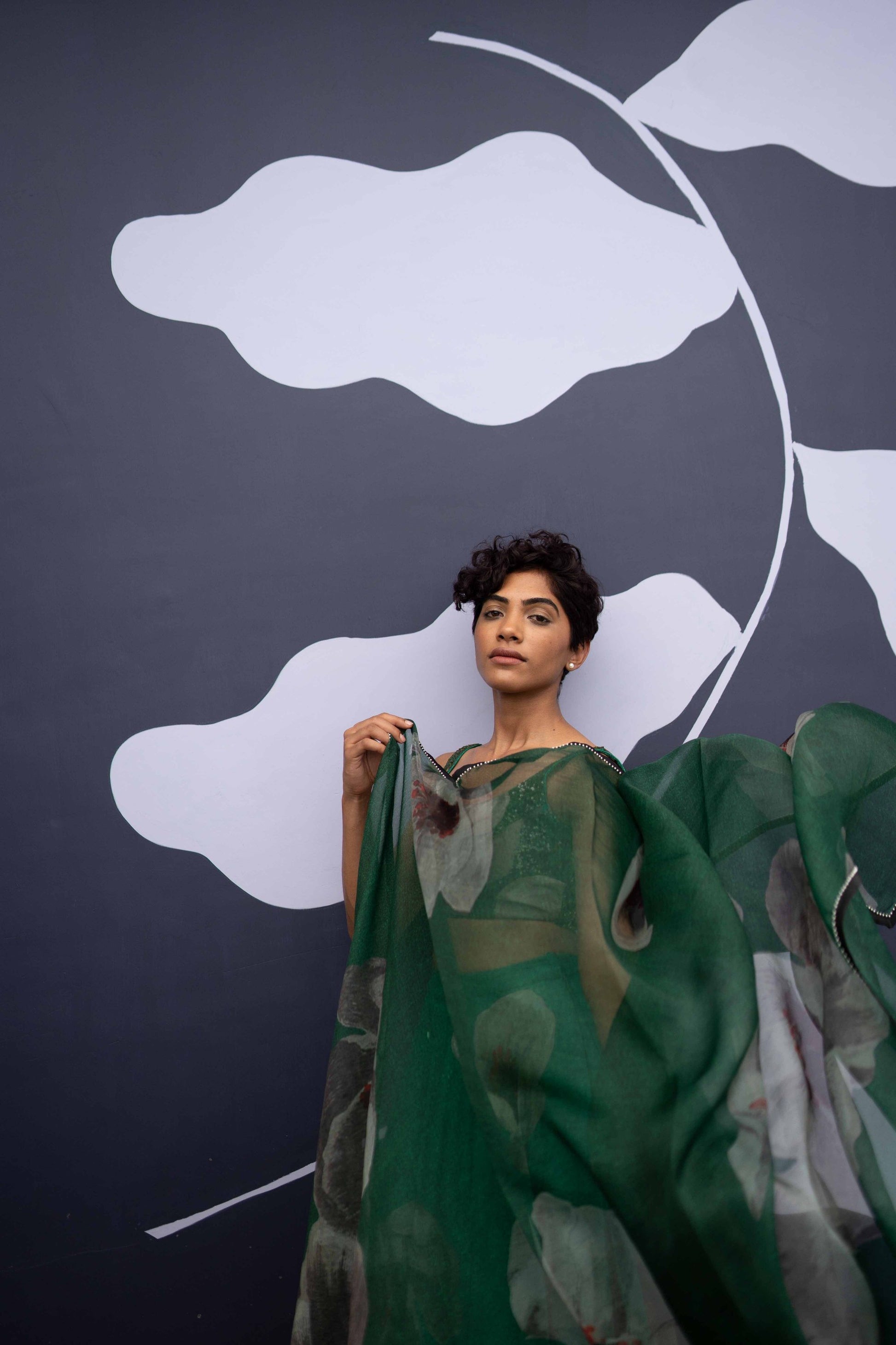 The Lehenga is crafted in a unique green color with massive white poppies carefully printed on luxe pure silk organza.