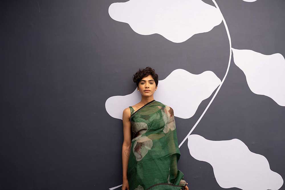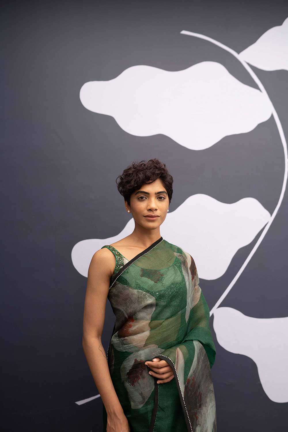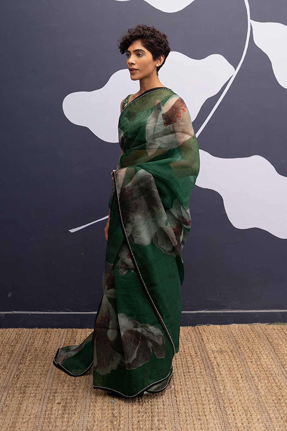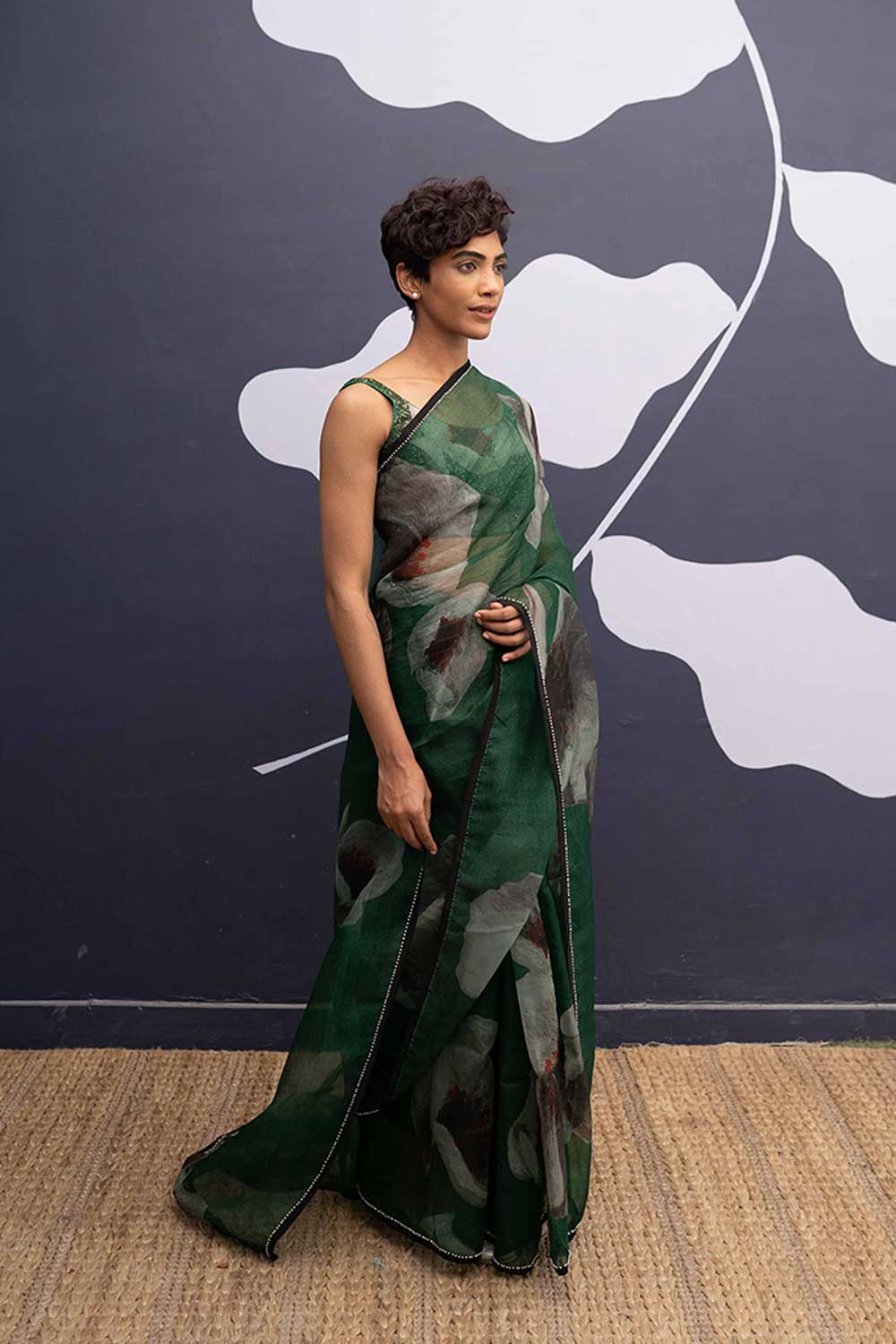 The sari is crafted in a unique green color with massive white poppies carefully printed on luxe pure silk organza.
