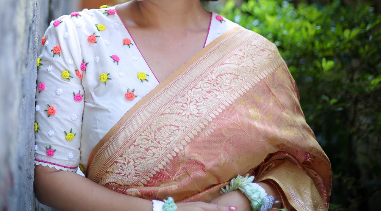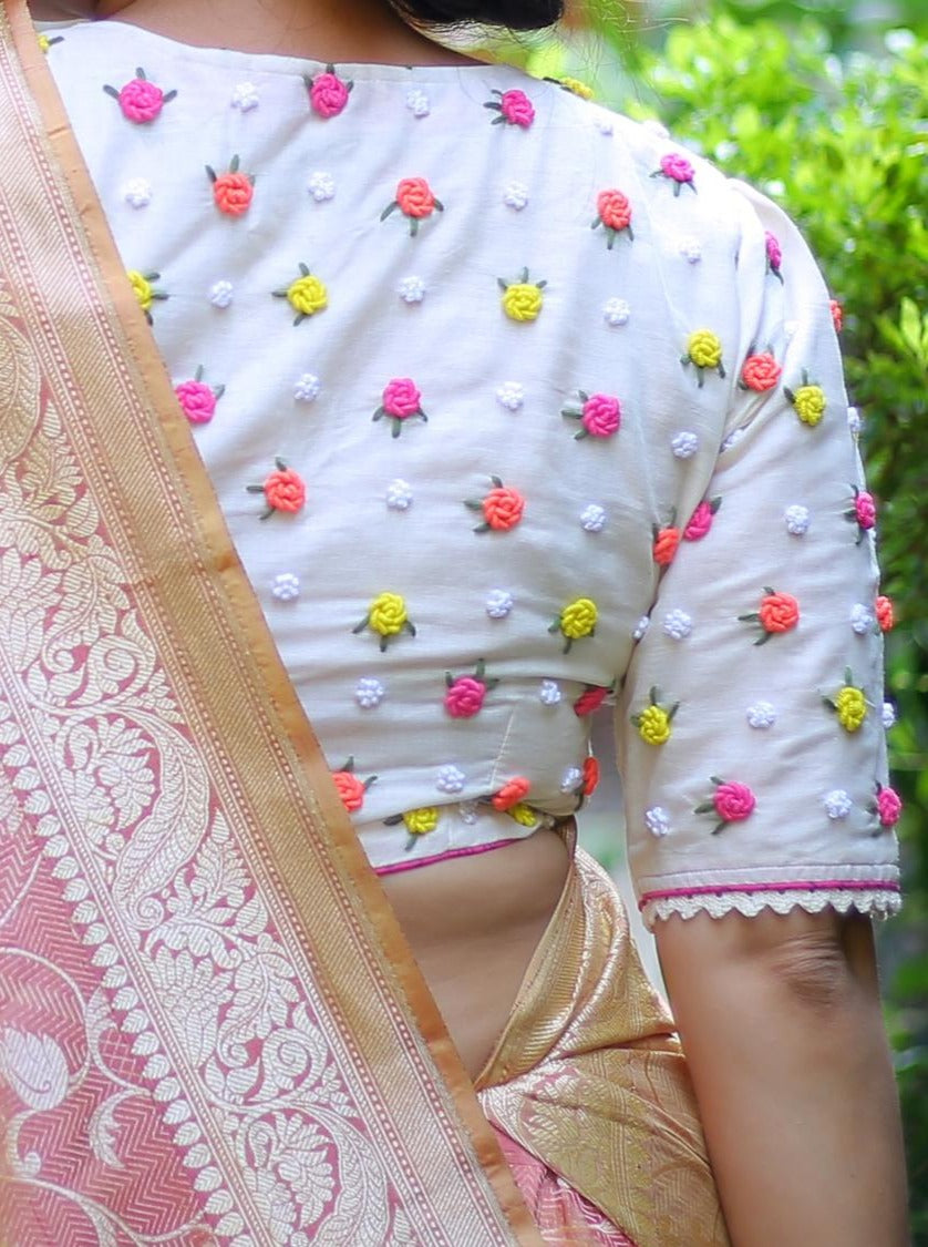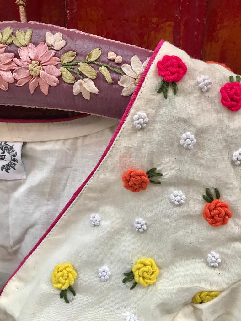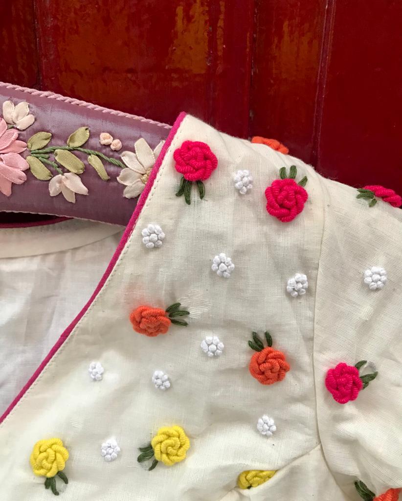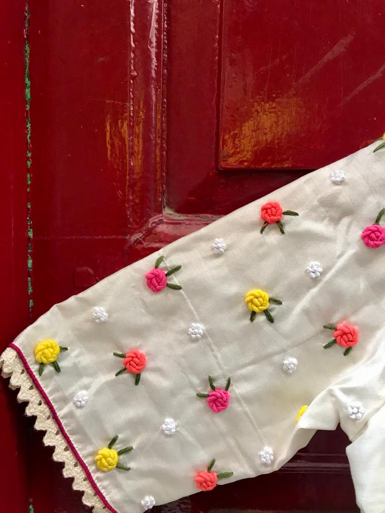On white chanderi, hot pink, tangy orange and canary yellow roses are hand embroidered all over. In between there are white French knot roses on white body.