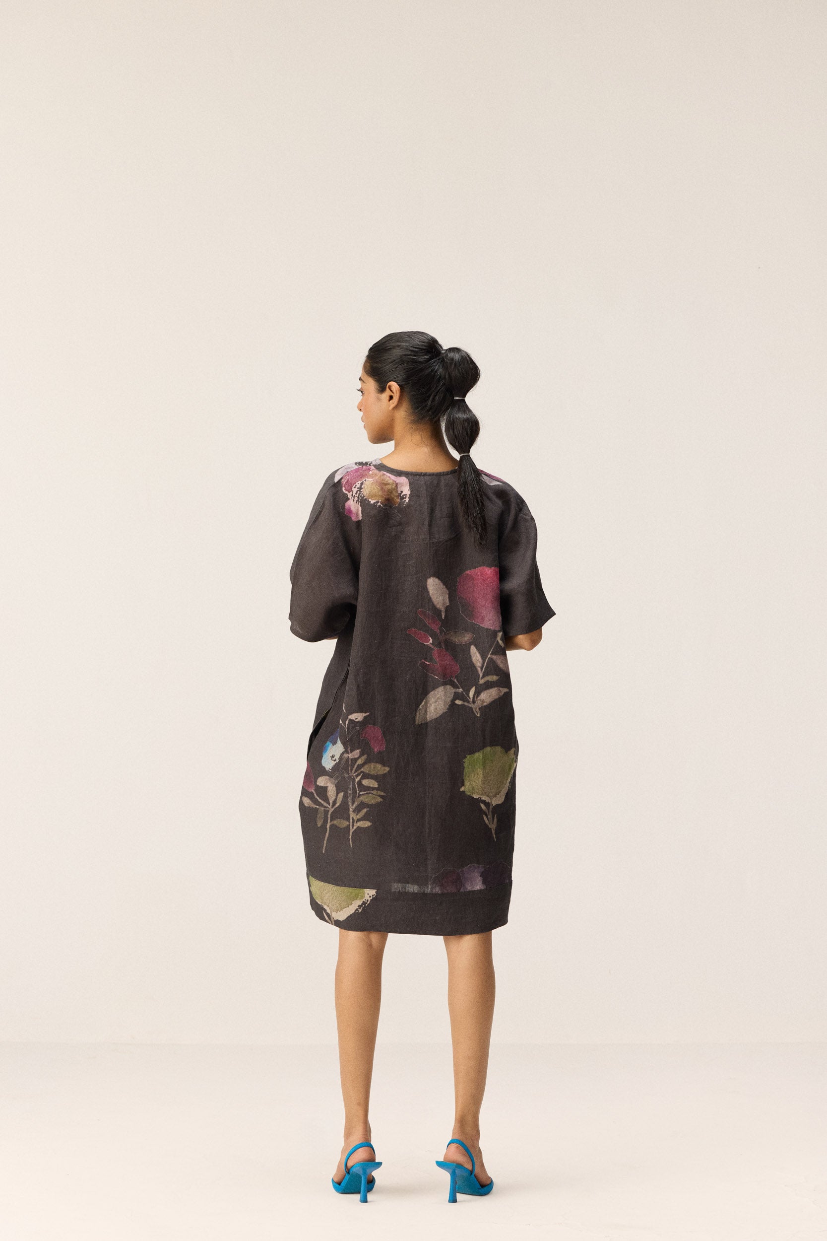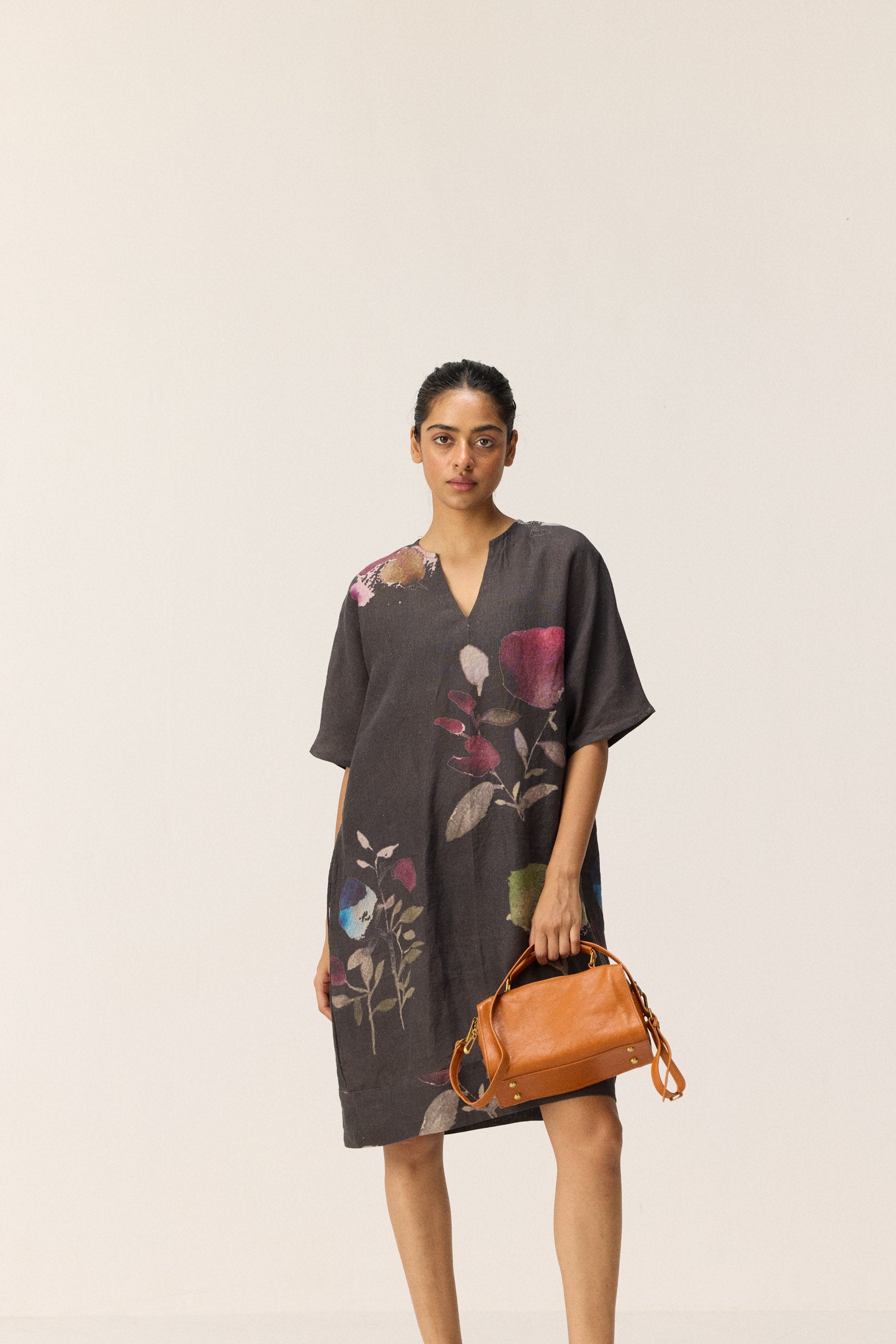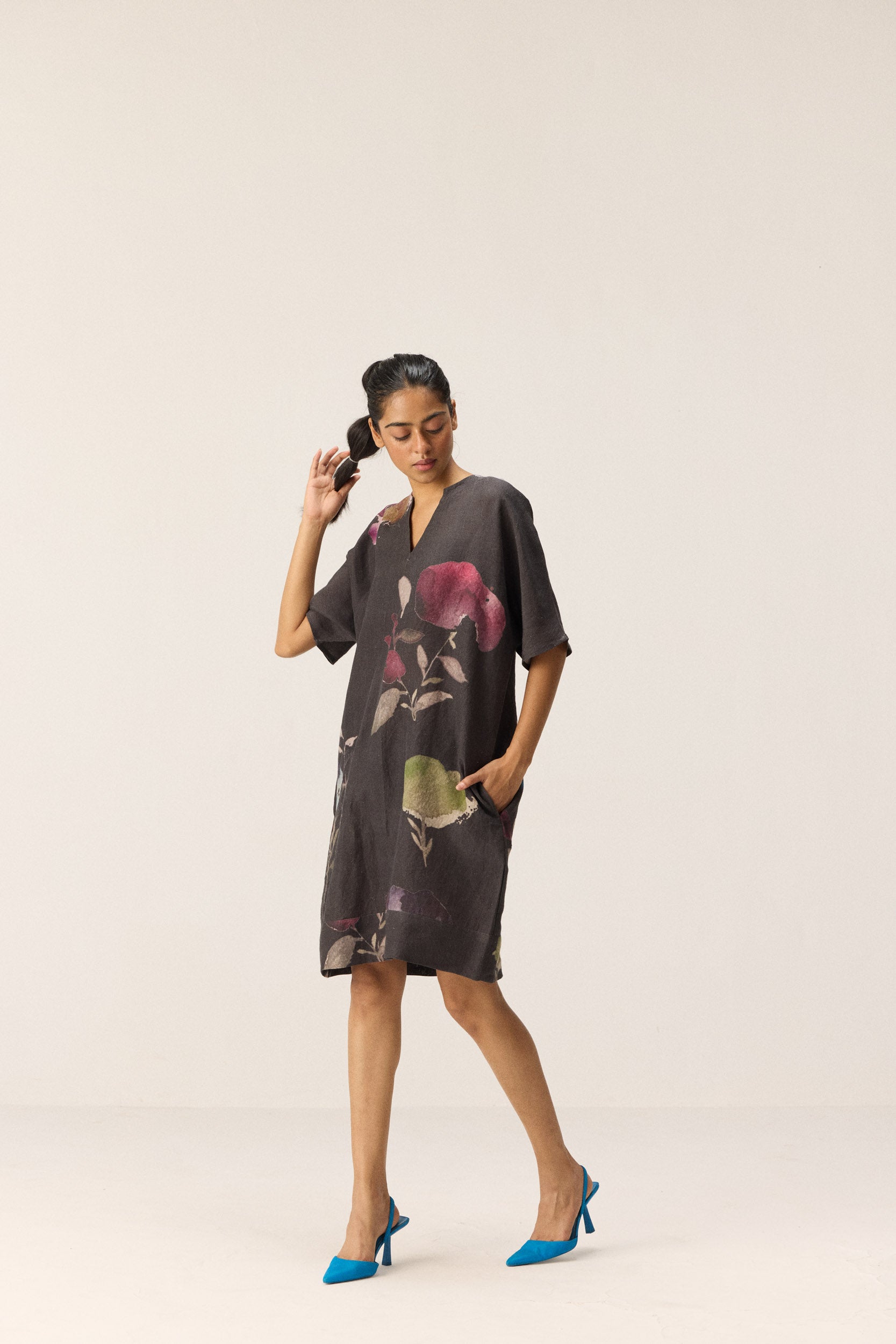 A charcoal black short dress crafted in premium Belgian linen. Designed with a relaxed silhouette, it features a flattering V-neckline and side seam pockets for everyday ease. Effortless, minimal, and made to move with you.