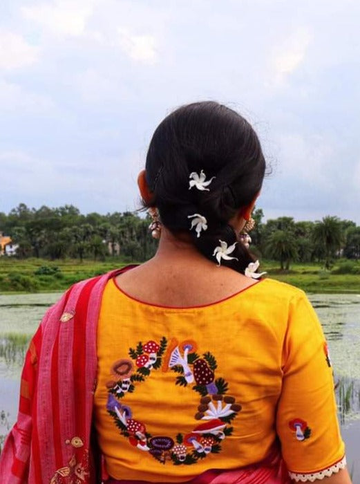 On Yellow Cotton, wreaths of mushrooms and flowers are hand embroidered on the back and sleeves