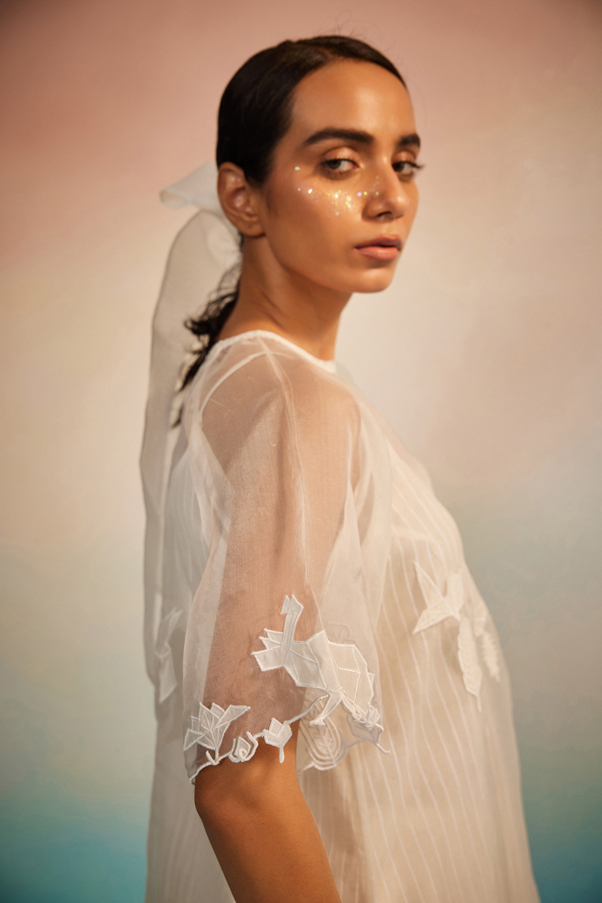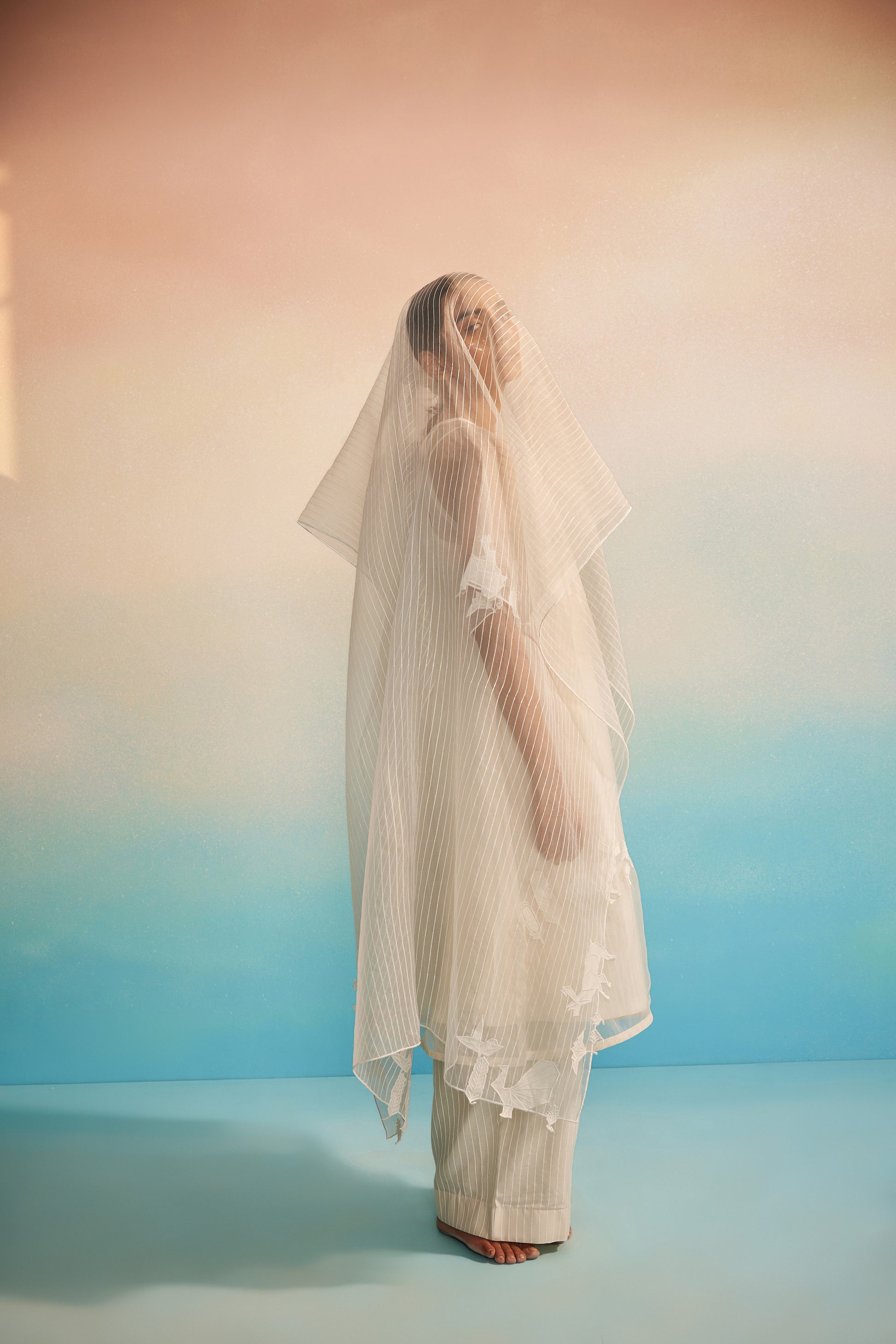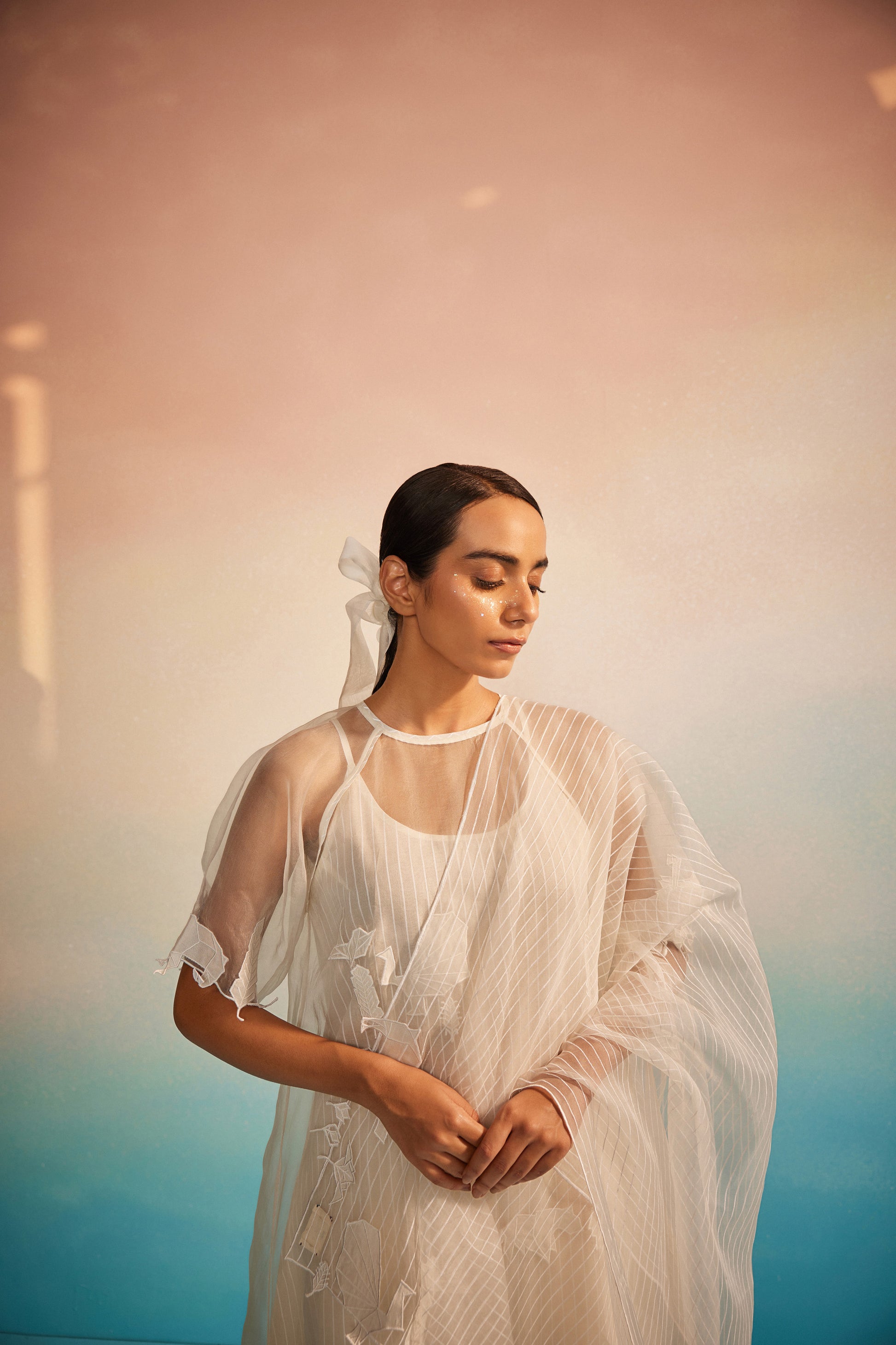 There are pieces that whisper beauty — the Yuugen Kurta is one of them. Crafted in sheer organza and layered over a striped, screenprinted cotton slip, it plays with lightness and depth in equal measure. Appliqué embroidery delicately trails across the surface. The silhouette paired with the Hama Akari Stripe pants and Kessho Organza appliqué Dupatta flows gently over the body, with Raglan sleeves. Weightless yet rich in detail, the Yuugen Kurta is a study in elegance that it simply holds.