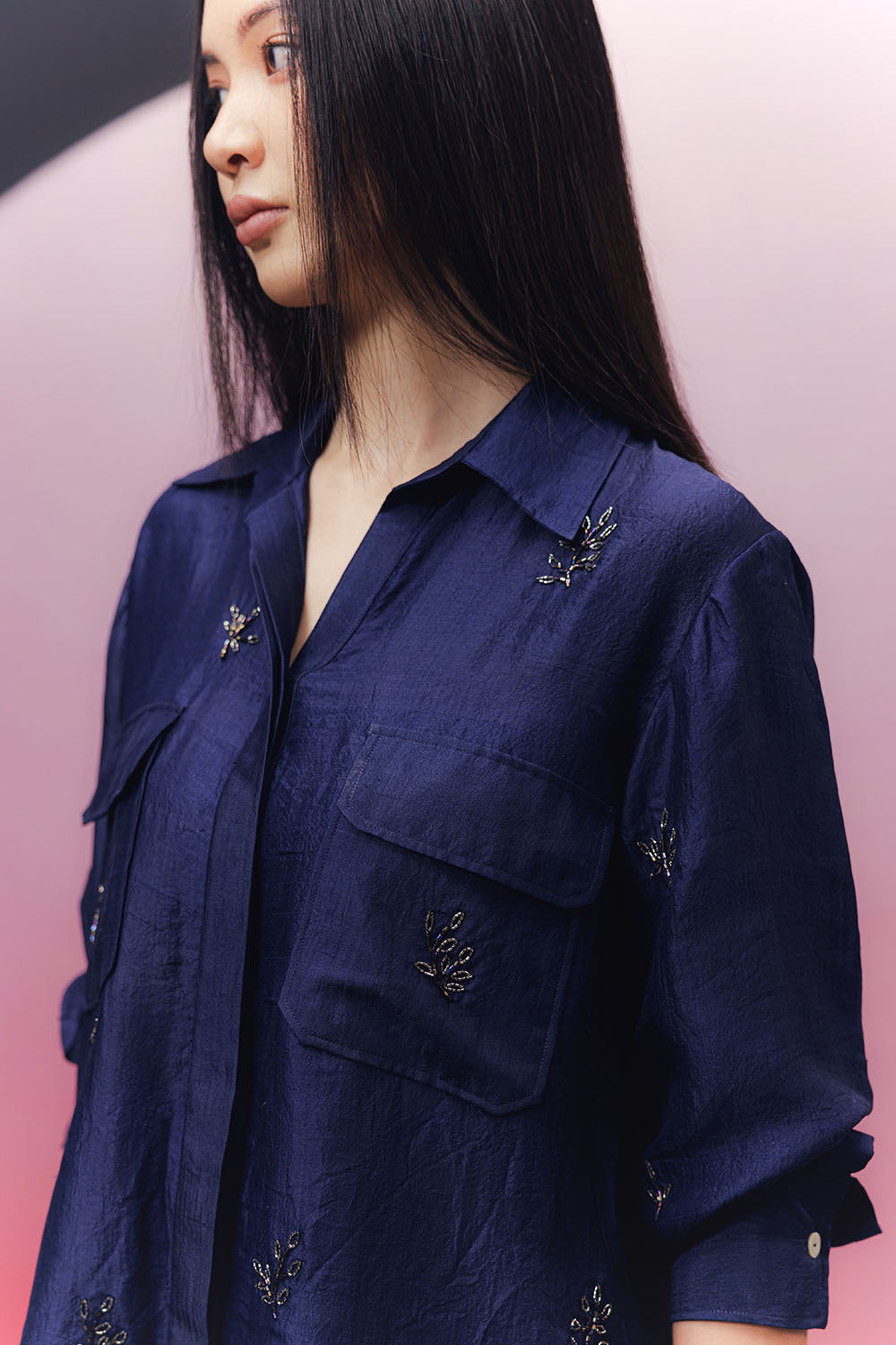Handwoven mulberry silk navy co-ord set with all over embroidered leaf motifs and flap pocket details on the shirt.