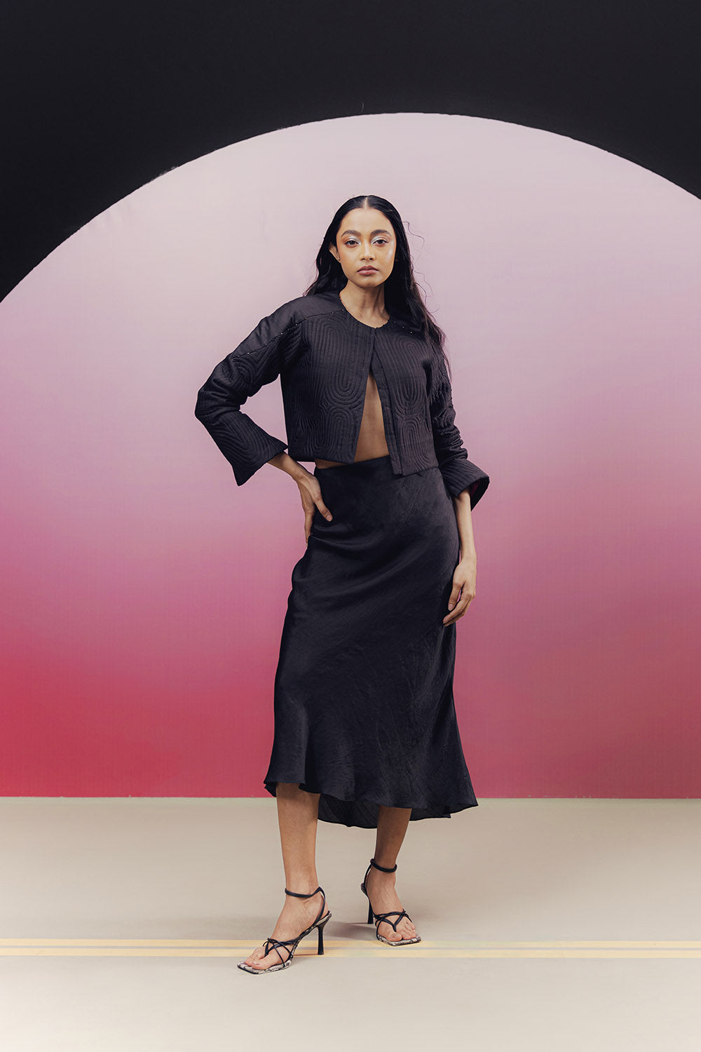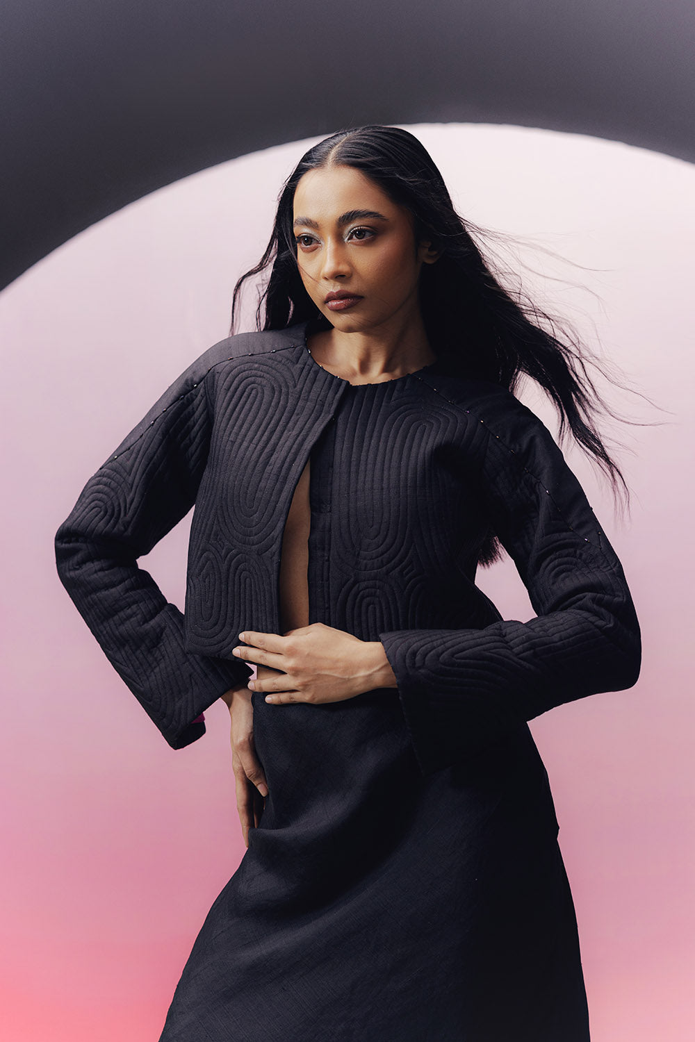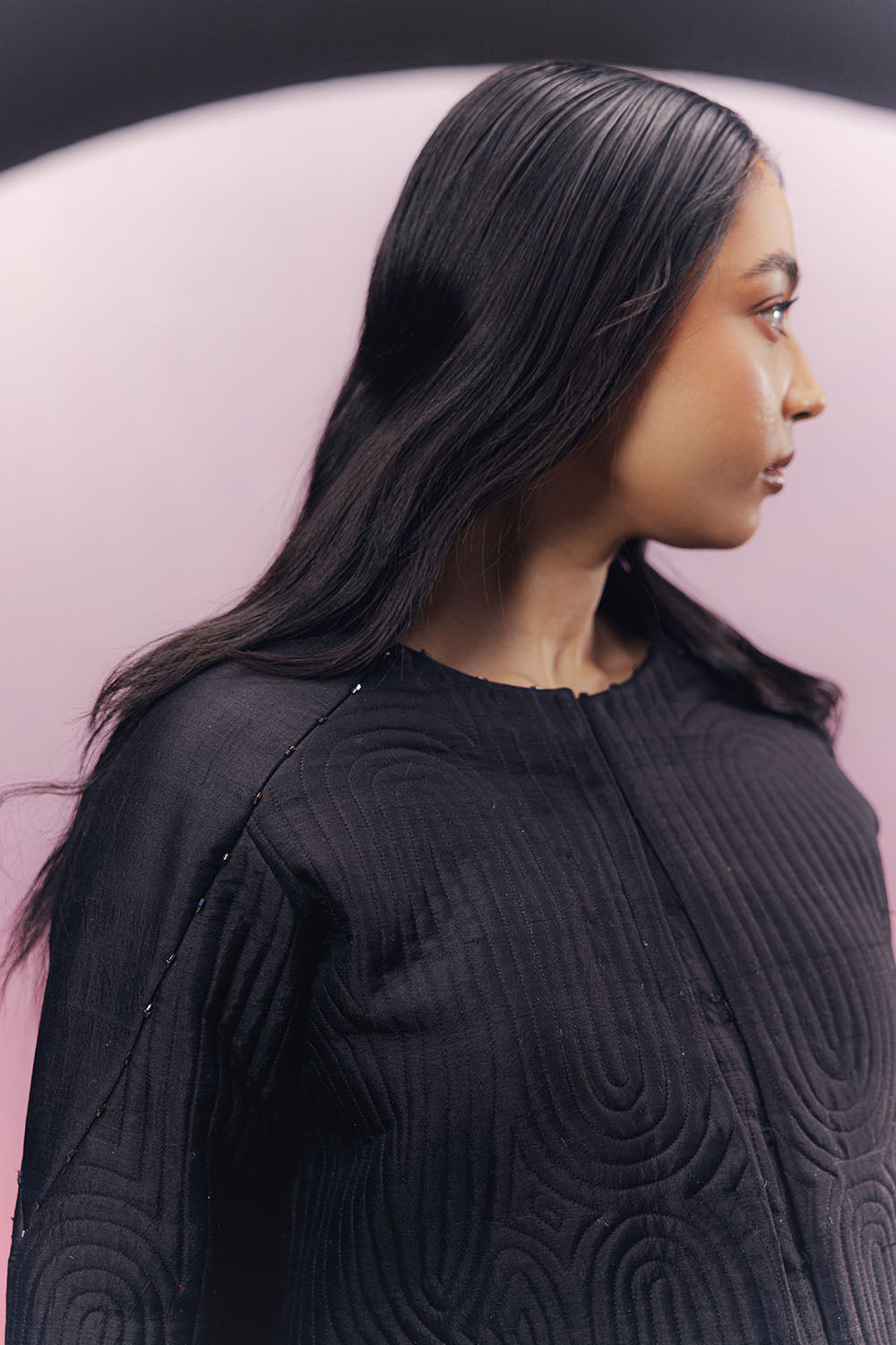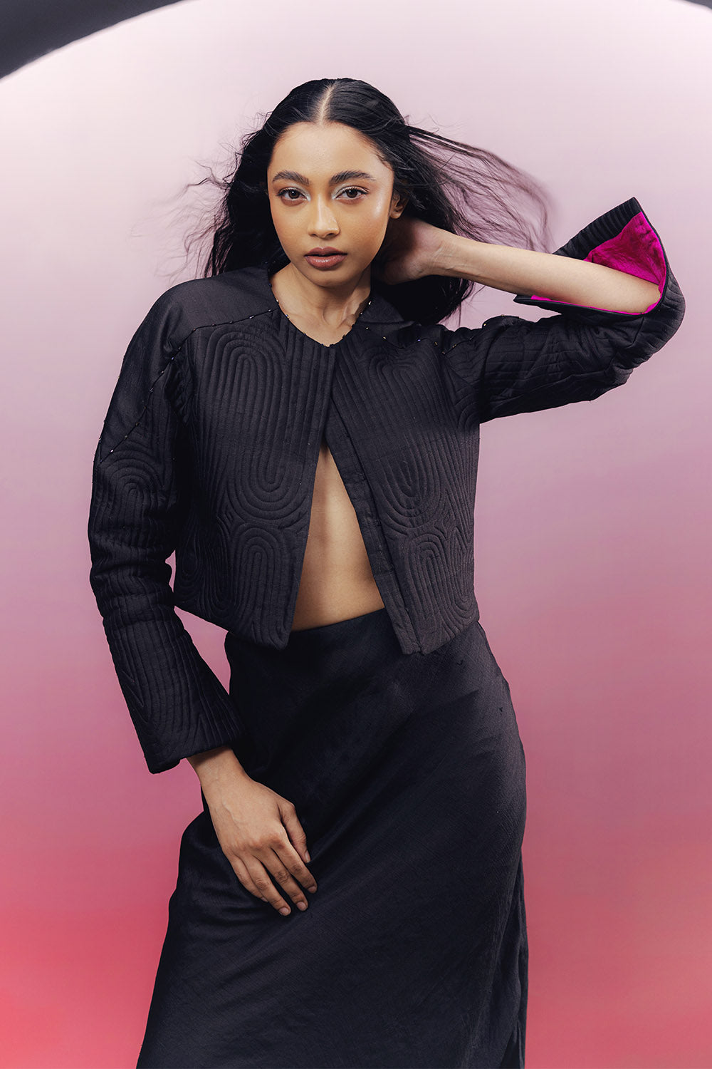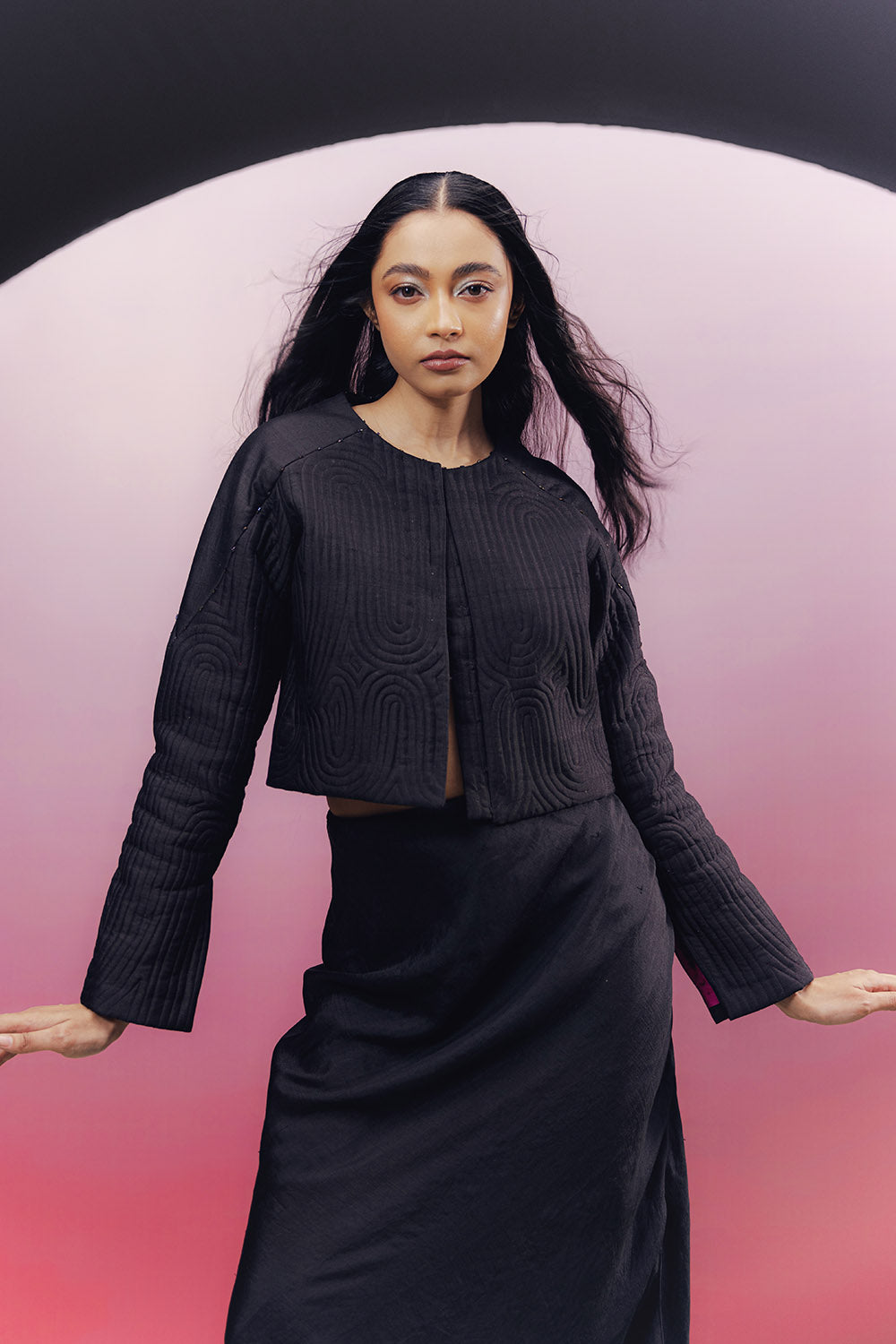 Handwoven silk quilted cropped jacket with contrast lining and a hidden embroidered pocket. The jacket shoulders and neck are highlighted with bead edging.