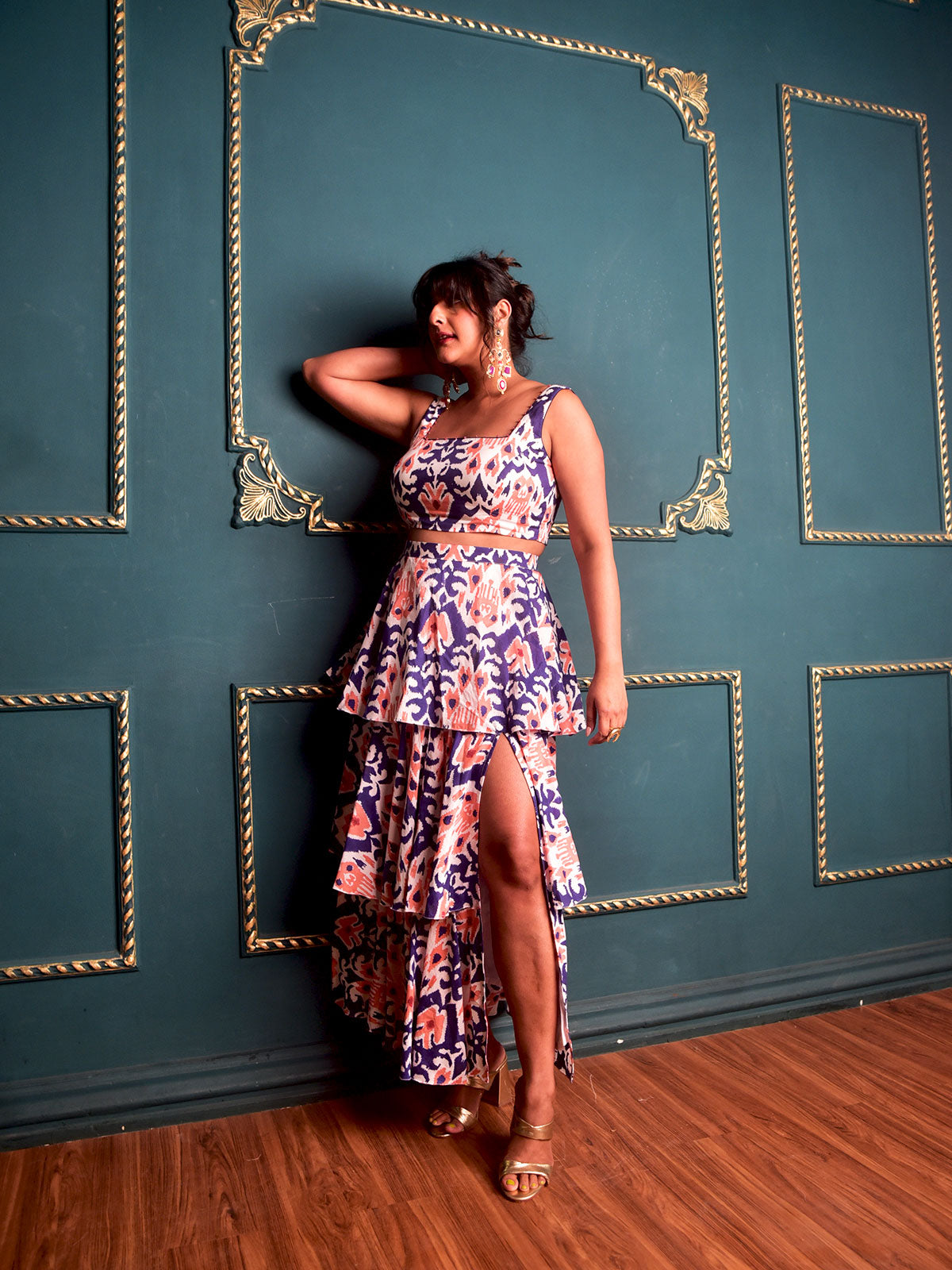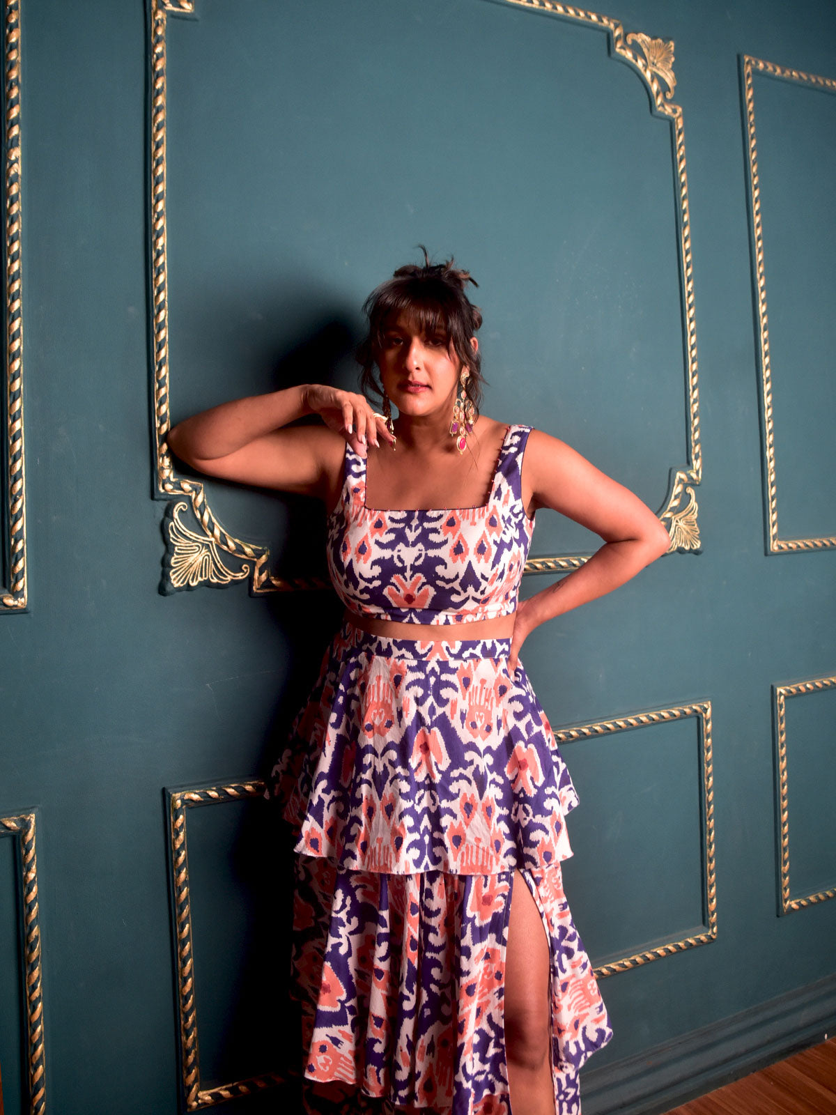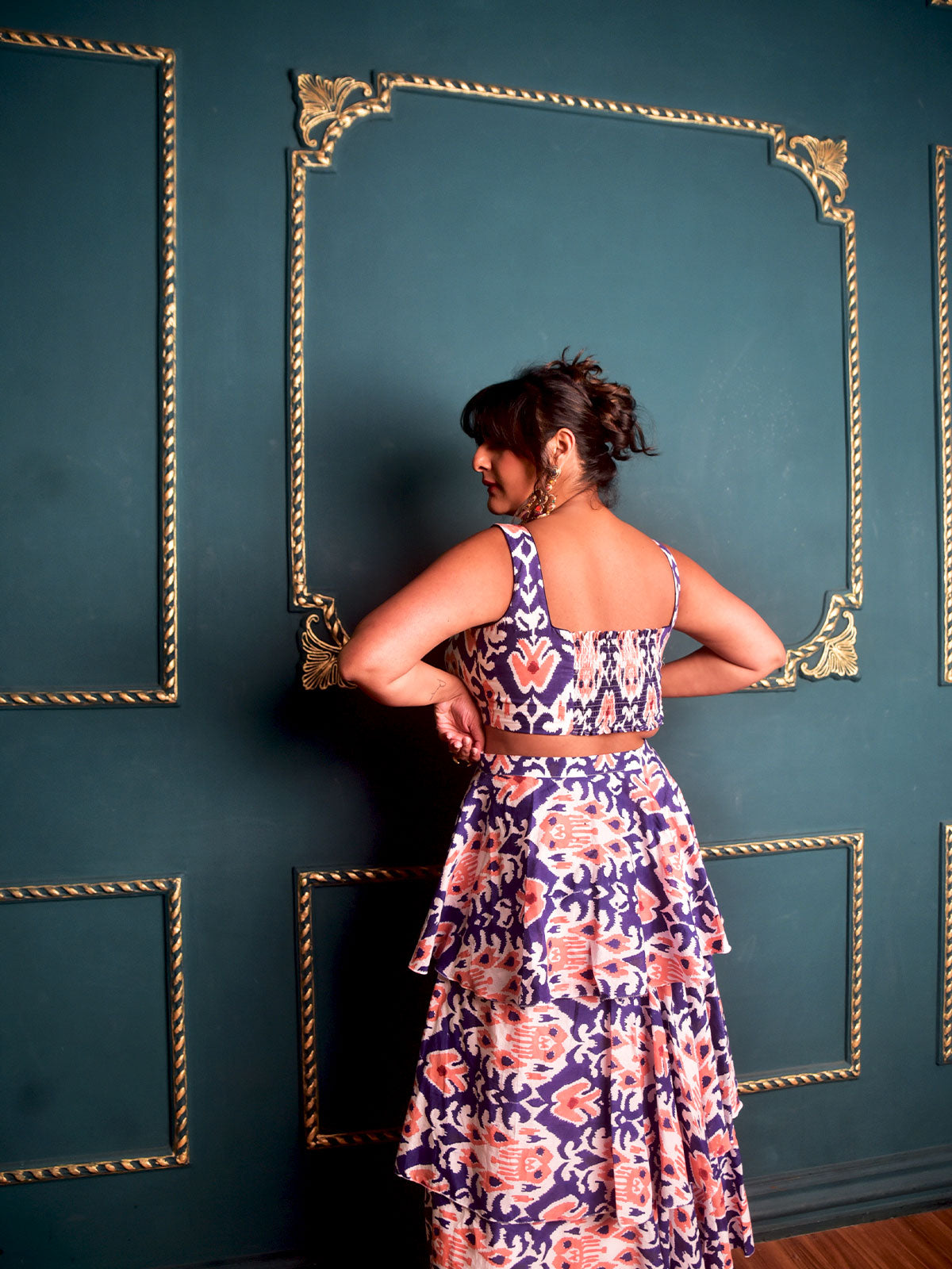 Ruffled with a smoking slit, this skirt is made for the red carpet Cut in our exclusive deep blue, peach and white ikat block-printed cotton, three tiered ikat printed skirt without pockets with a slit in the front.