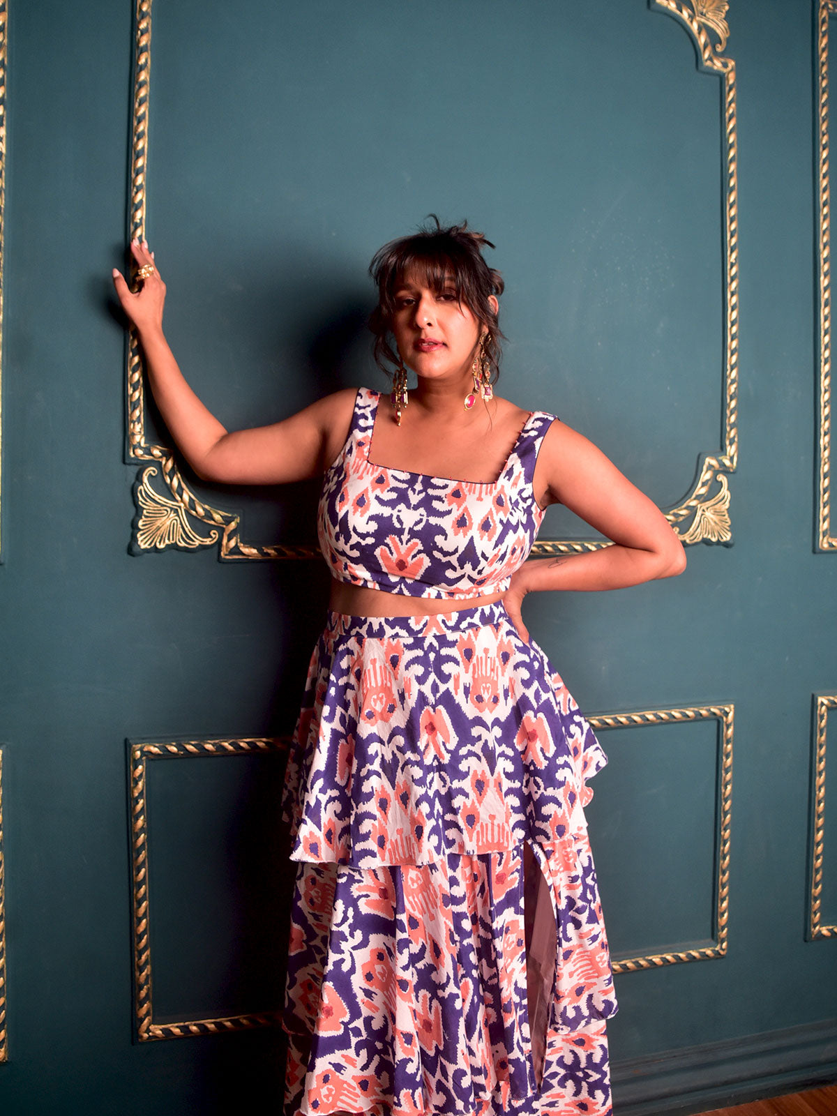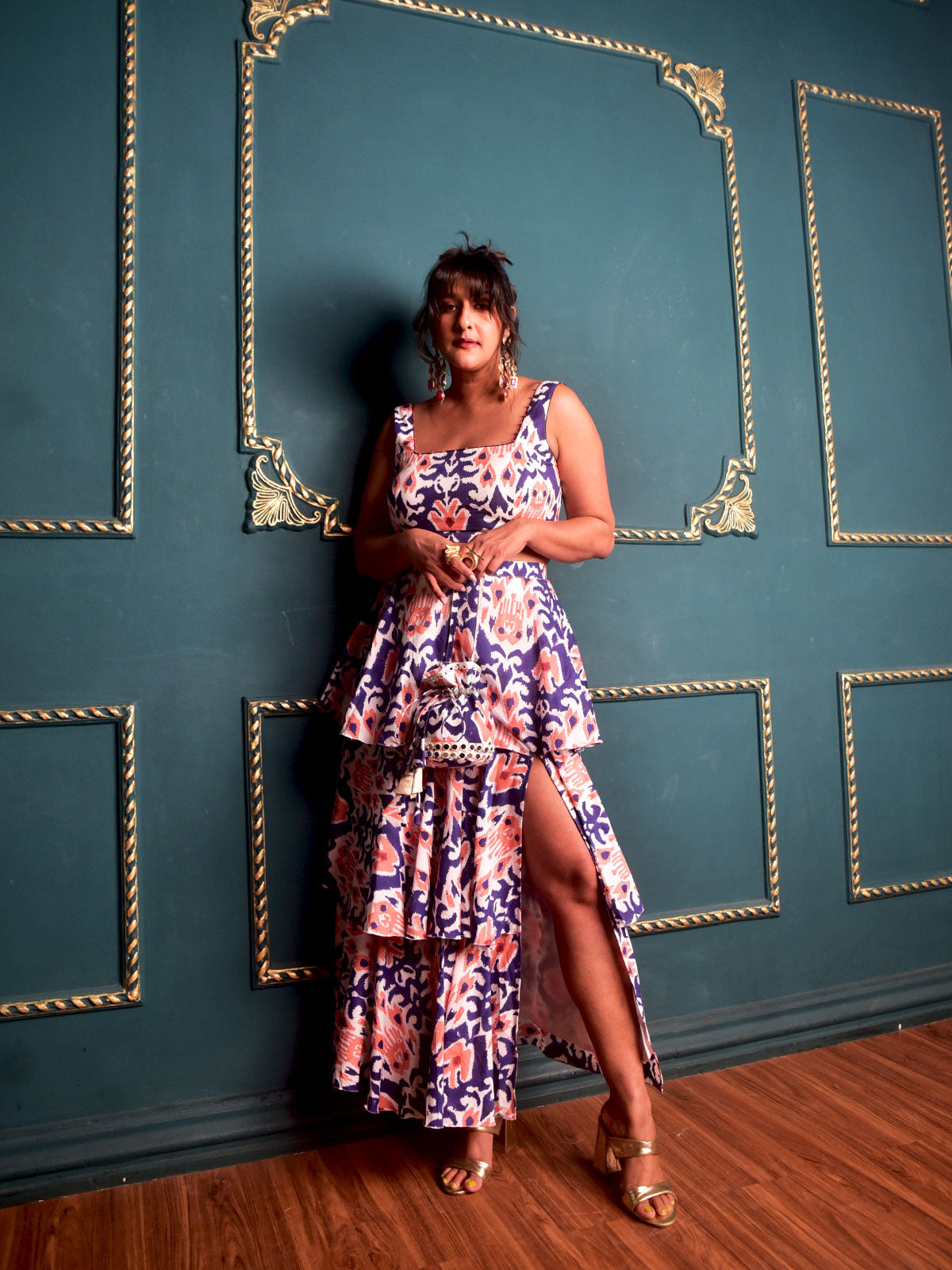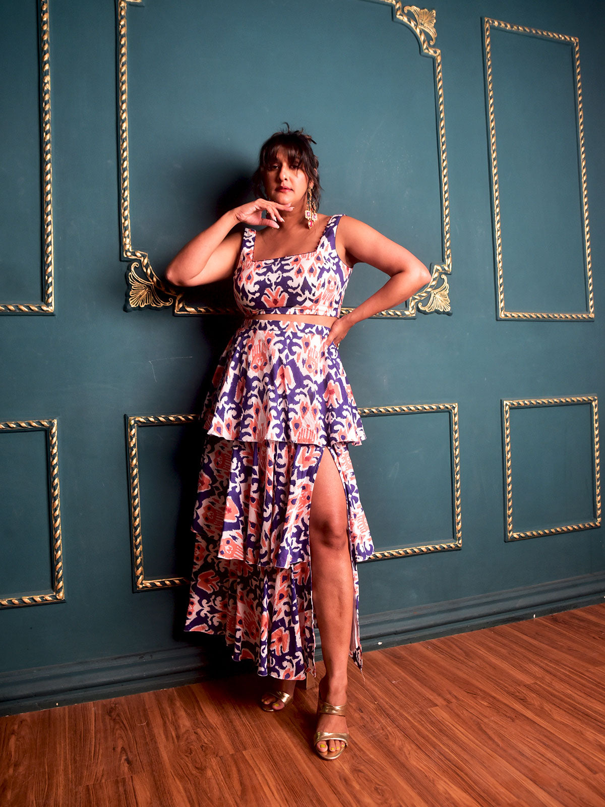 Ruffled with a smoking slit, this skirt is made for the red carpet Cut in our exclusive deep blue, peach and white ikat block-printed cotton, three tiered ikat printed skirt without pockets with a slit in the front.